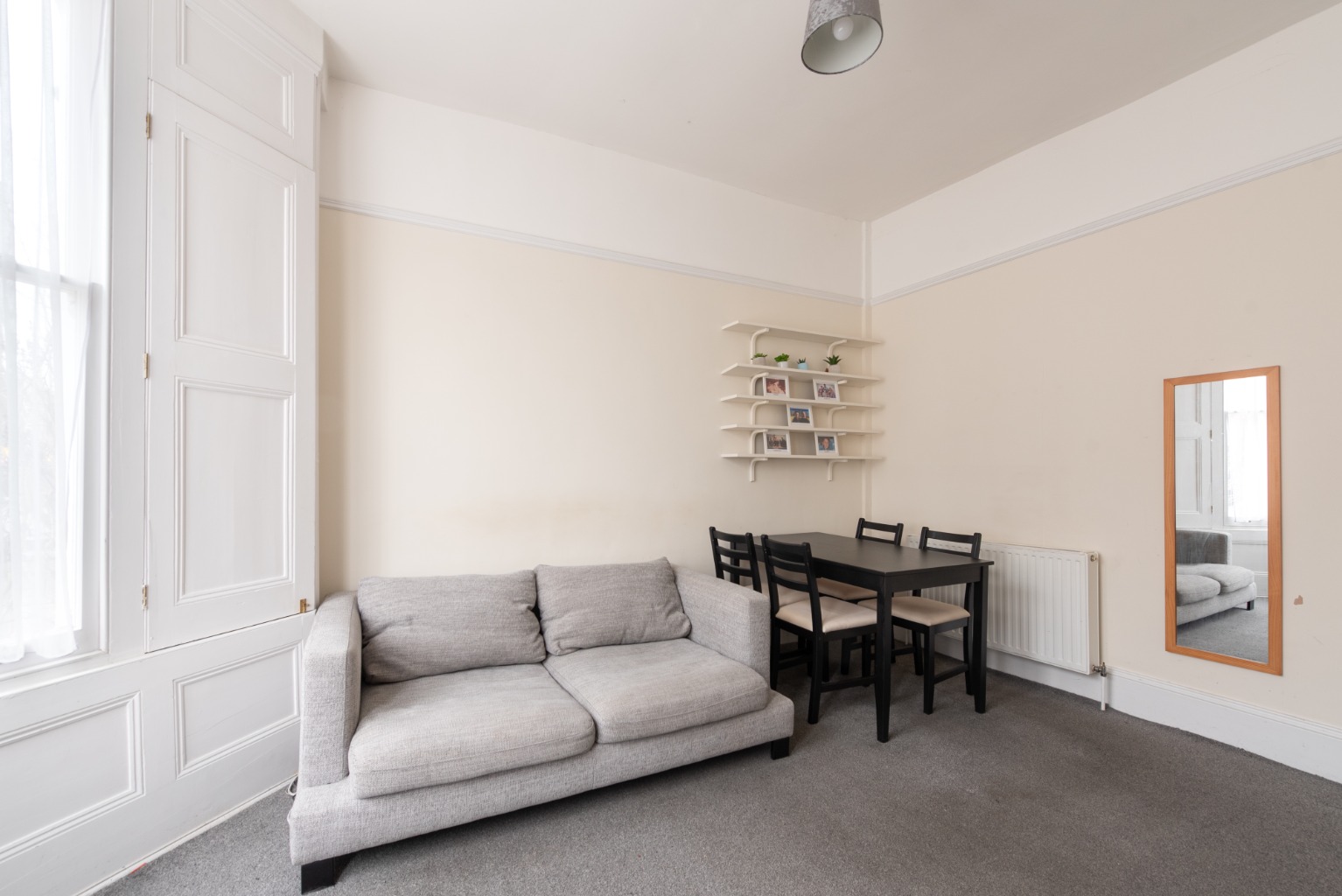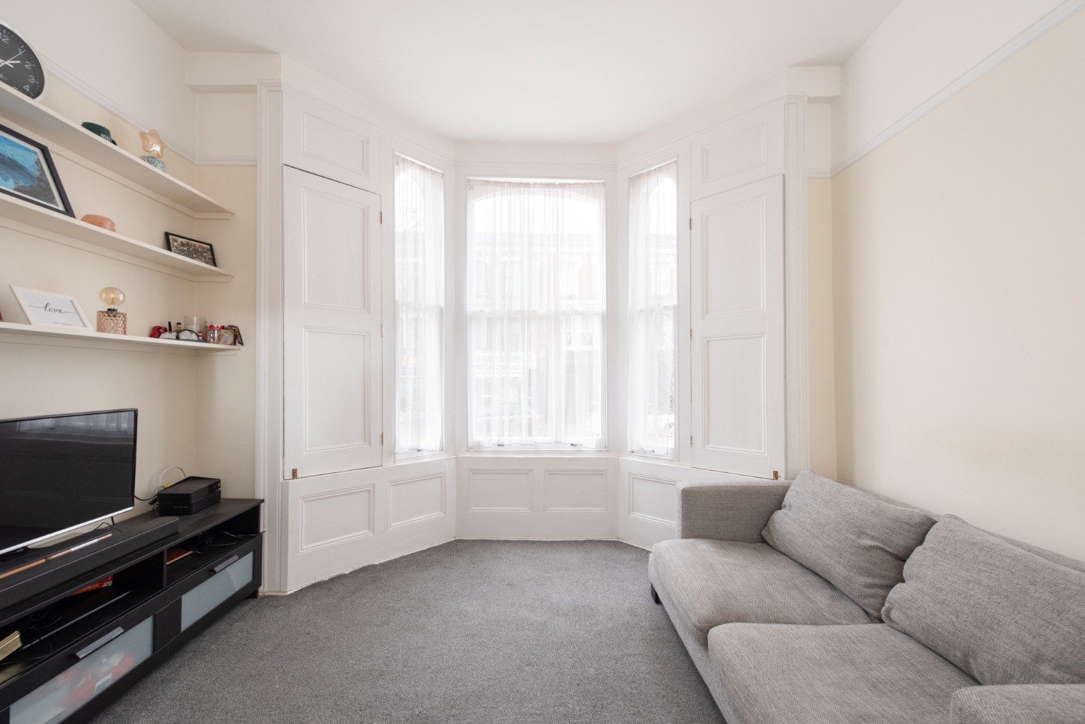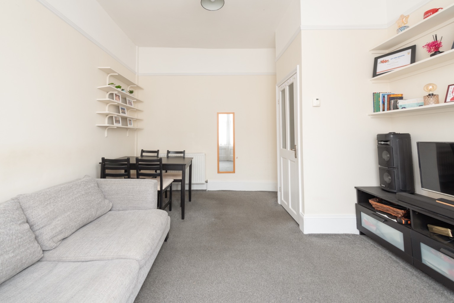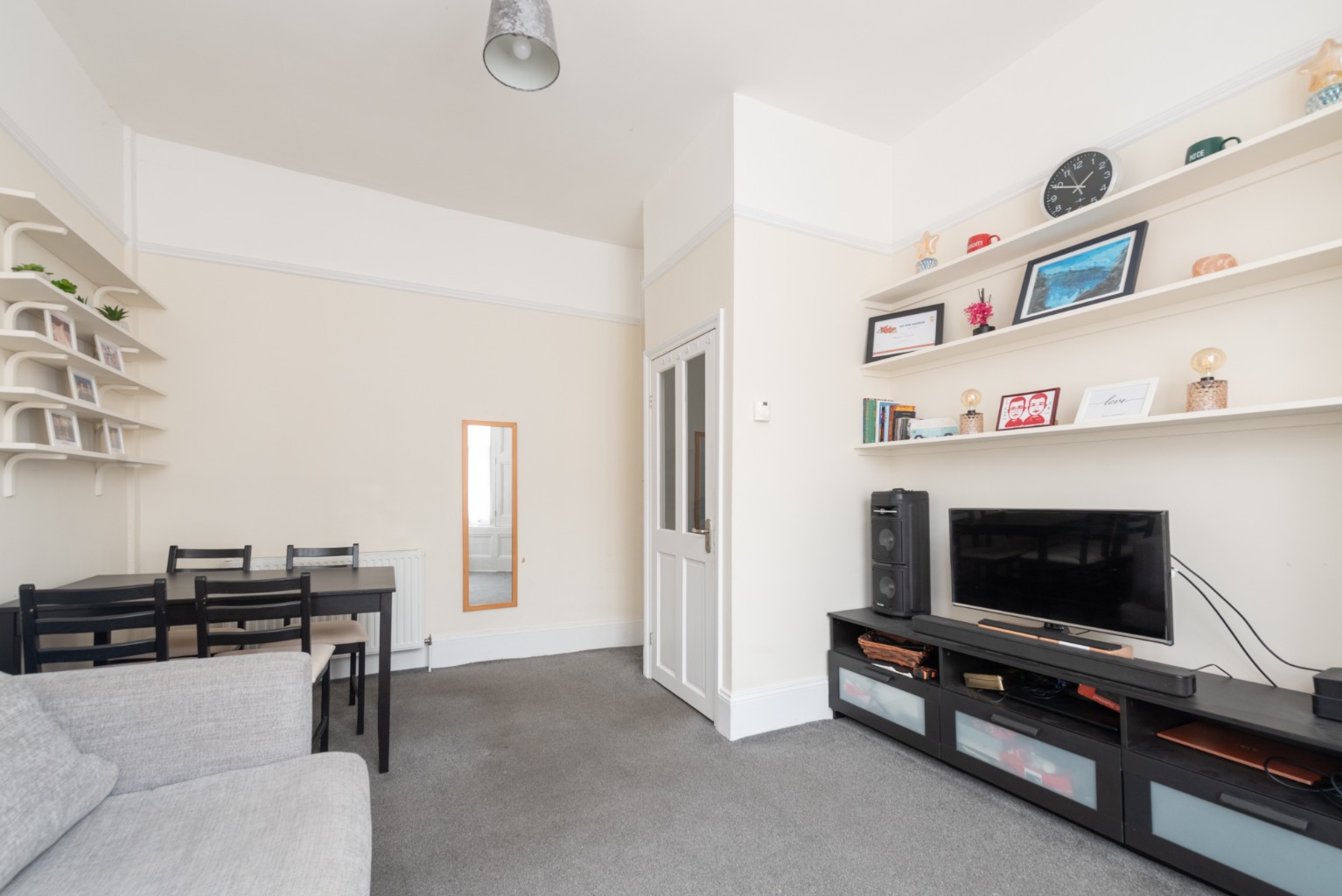 The bright and spacious reception room lies to the front of the property, with a view overlooking the street framed by a charming restored original sash bay window with surrounding original working shutters. With décor in neutral white and cream with grey carpet, plus fitted shelves to two walls, it’s the perfect space to slip right into and make your own. There’s room for a sofa, entertainment unit and a dining table or desk too.