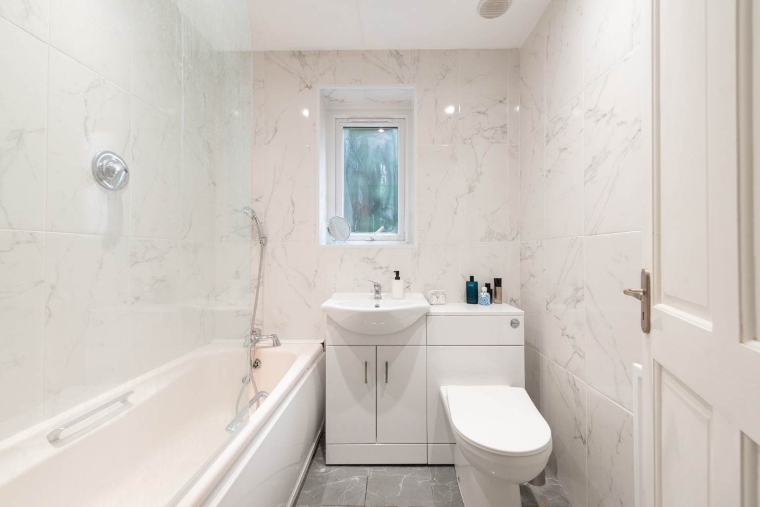 The attractive bathroom is fresh and light, newly tiled in white and light grey marble effect and darker grey flooring. It also benefits from a new sink and toilet combined with a useful storage cabinet, and a bath with fitted shower and screen.