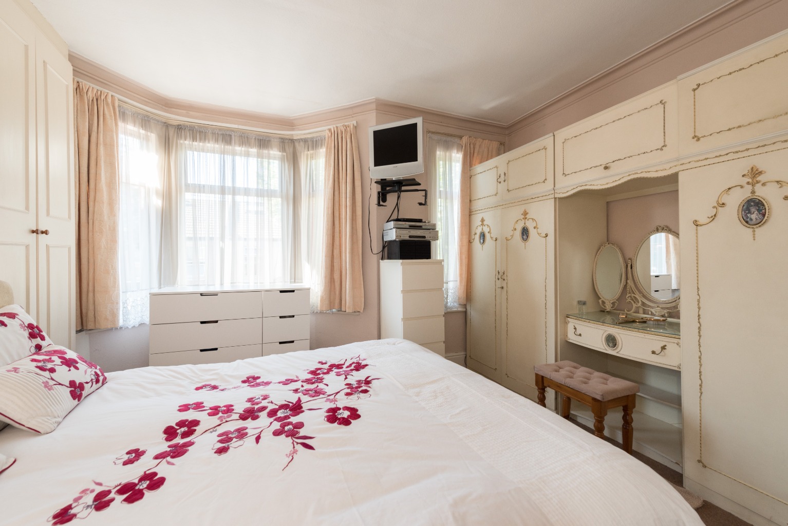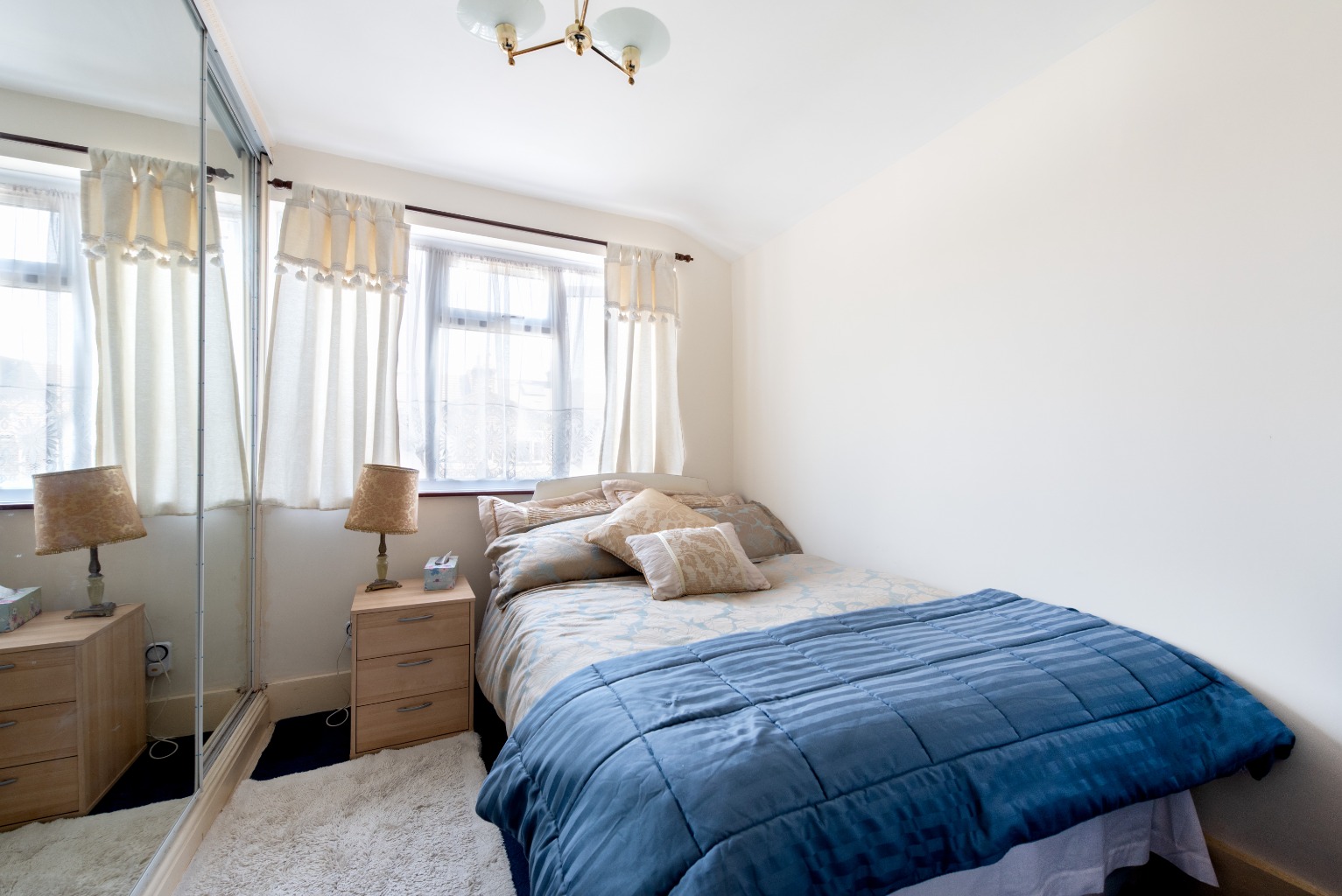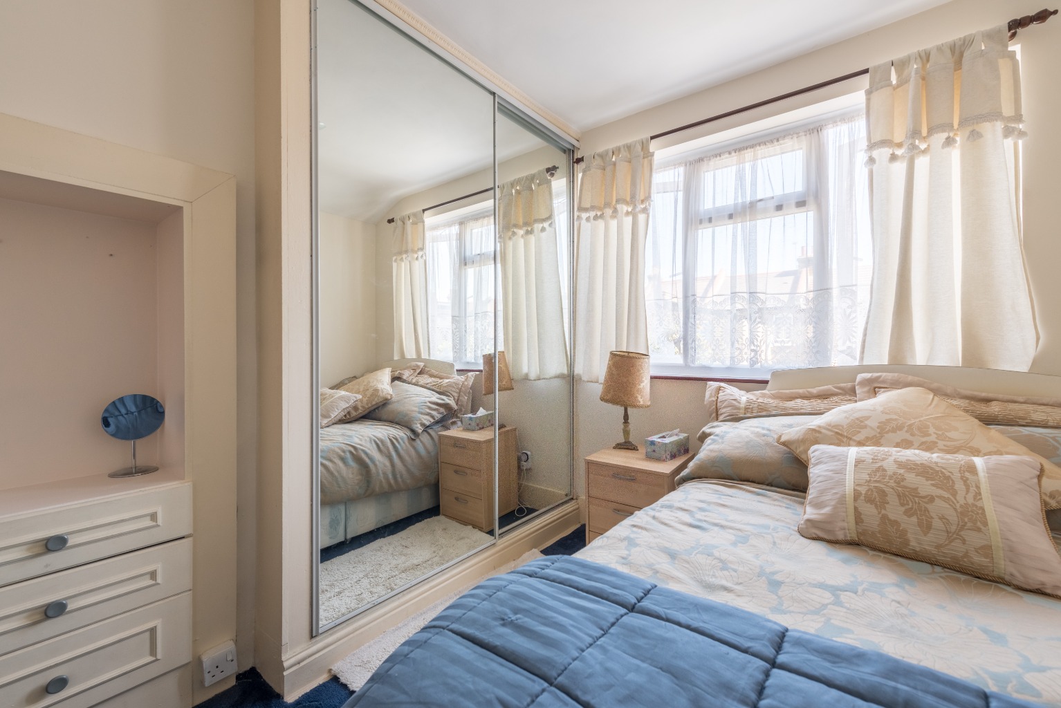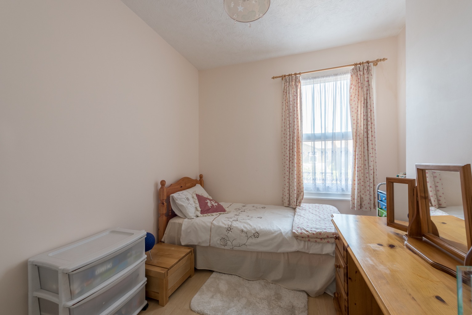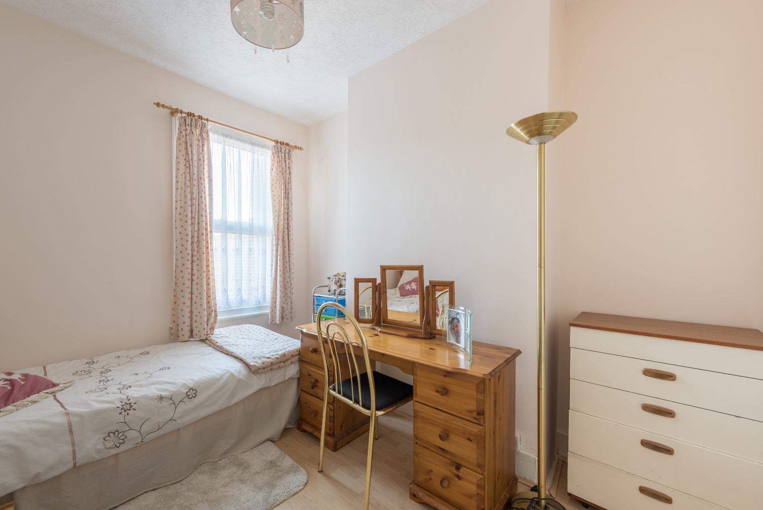 Perfect for a child, teen or even your guests, this rear bedroom overlooks the garden and can happily fit a double bed, or provide more spacious accommodation with a single or bunks. Bright and airy thanks to the light from the window reflecting off the double fitted mirrored wardrobes, there's loads of storage space here. Another brilliant addition is the cleverly built-in vanity unit, complete with drawers and a recessed space for a mirror. Cute and convenient!