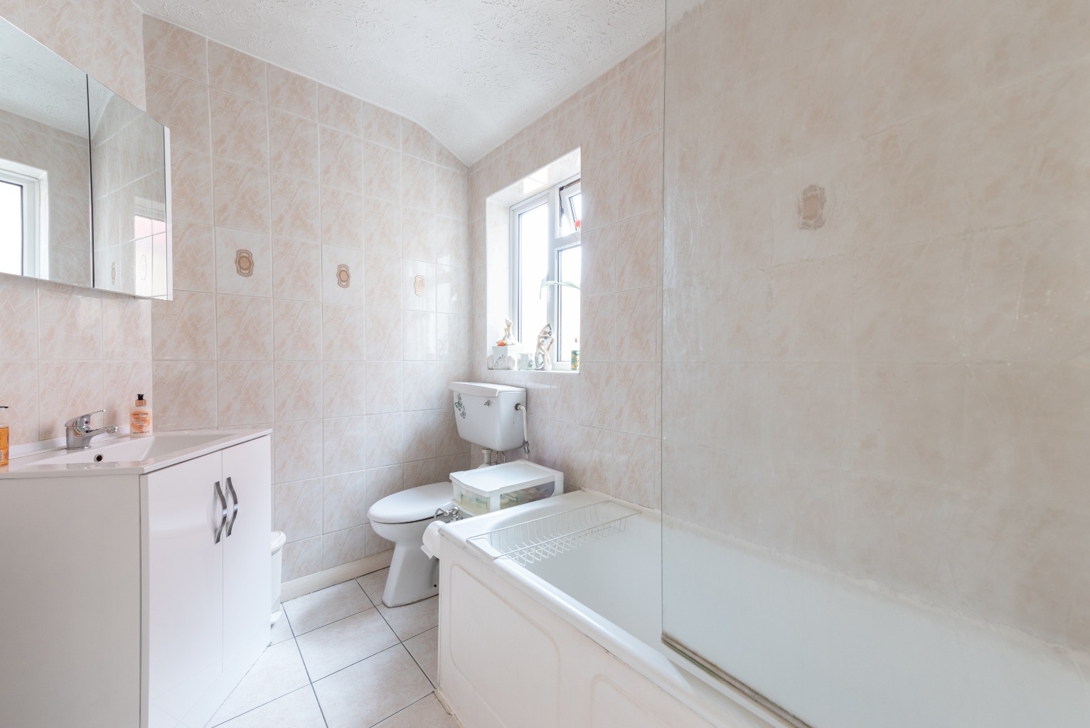 To the left of this room as you face back onto the landing is the fresh, bright family bathroom. Its neutral floor and wall tiles are complemented by the white three piece suite, which includes a sink and cupboard combo and an over-bath shower.