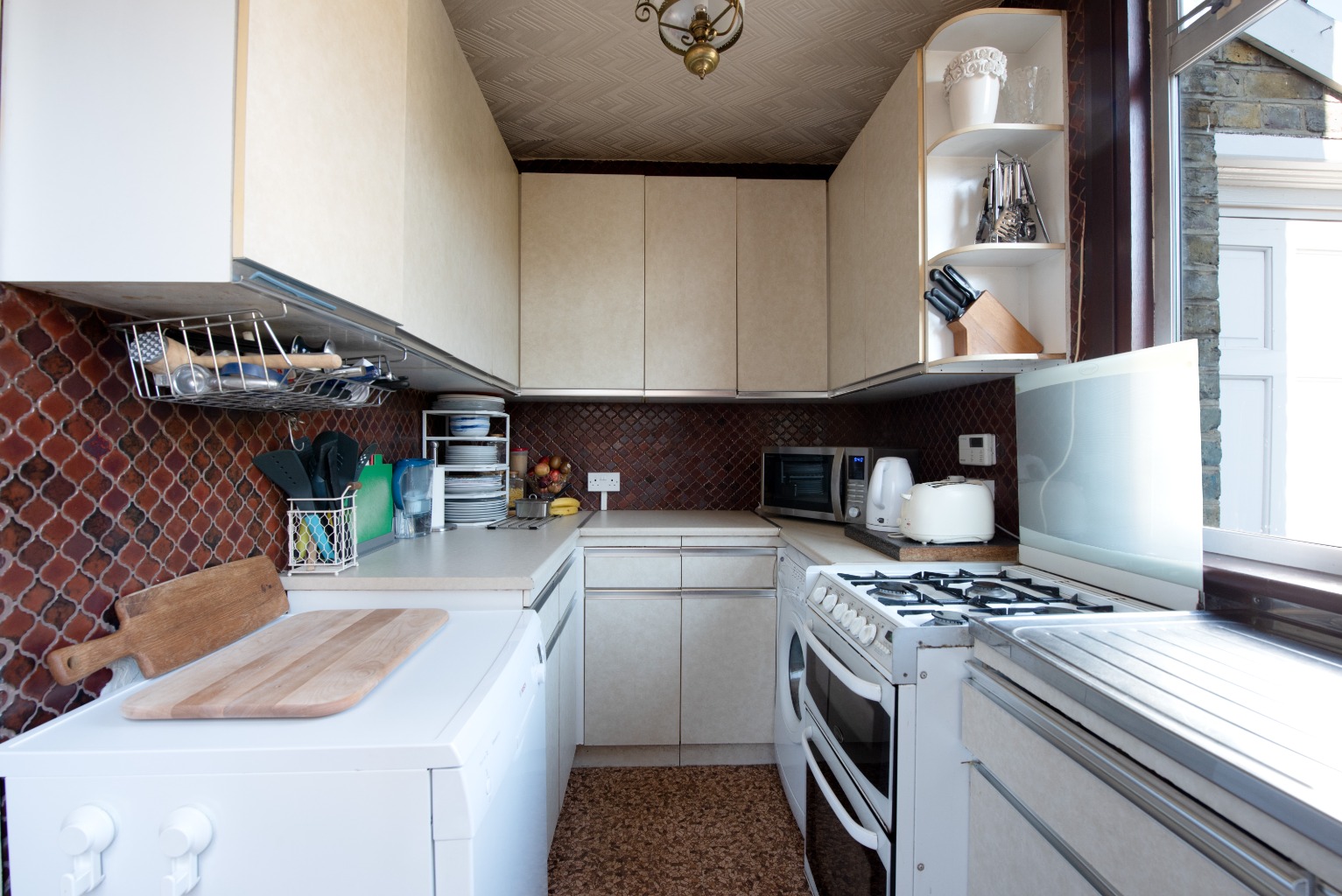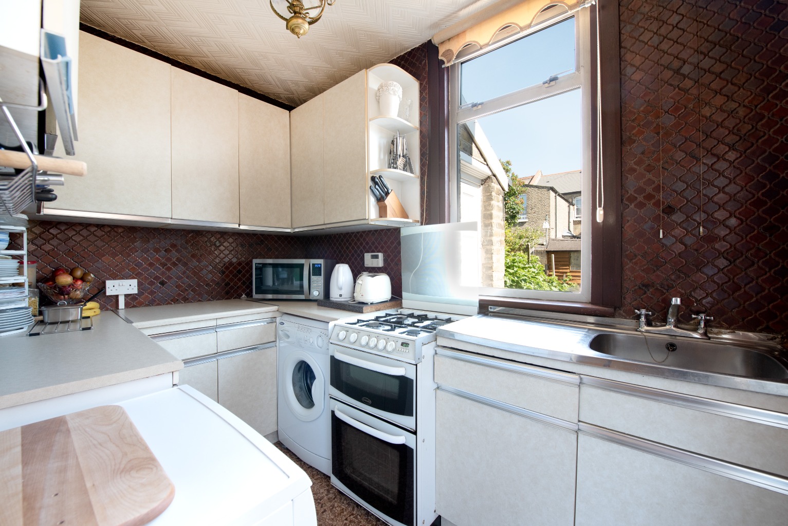 Lying to the rear of the property and overlooking the garden, the kitchen area is fully fitted and offers a ready-to-move into space – although if the retro feel isn't for you, you may want to consider updating this area in time. There's a fantastic number of units and plenty of workspace, and the dark red tiles set off the beige unit fronts well.