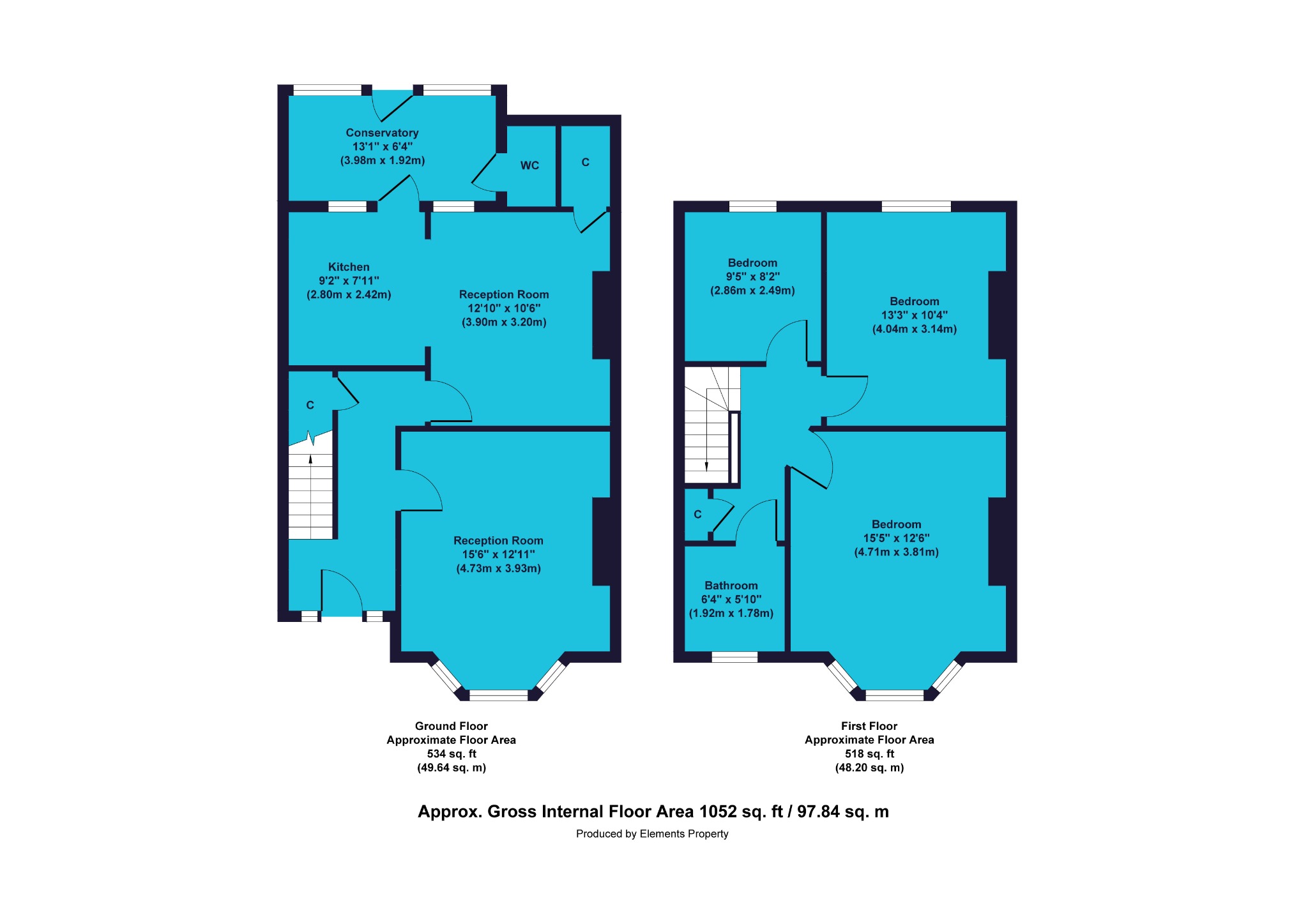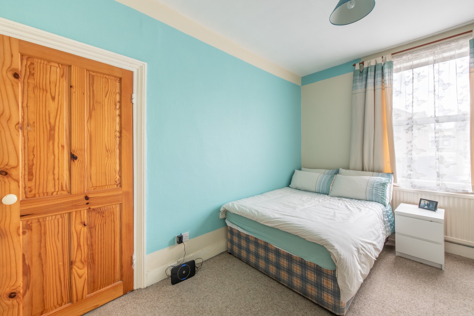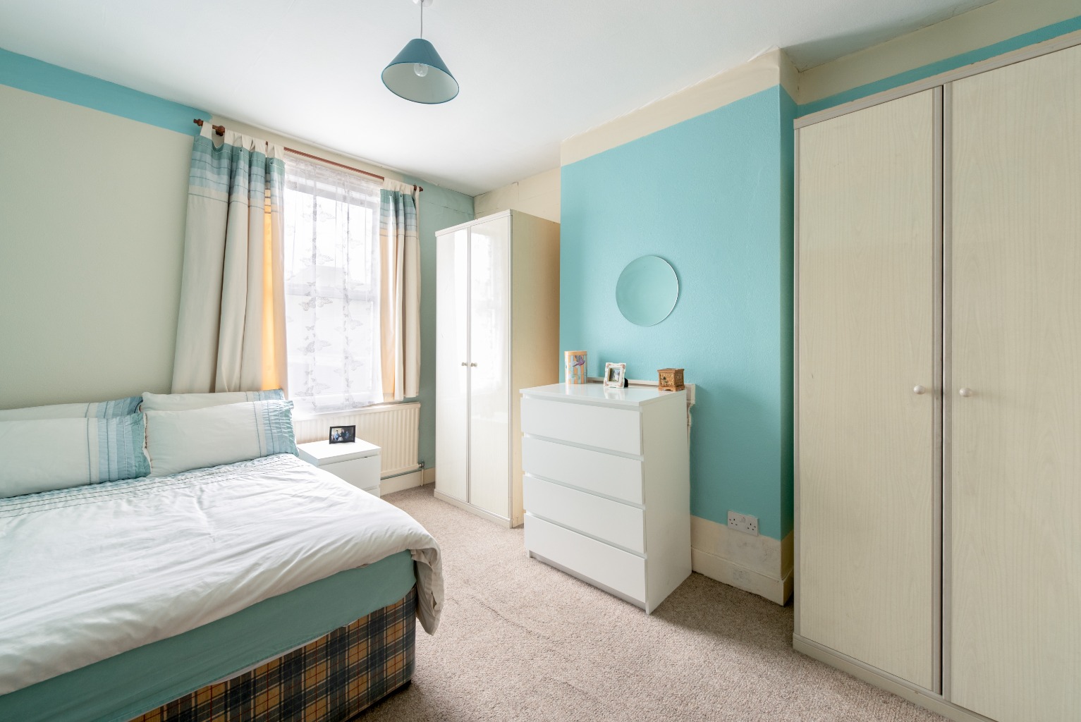 Next is the second bedroom which is another very good sized space and would easily take a double bed, bedside tables, storage units and a dresser. There’s also a good sized window looking out onto the garden, and apart from the painted turquoise walls (which would be easy enough to repaint), it offers a totally blank space for you to work out how you wish to furnish and finish it to get the most from its footprint.
