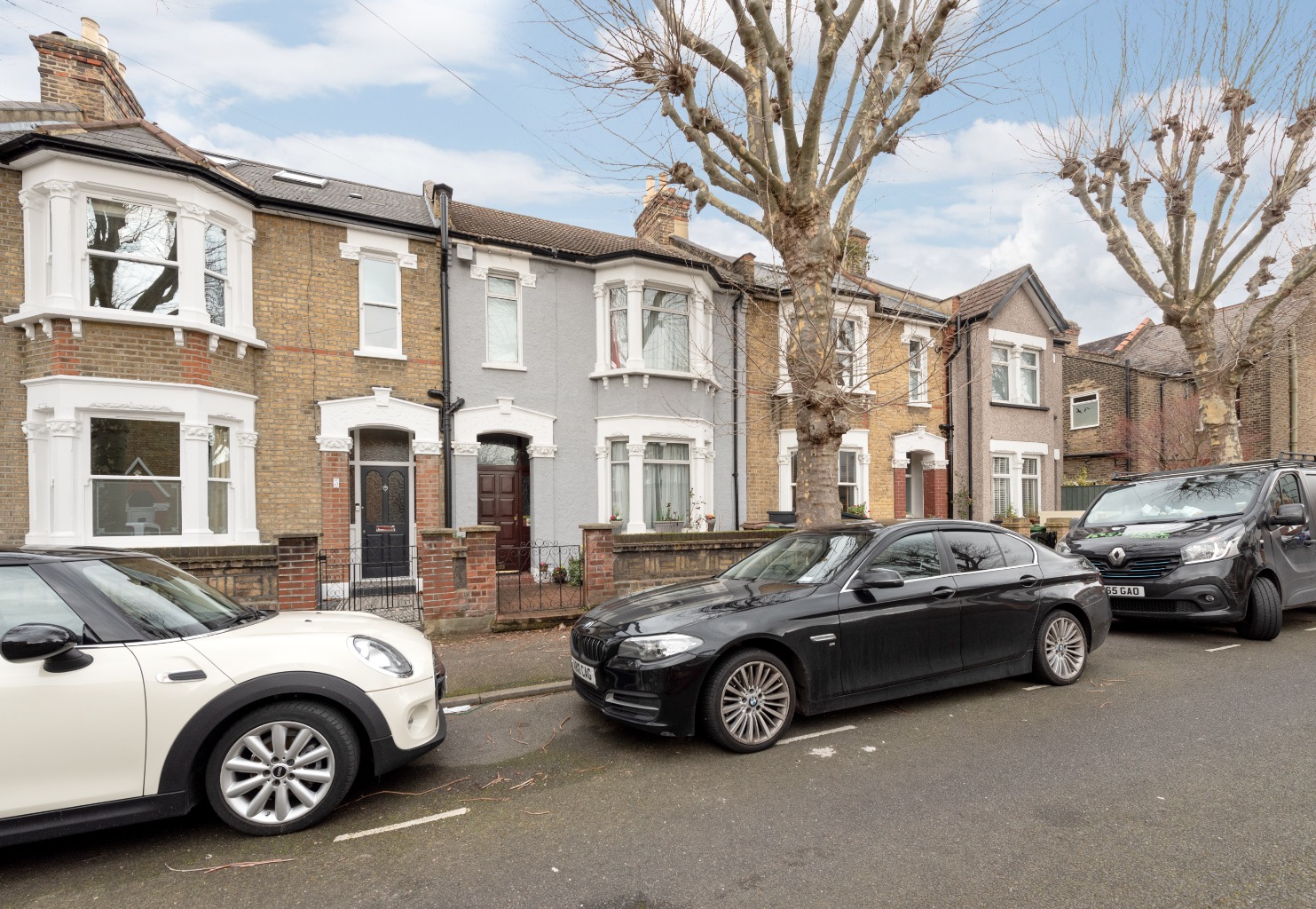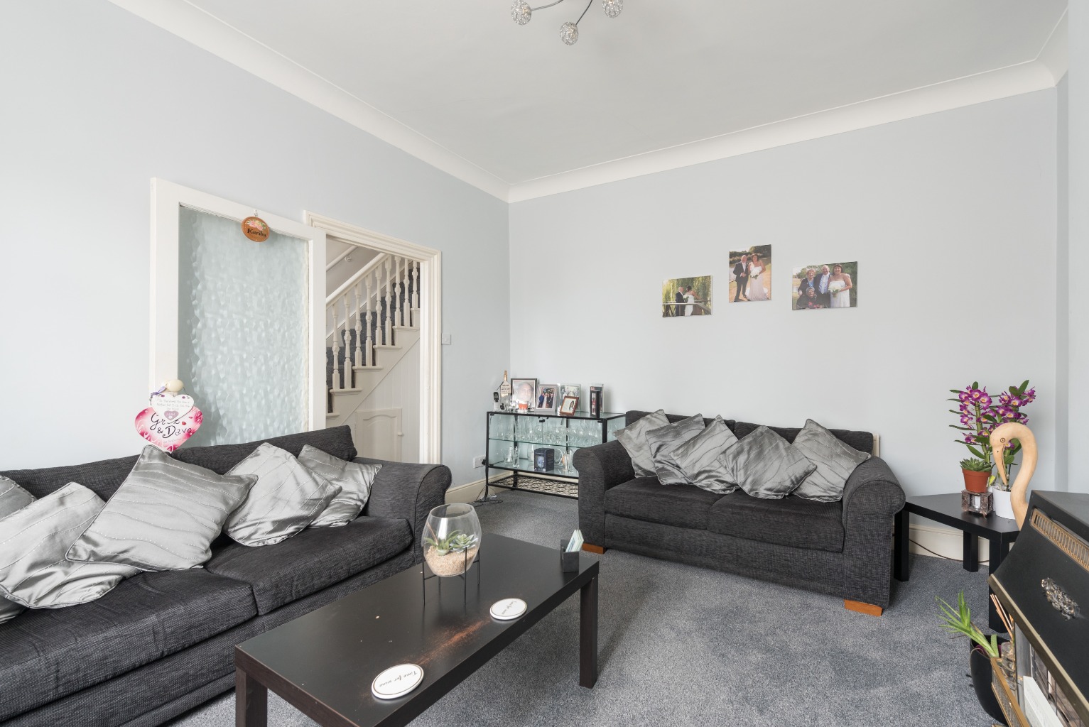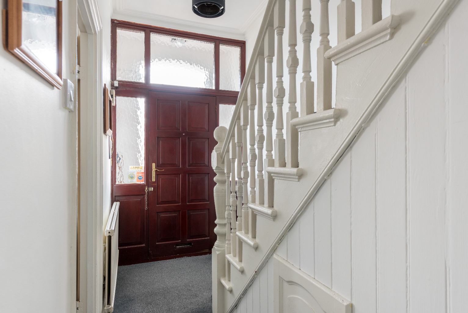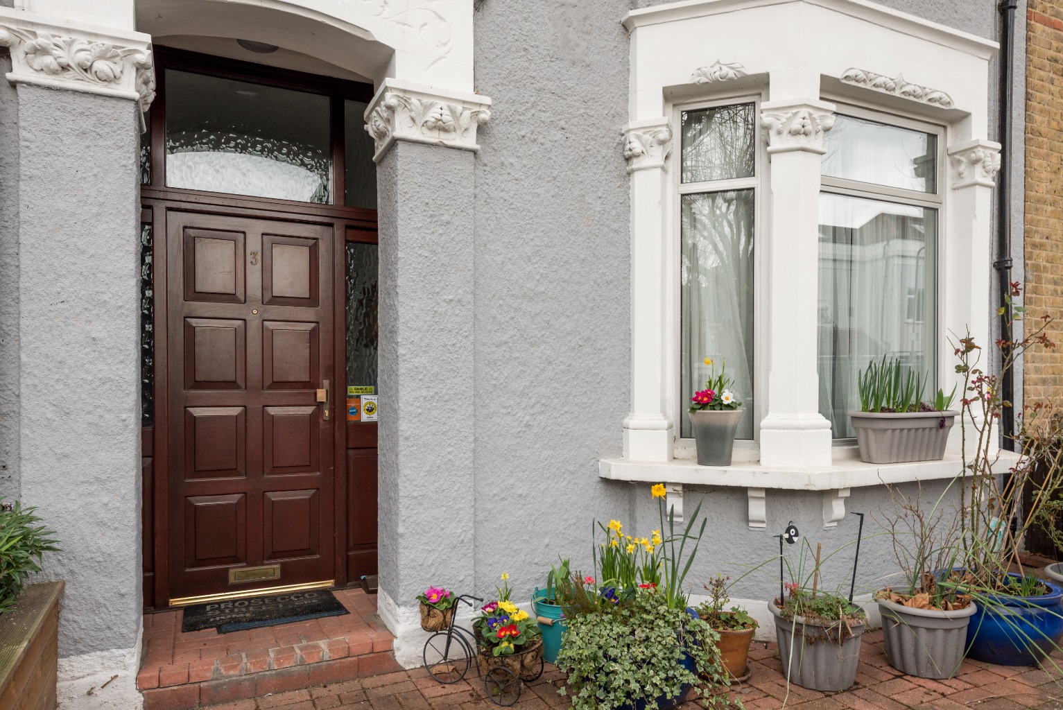 As you approach the house, you’ll notice that the facade has been painted a smart but subtle light grey colour, helping to set-off some lovely features such as a handy recessed porch area, a brick-paved front yard, and gorgeous original decorative plasterwork around the door and windows.