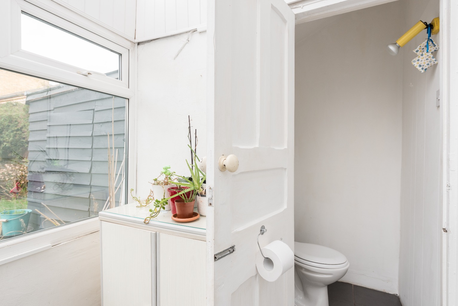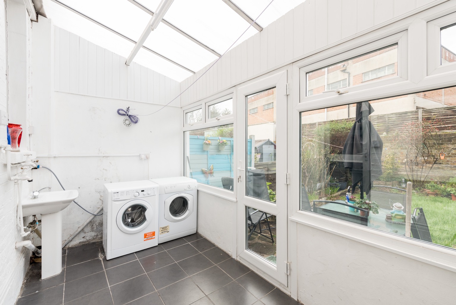 Yes, this property also comes with a conservatory – currently being used as a utility room with its own sink and room for a washer and drier. The grey tiling on the floor pops nicely against the bright white surroundings and with or without laundry appliances, there’s still room for seating in here to enjoy a little sun shine and a coffee on a Sunday morning – it could even make a nice little office space tucked away at the back of the house. There’s also a small downstairs toilet adjoining the conservatory, a handy addition for any busy household.