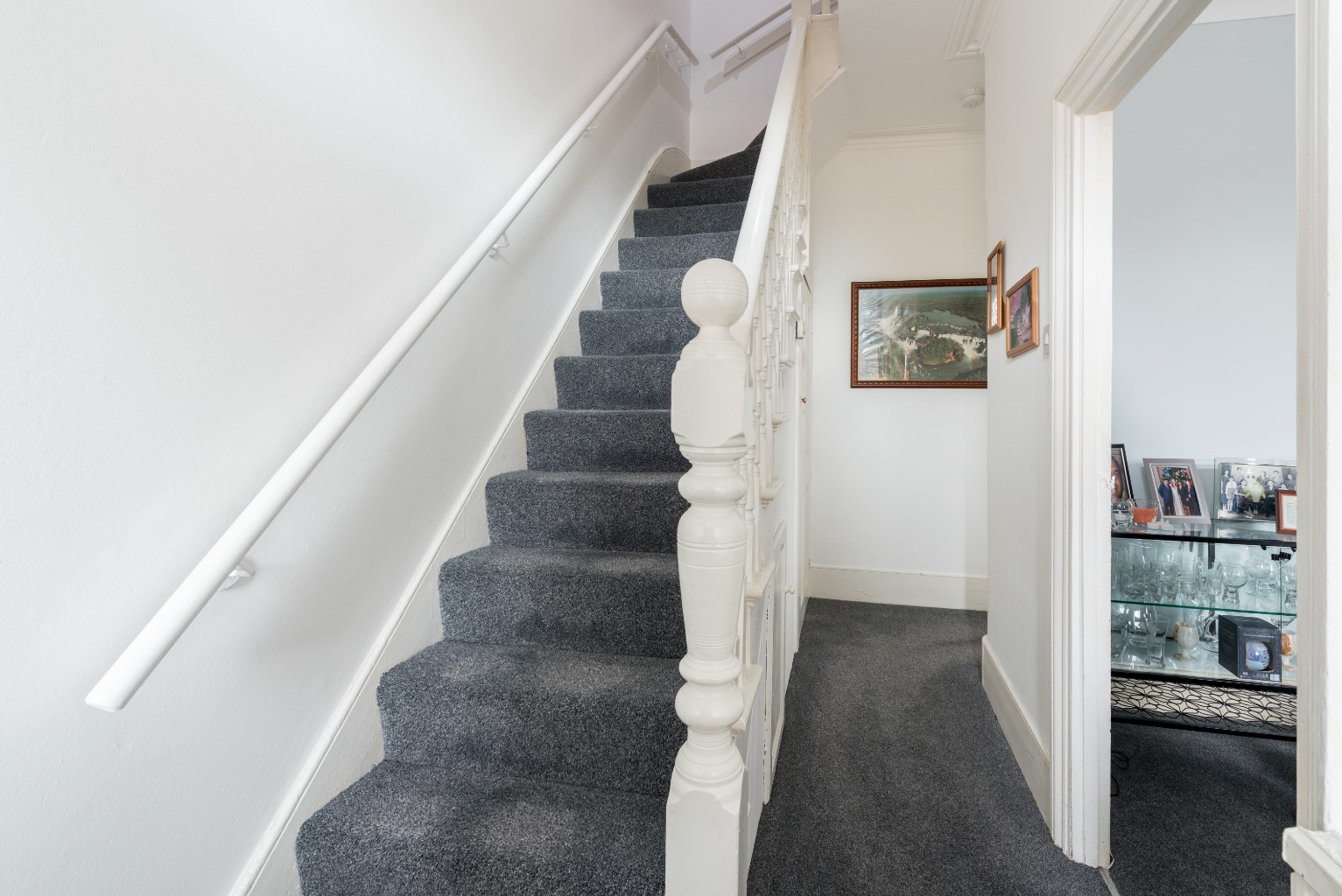 This front-aspect reception room offers a luxuriously thick plush carpet in a mid-grey and the neutral complementary colour palette of the decor means that it would be super easy for you to put your stamp on it. The generous dimensions of this space are further accentuated thanks to the light flooding in from the large bay window, creating a truly fresh and relaxing atmosphere that has lots of scope to set it up exactly as your needs dictate. Its footprint will easily accommodate for a large suite or even two sofas, coffee/occasional tables, display units, bookcases or shelving... a beautifully decorated blank space ready for your ideal configuration. There’s a gas fire on a small brick hearth set into the chimney breast, and shallow recess either side which you could use for display or storage purposes, or to house your home entertainments. As you head back into the hallway, you’ll also note the fully glazed door, which is a fantastic addition to help maintain the lovely sense of natural light.