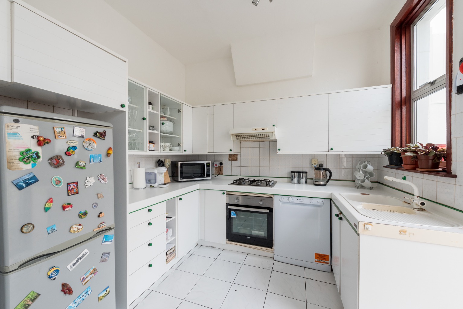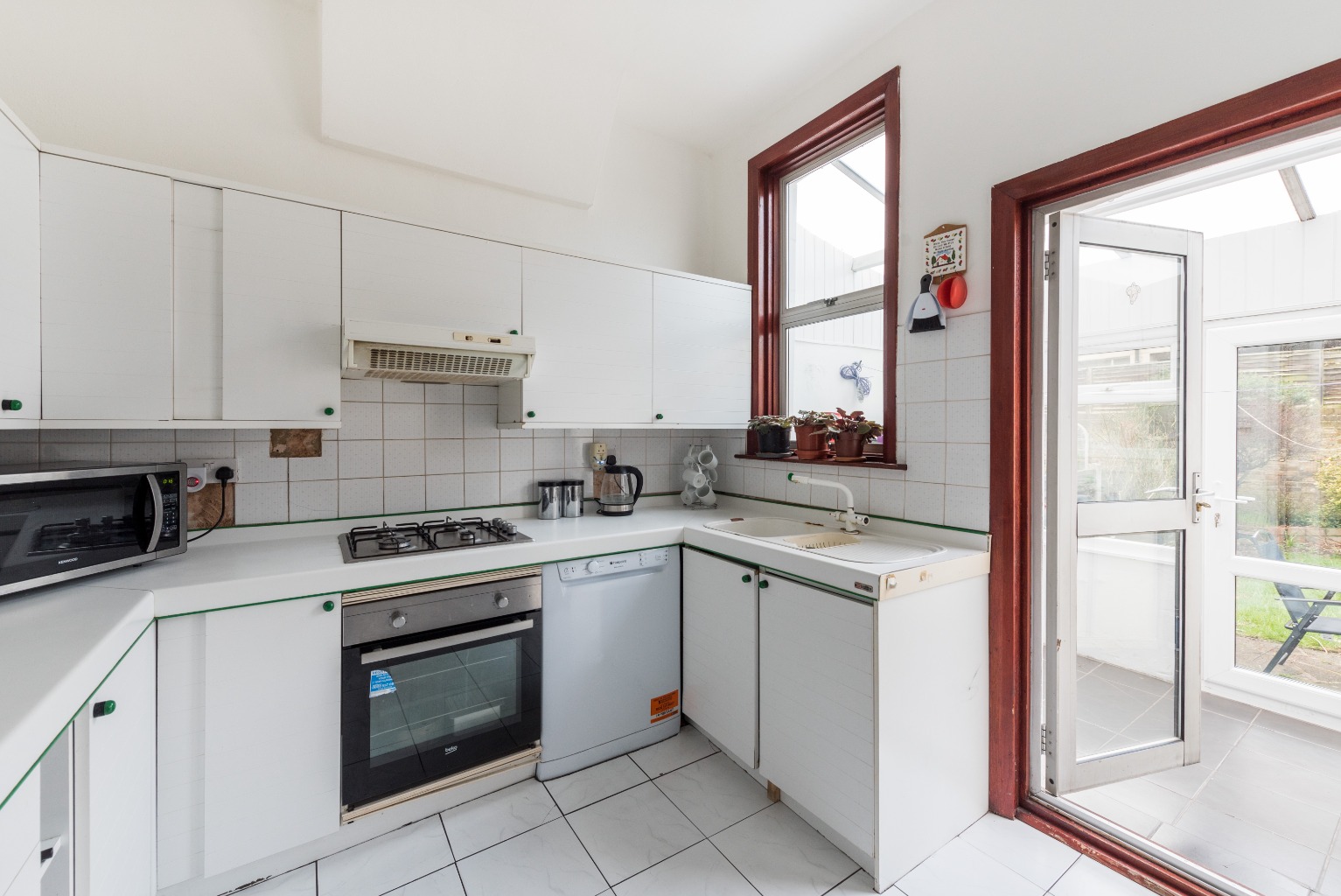 Through the archway and into the kitchen, there’s an array of white base and wall units for storing away your food, crockery and equipment, with matching white worktops, and the floor and splash-back also tiled in white. The minimalist look is clean and contemporary, with a touch of green colour accents to the handles and worktop/unit joints, and the space comes with an integrated dishwasher, oven and hob, plus there’s room for your fridge/freezer. The dark timber window and door frame add a little warmth to the space, with the door in question leading to an extra surprise...