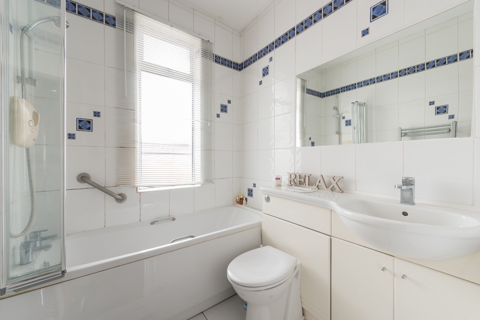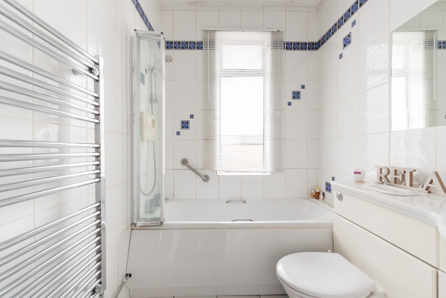 The final room to explore is the bathroom, which has been designed with simplicity and clean lines in mind. It’s tiled floor-to-ceiling in white, with a blue tiles forming a detail around the top of the walls, and interspersed to break up the white and add a subtle little touch of character. The bathroom suite is white and the sink sits in a built-in storage unit which also hides the cistern of the toilet.