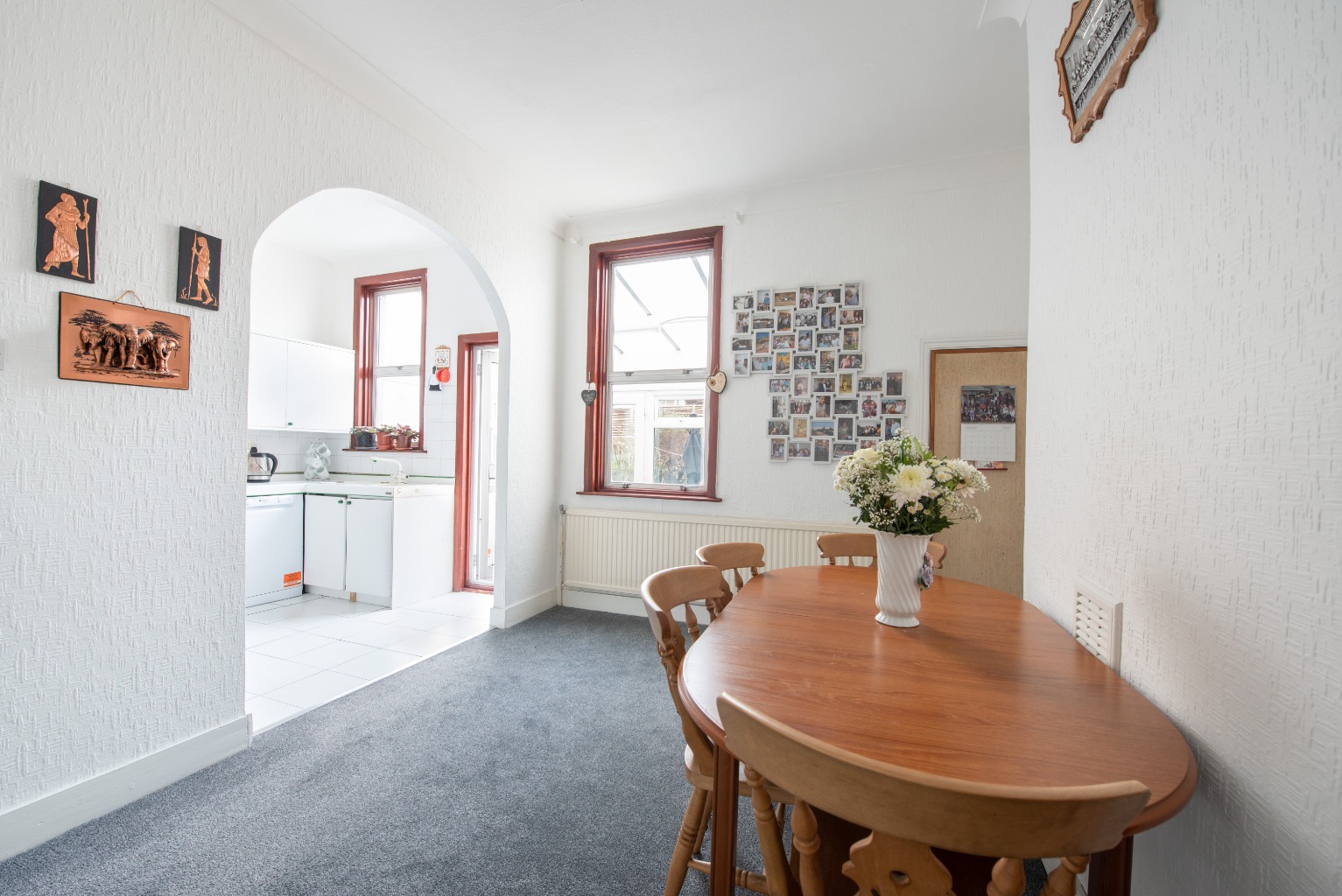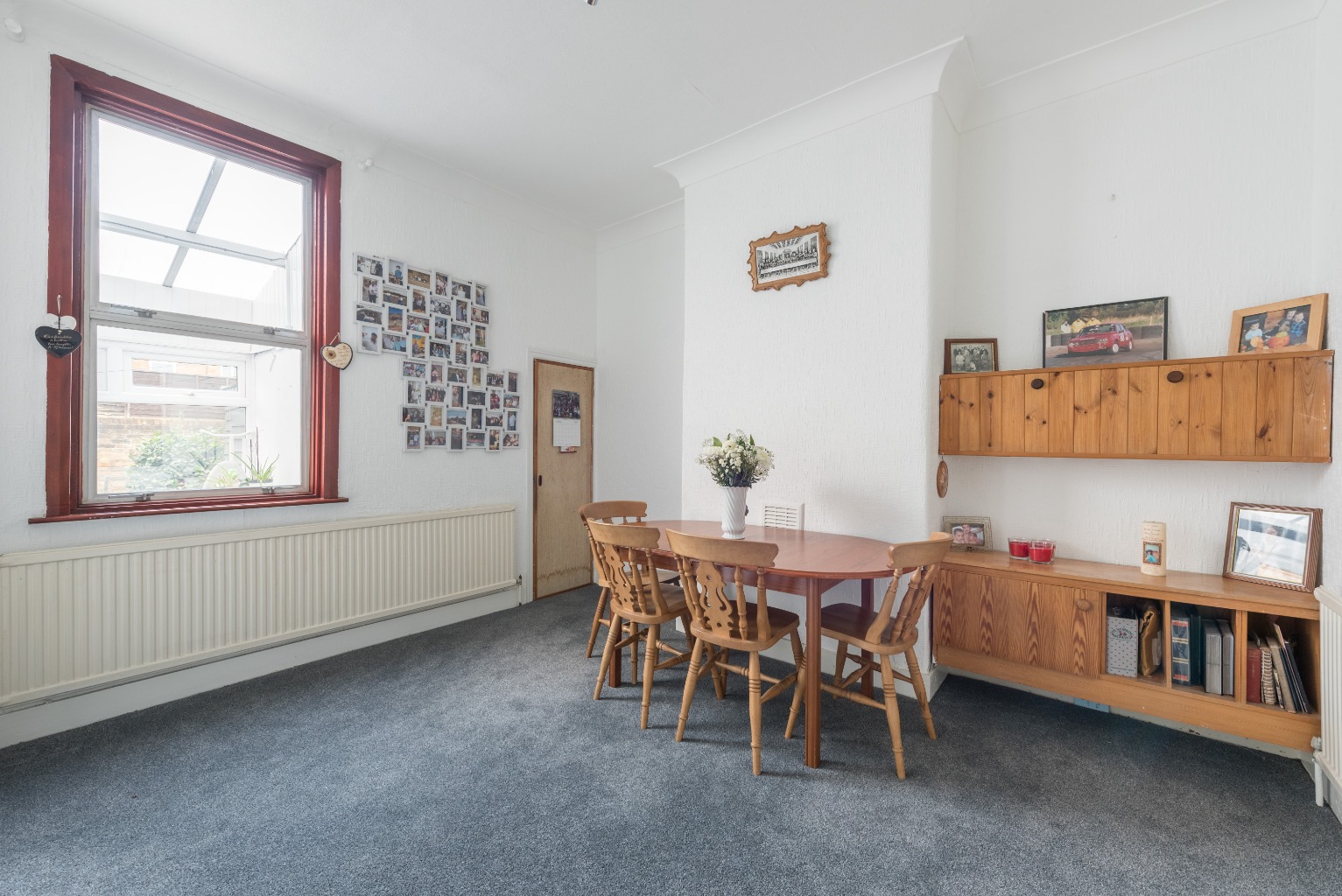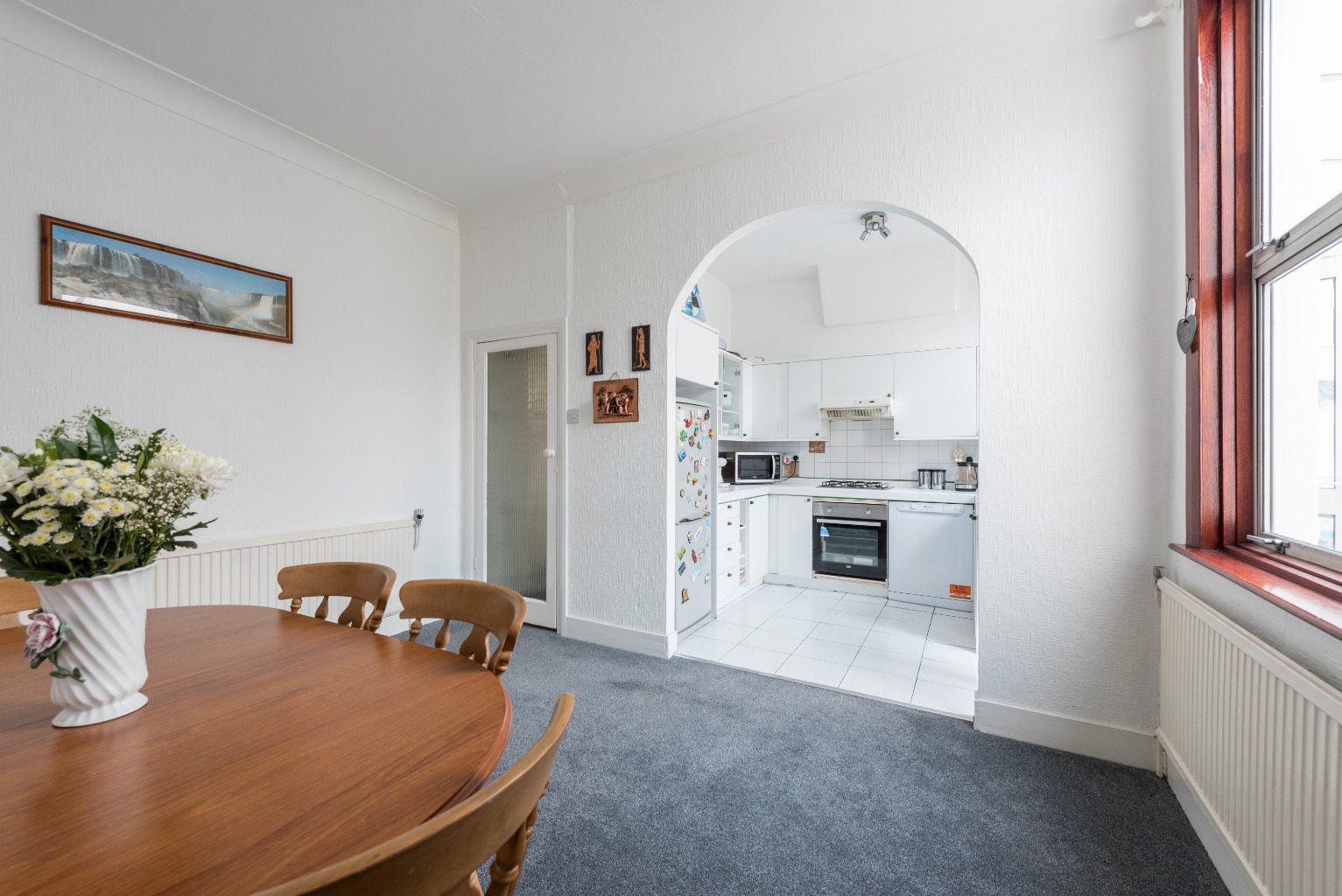 Take a right out of this door and follow the hallway round to the right, and the glass door ahead will bring you onto the second reception room in this beautiful property. Benefitting from the same thick grey carpet as the first reception, hall and stairs, this room is adjoined to the kitchen by a stunning open archway feature, therefore lending this space as the perfect dining area. With its good proportions and size, it would easily take a large family dining table for this to become the central hub of your lovely new home. Alternatively, a smaller table would leave room for a play or ‘snug’ area, or you could purpose this room to suit you whatever your needs. As with the first reception, the chimney breast leaves recesses either side for shelving, bookcases, or storage units and there’s a useful - and large - built-in storage cupboard in the corner of the room by the window.
