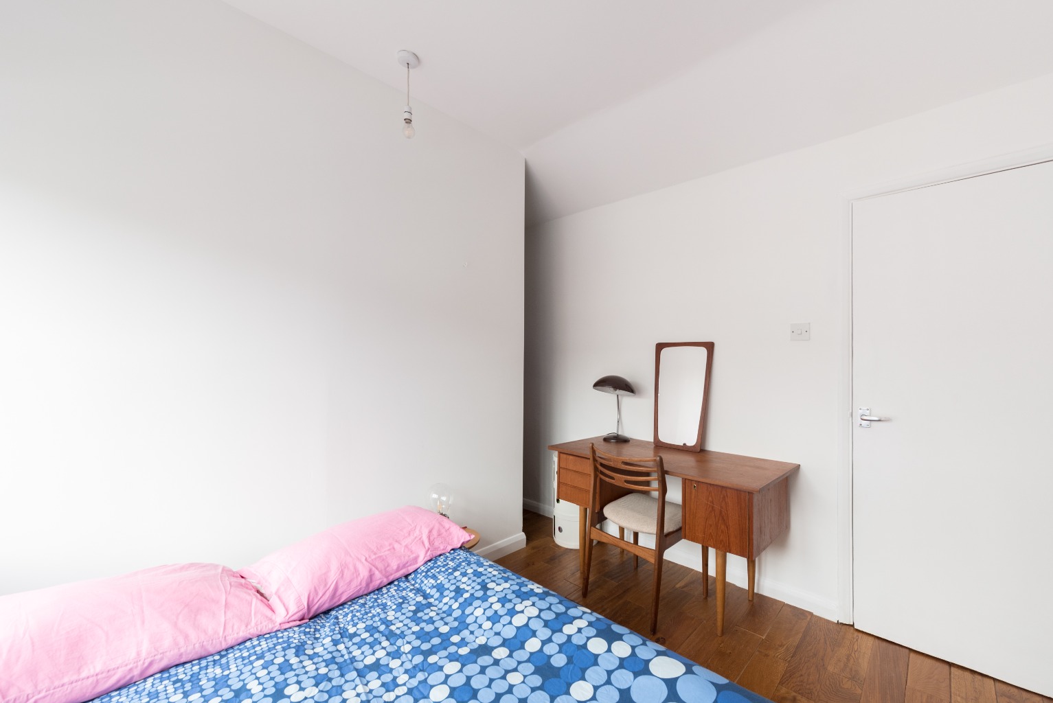 As you exit the bathroom, walk straight across the hallway to the double sized bedroom that lies opposite. The beautiful flooring continues into this space, and the large, front aspect triple window bathes the room in natural light, opening up this room even further. An unusual, quirky and useful feature comes in the form of a large recessed space - much like an internal side return - allowing a huge amount of room to purpose as a wardrobe and/or shelving storage, so you can keep the main area free of clutter. This room can comfortably accommodate a double bed, bedside unit, and drawers or a dressing table – plus there's a second recessed area that can serve as a clothes hanging area and also space for another drawer unit or even perhaps a TV table.