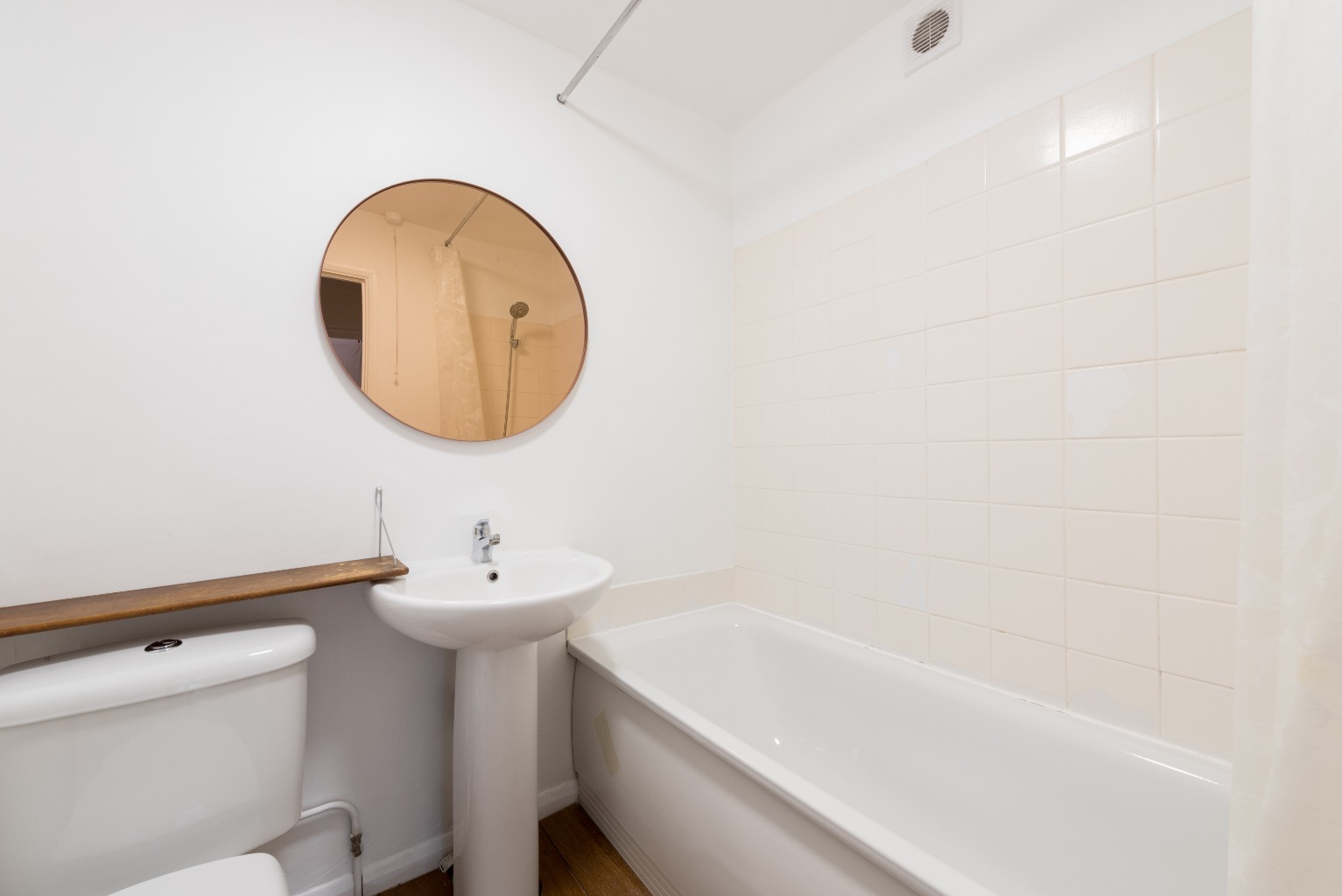 As you enter the flat into your small entrance hallway, directly to your right you'll see the lovely bright bathroom, perfectly furnished with the essentials of WC, sink and bath, and with a handy over-bath shower for when you're in a rush. The fresh white walls and neutral bath tiles are complemented by the sense of warmth provided by the charming engineered wooden flooring. A rustic shelf over the WC also provides a handy space for your toothbrush and toiletries.