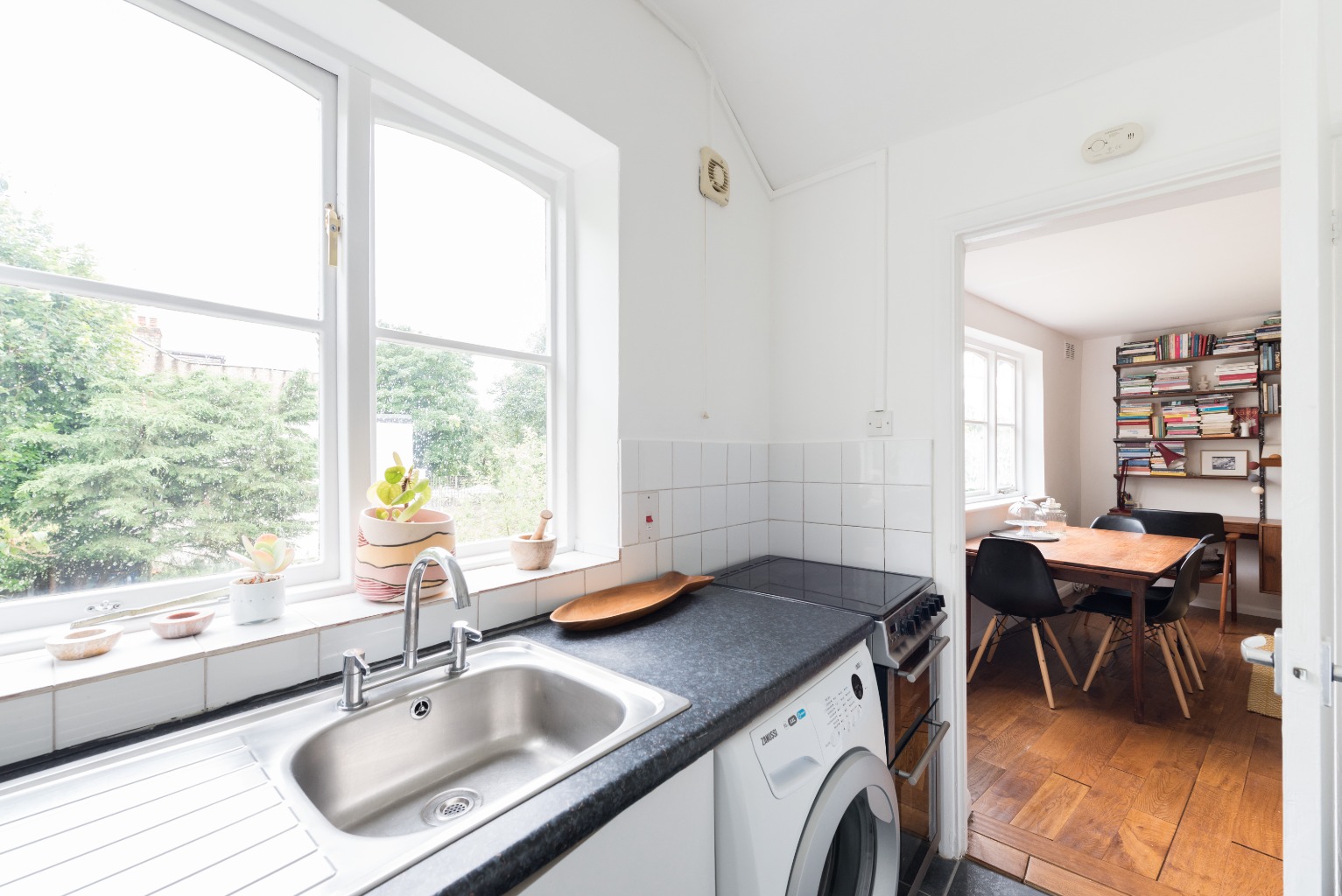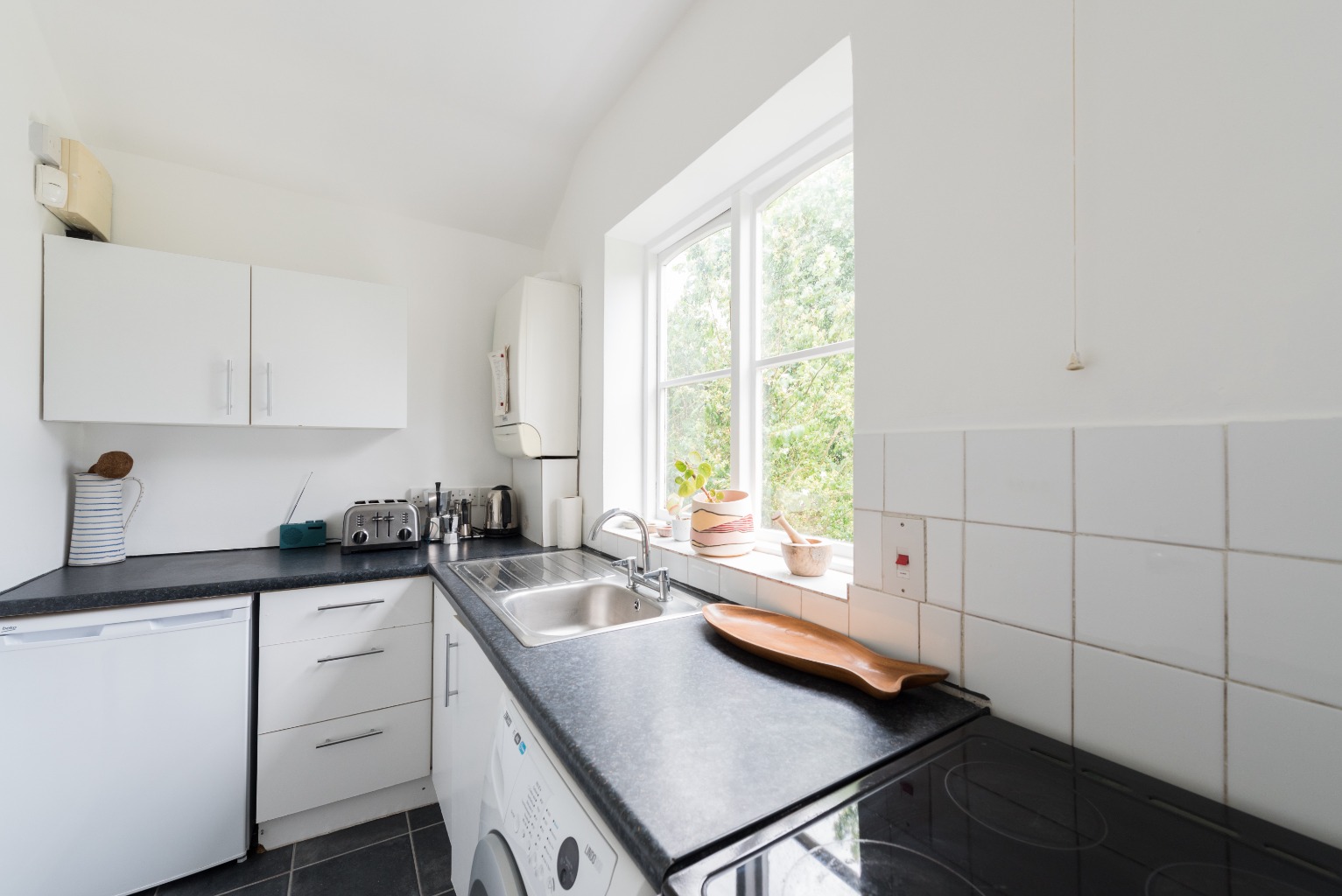 To the rear left of the living room is the open doorway into the wonderfully equipped kitchen, decorated in a stylish combination of white and dark grey. There's a range of base and wall units in bright glossy white, white walls and wall tiles, and mottled charcoal grey countertops and harmonising floor tiles. A washing machine and fridge are already in-situ for your move, so you can chill that celebration bottle of bubbly and keep the milk fresh for those essential brews. From the sink you can look out of the large sunny window onto the street and there's a dedicated space ready for your cooker.