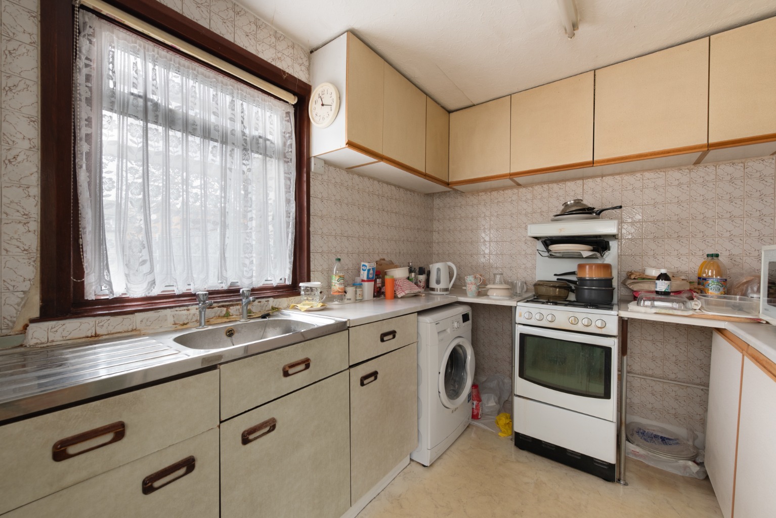Next, we’ll head into the kitchen itself. This room has a large window and an external door providing access to the impressively sized rear garden. There’s currently a range of wall and base units, a free-standing gas cooker, a washing machine, and a fridge freezer will which remain. It’s likely that a purchaser will choose to replace most of the fixtures and fittings and, as previously mentioned, may want to combine this space with the adjacent reception room, although the existing layout is practical if a separate kitchen is preferred. One thing this property offers is choice – lots of it!