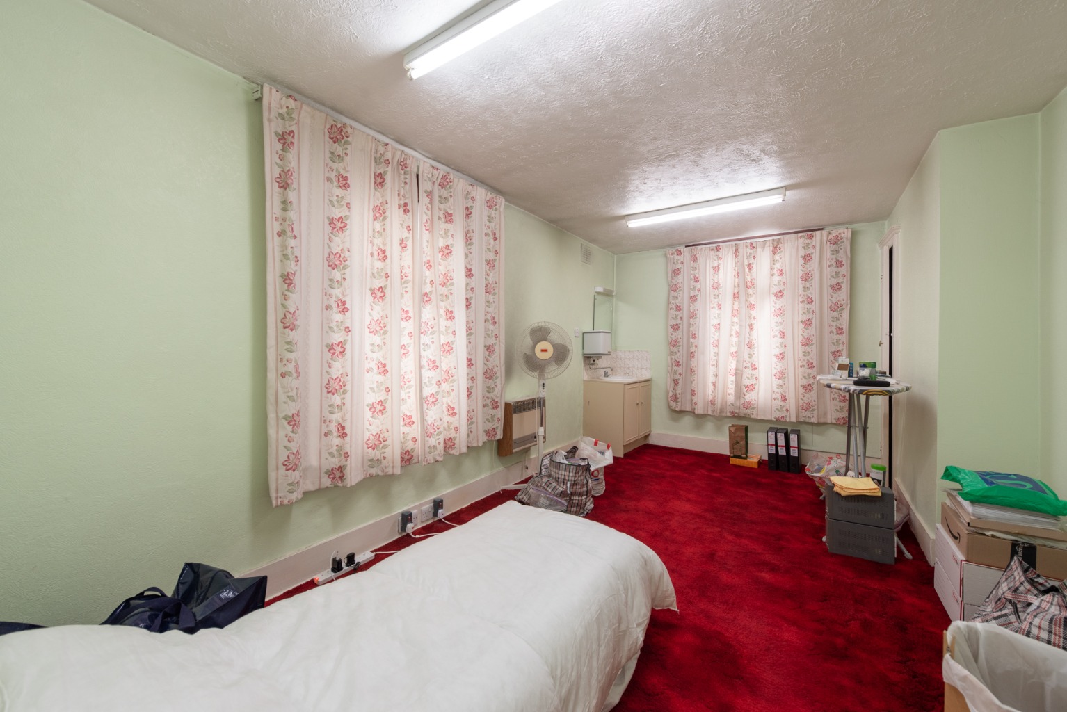 Back through to the hallway now and up the stairs to the spacious split-level landing. Immediately ahead at the top of the stairs you’ll find bedroom three. This is a large and bright dual aspect room with windows looking out to onto the quiet rear garden and the side return. There’s room here for a large double bed, wardrobes and additional storage furniture, with space remaining for a desk or dressing table and armchair. There’s also an original built-in storage cupboard and a vanity unit with inset washbasin.