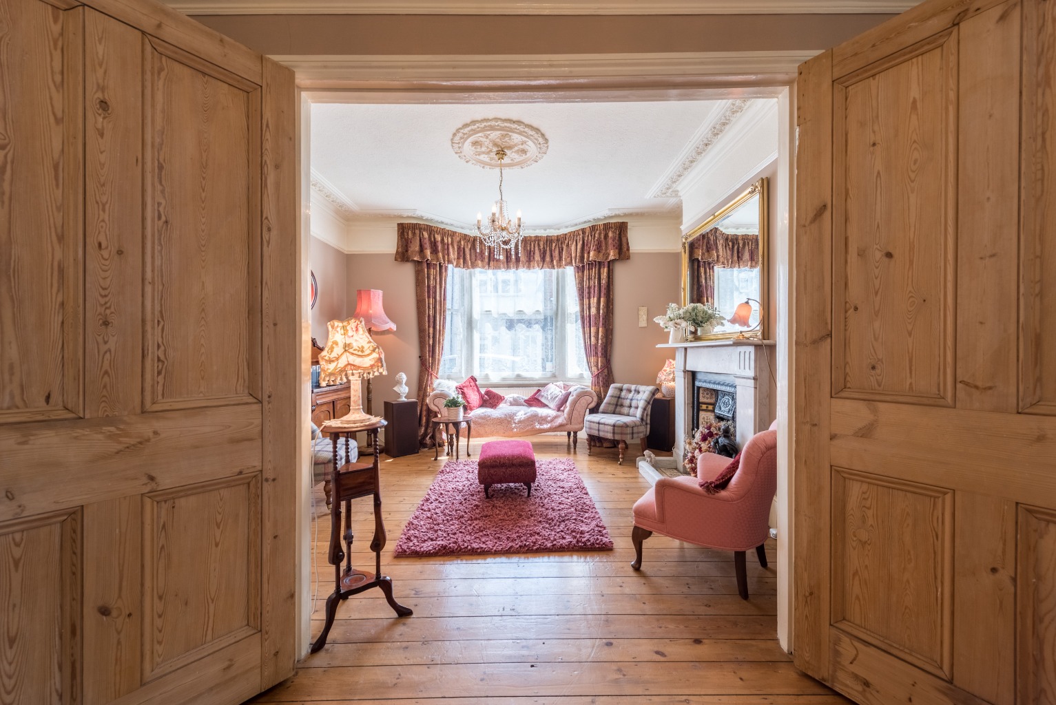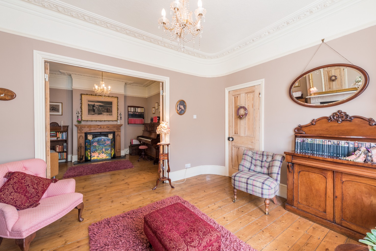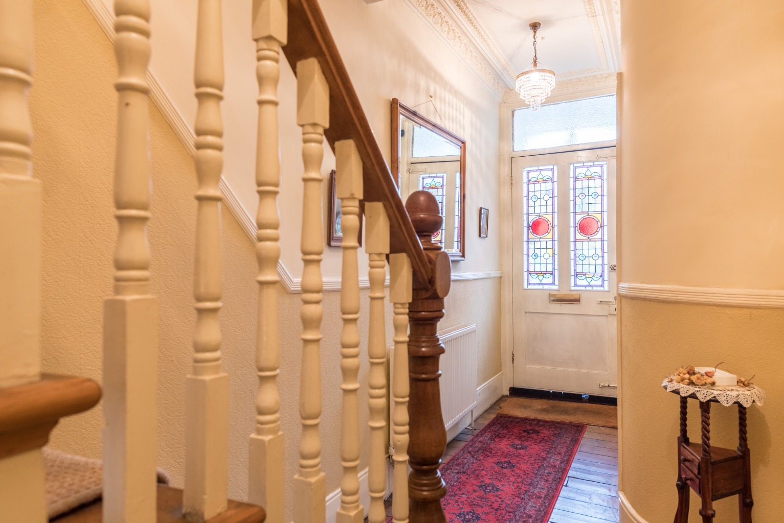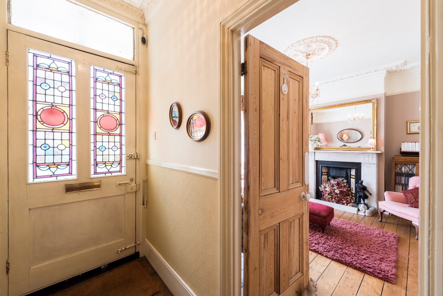 Opening the front door takes you into a space which will create quite the impression on any visitor. The hallway is a generous size with high ceilings, a perfectly chosen chandelier and exquisite ornate cornice, all beautifully lit by the multicoloured stained glass in the front door. There are deep skirting boards and a fluted dado rail which runs the length of the hall and continues up the stairs. There’s plenty of wall space to display your favourite artwork and a radiator to ensure a warm welcome. Where the hallway widens to lead into the rest of the property, it has been formed using a clever convex curved wall, adding a fantastic sense of flow to the space.