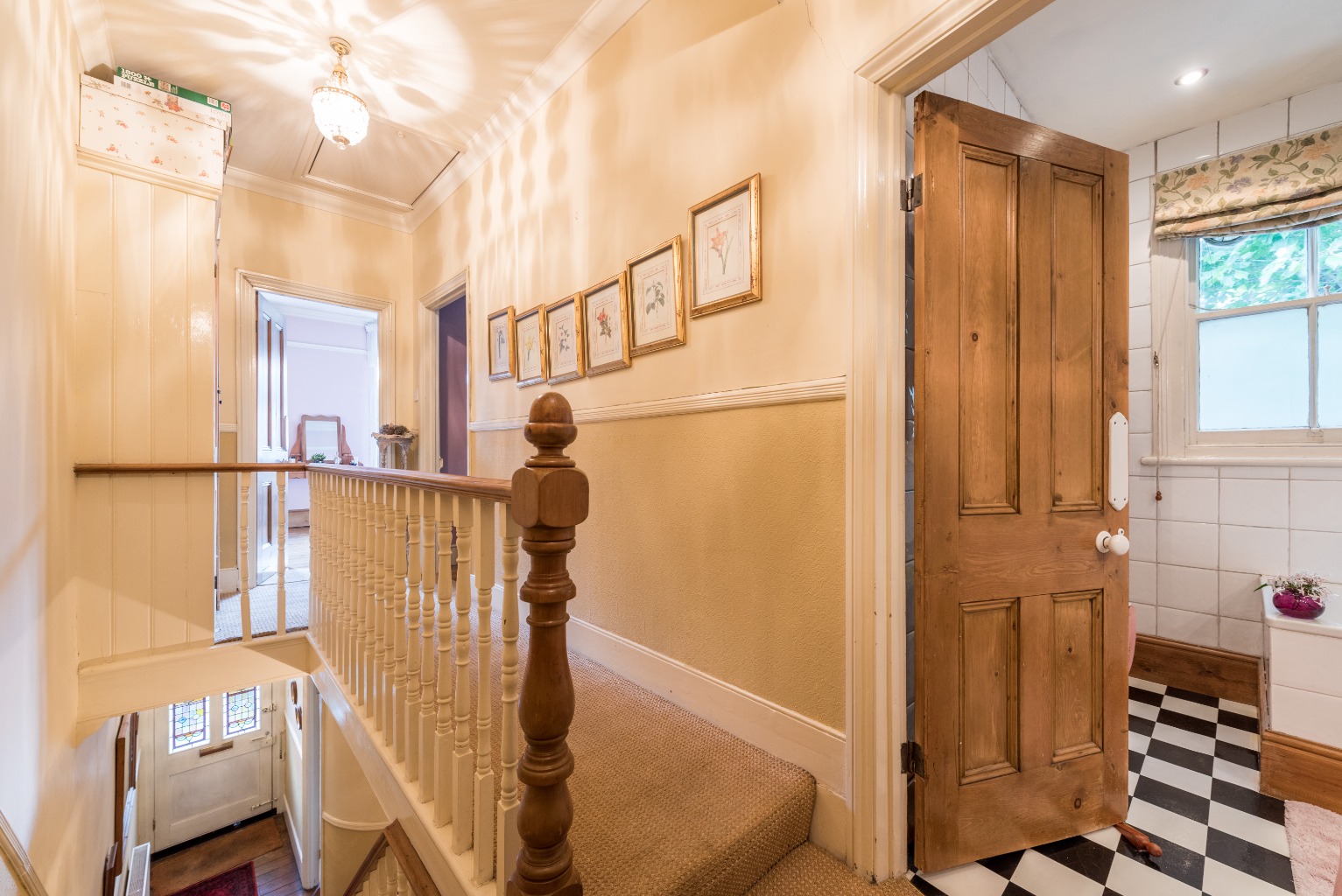 Back now through the kitchen and dining room to the hallway and up the elegant staircase with its oak newel post and handrail, with cream painted balusters. The timber stair treads are partially exposed with a central carpet runner, and the large landing is decorated to match the hallway and offers original built-in storage cupboard and access to the loft space.