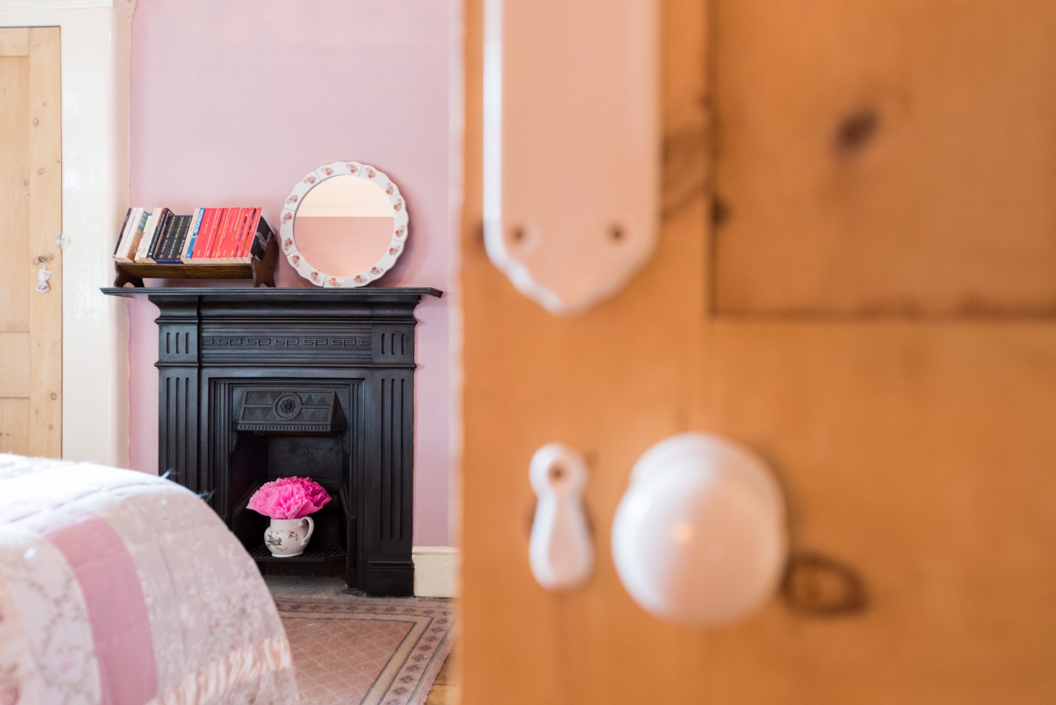 Once again out to the landing and the next door, also on the right, brings you into the second bedroom. This is a lovely bright double room, with a south facing window and carnation pink walls. The mantel of the cast iron fireplace is the ideal location for your favourite ornaments and would look great with a large piece of artwork or mirror above. There’s an original built-in wardrobe with stripped pine door and beautifully restored floorboards. Some little accents in your chosen colour will ensure that this is a comfortable retreat whether used as a family bedroom or occasional guestroom.