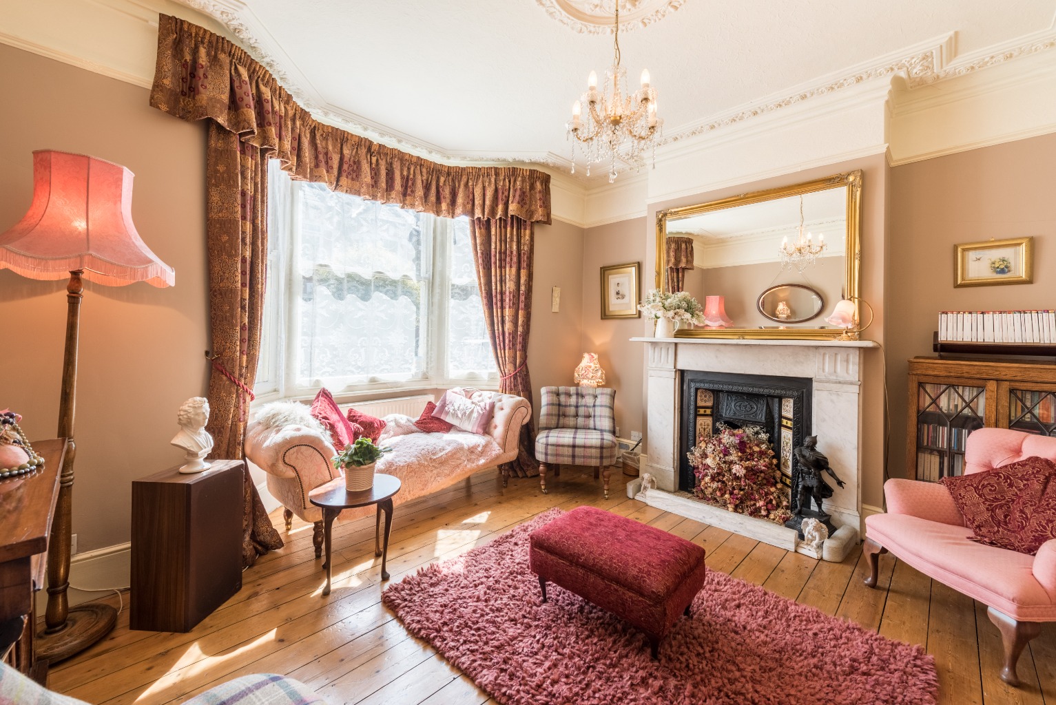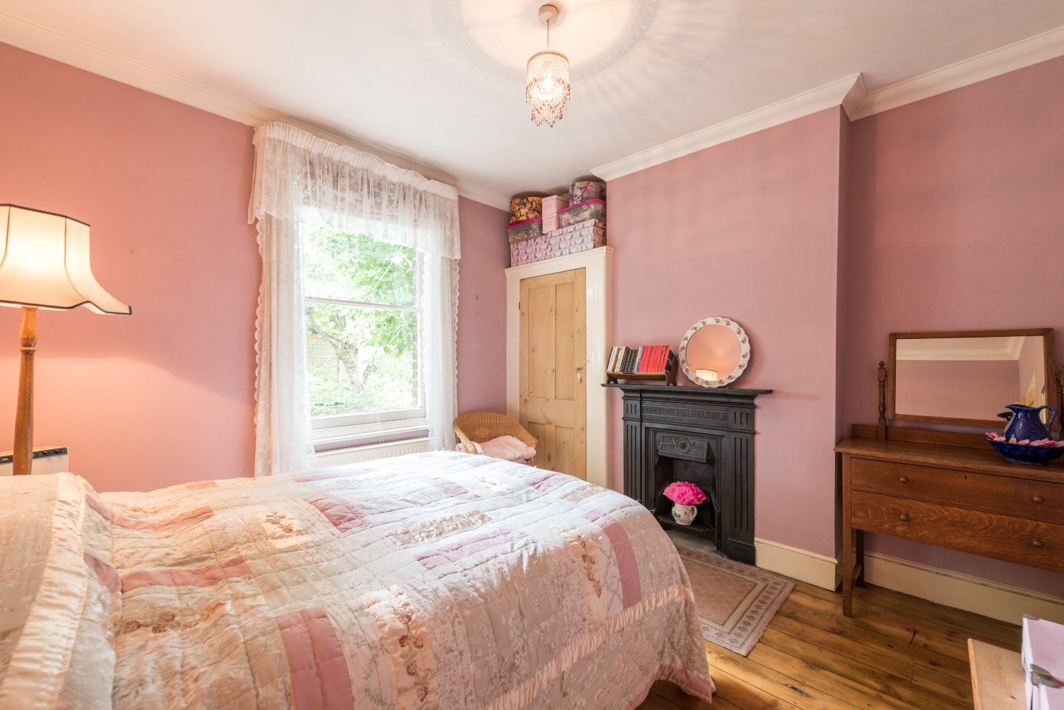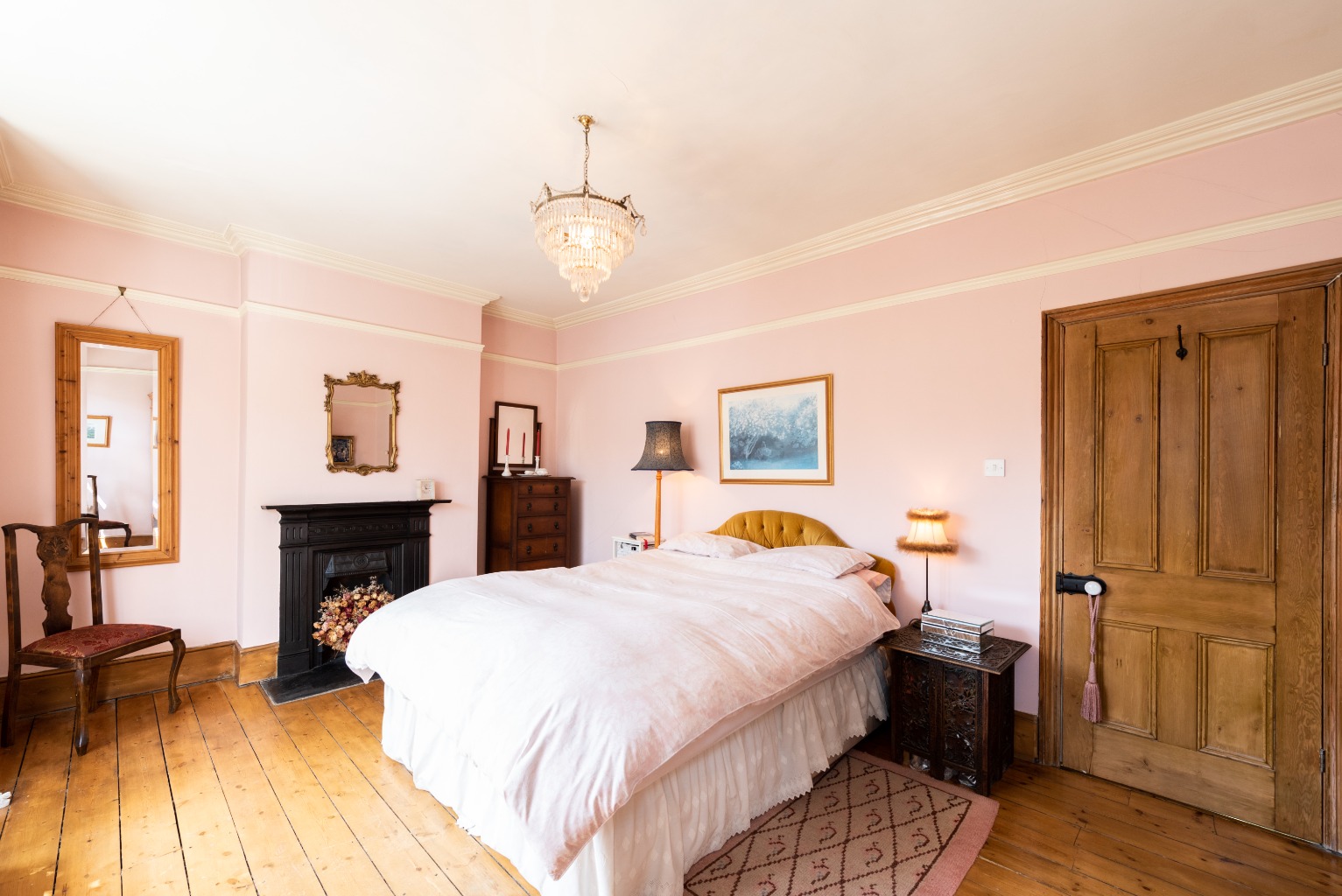 On returning to the landing, you’ll find one last door – into the spectacular main bedroom. Occupying the full width of the house and benefitting from two windows, one of which is the upper bay window from the front façade, this room has generous proportions along with an abundance of natural light. The more ornate cornicing and a picture rail in this room reinforce the almost stately feel of this main bedroom, and the gorgeous cast iron fireplace set within the wide chimney breast would look stunning with a large mirror or statement piece of art placed above. The bay window would be an ideal spot for a chaise longue or comfy armchair to make a cosy reading nook alongside the radiator. There’s ample space for wardrobes, chests of drawers and a dressing table, and the walls are once again decorated in carnation pink.