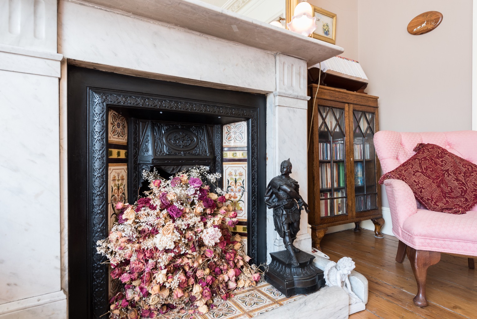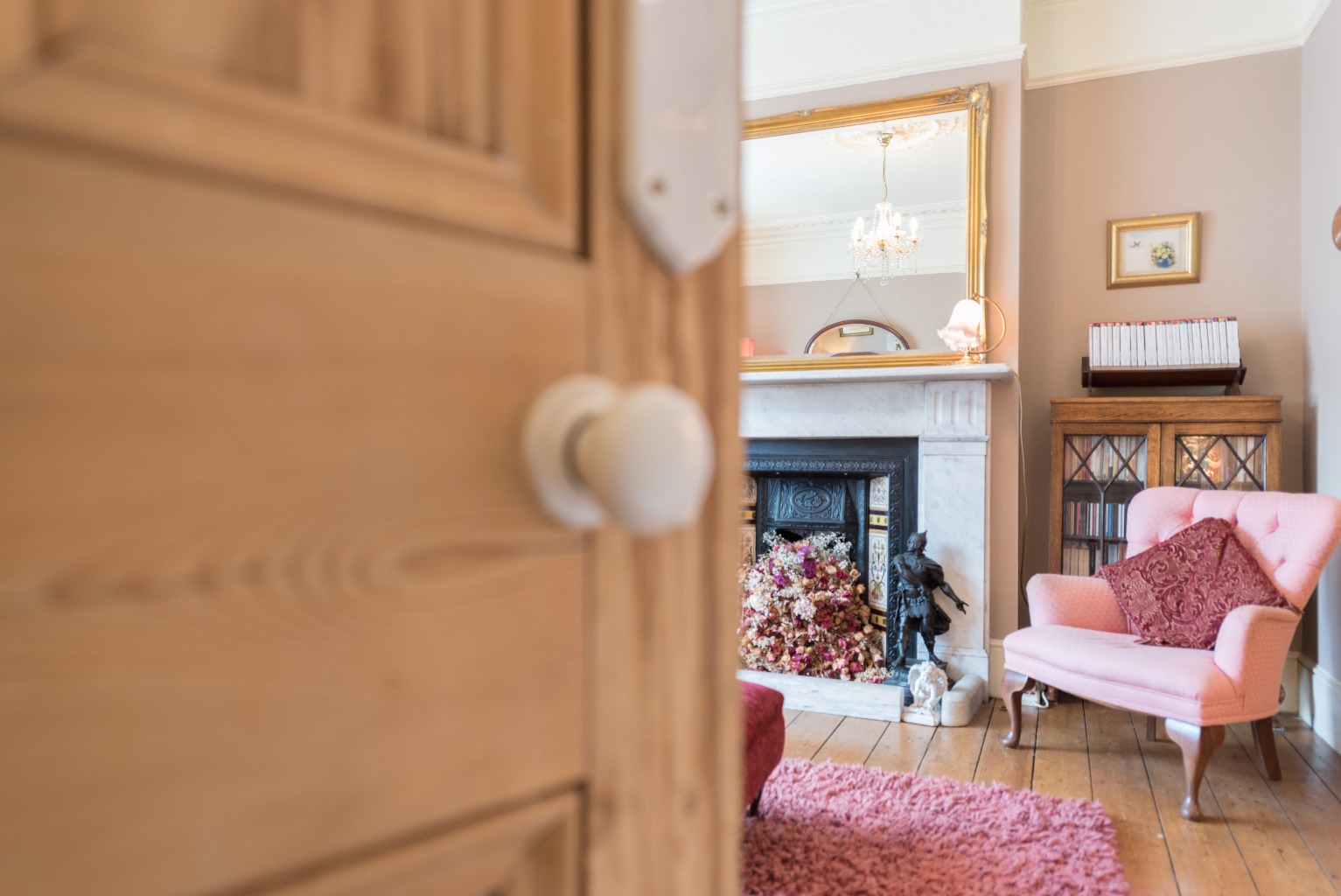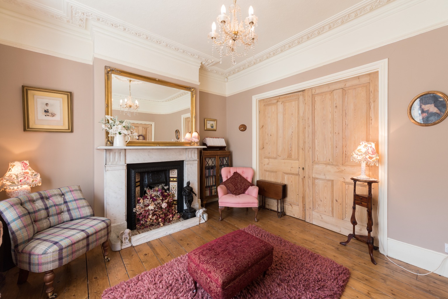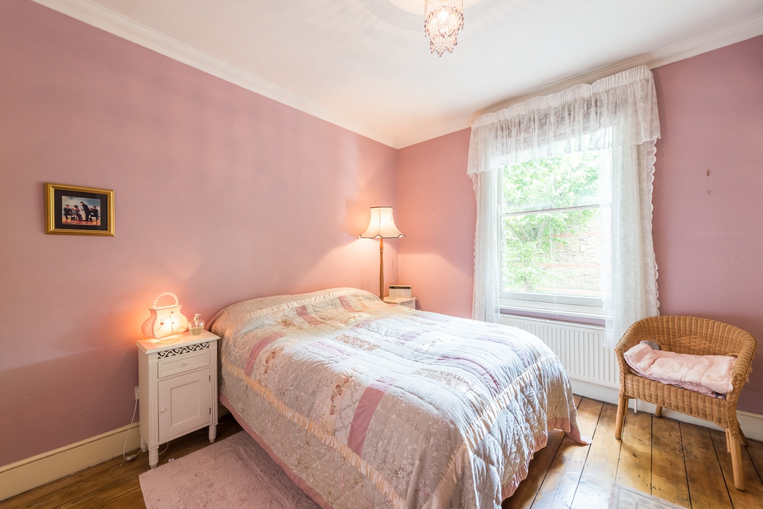 On returning to the landing, you’ll find one last door – into the spectacular main bedroom. Occupying the full width of the house and benefitting from two windows, one of which is the upper bay window from the front façade, this room has generous proportions along with an abundance of natural light. The more ornate cornicing and a picture rail in this room reinforce the almost stately feel of this main bedroom, and the gorgeous cast iron fireplace set within the wide chimney breast would look stunning with a large mirror or statement piece of art placed above. The bay window would be an ideal spot for a chaise longue or comfy armchair to make a cosy reading nook alongside the radiator. There’s ample space for wardrobes, chests of drawers and a dressing table, and the walls are once again decorated in carnation pink.