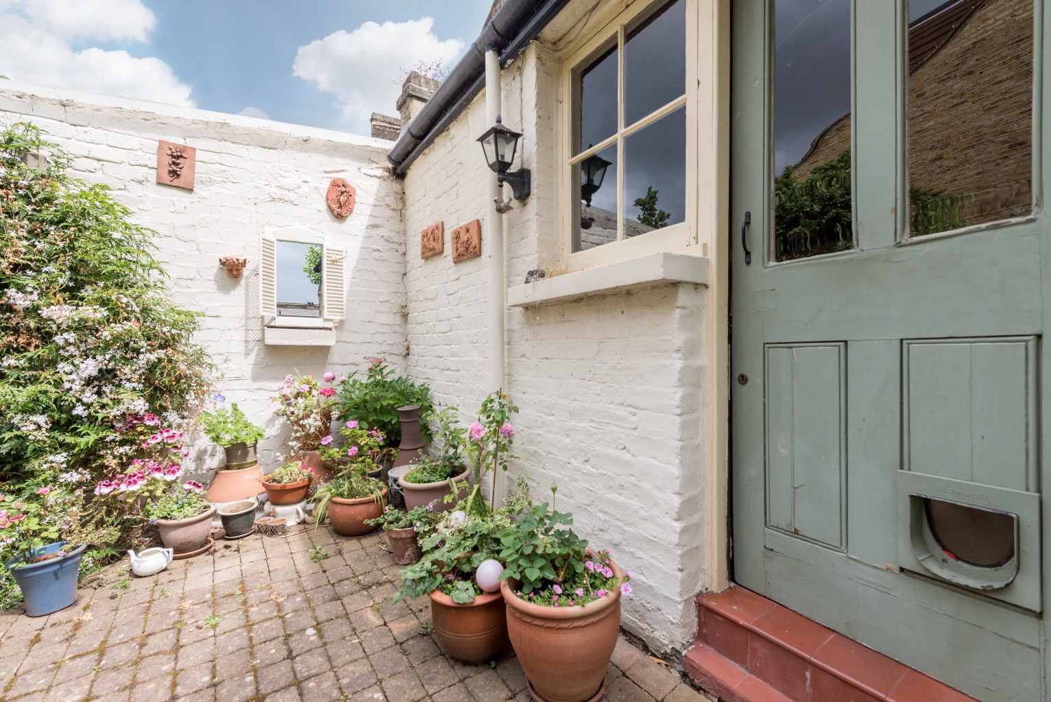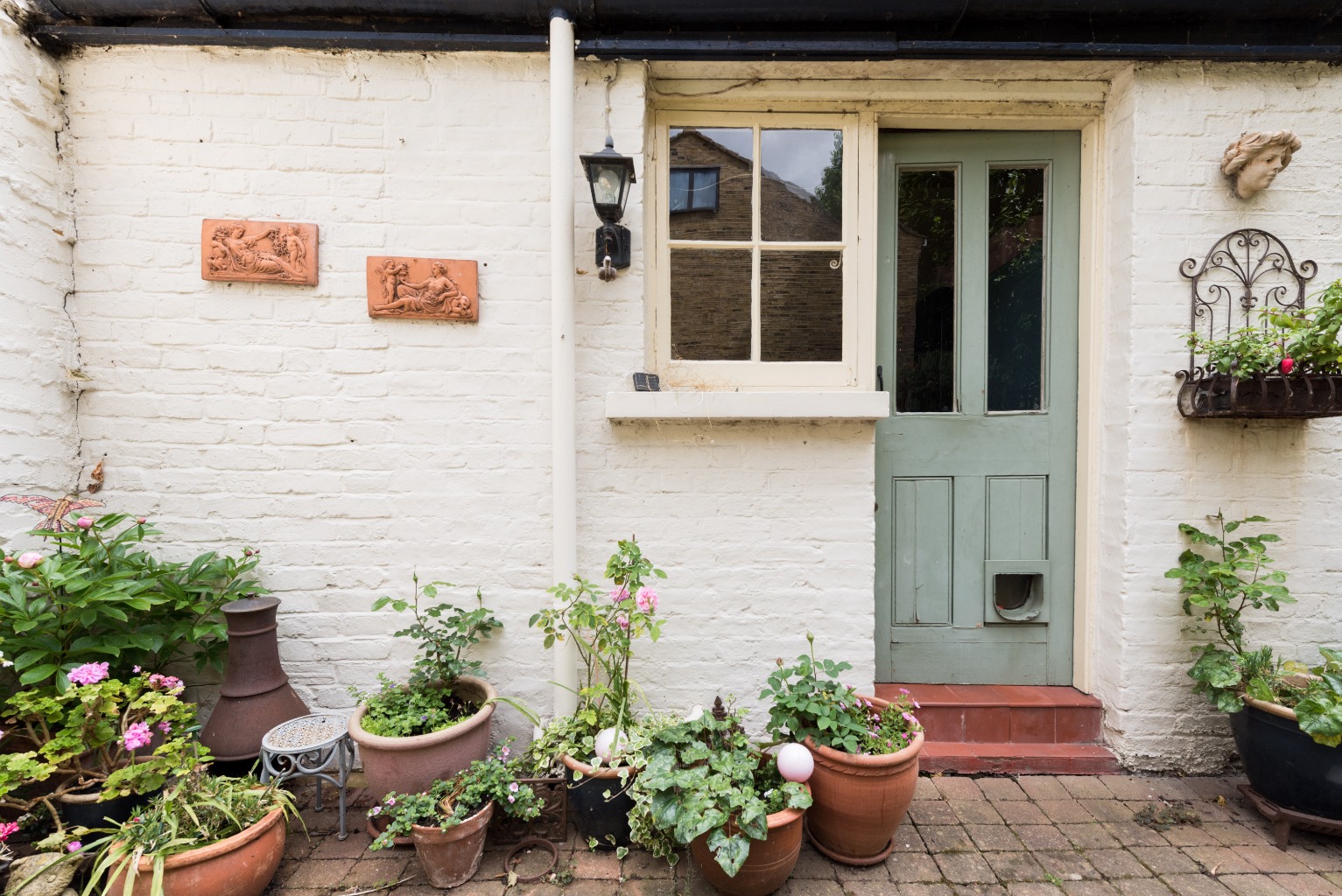 Next, take the part glazed rear external door out to the delightful garden. First stop is a spacious, part-enclosed courtyard with cream painted walls and a terrace formed from brick paviours, a perfect spot to soak up the evening sun in this 24ft west facing garden. The paved area continues around the side of the house to the side porch alongside mature planted borders. There’s also a lawned area with more borders and a useful storage shed. The garden is not overlooked, with this feeling of privacy being enhanced by the mature trees along the side road.