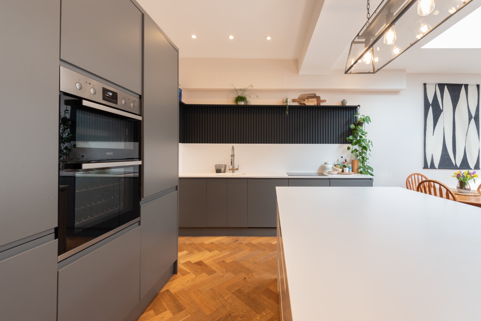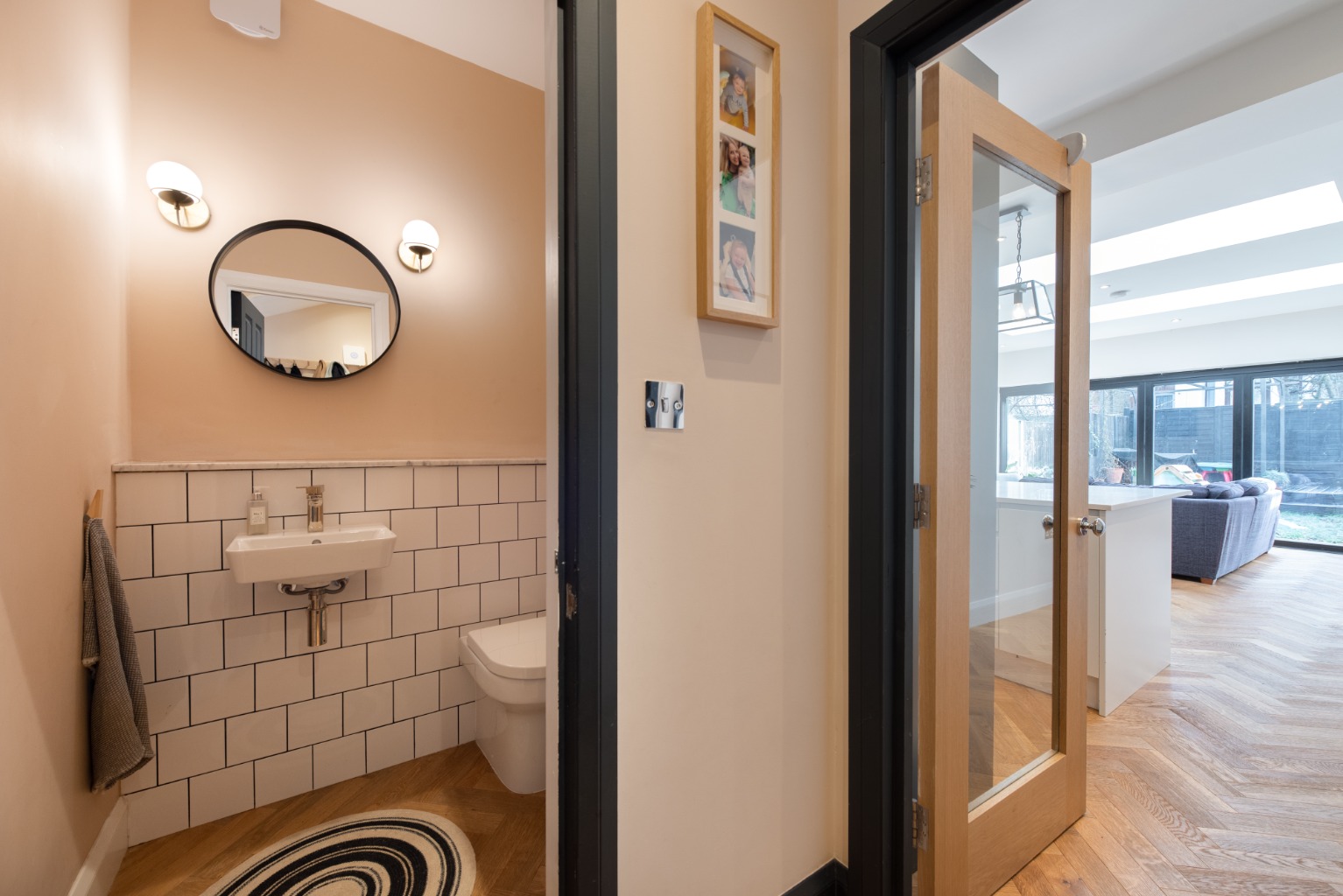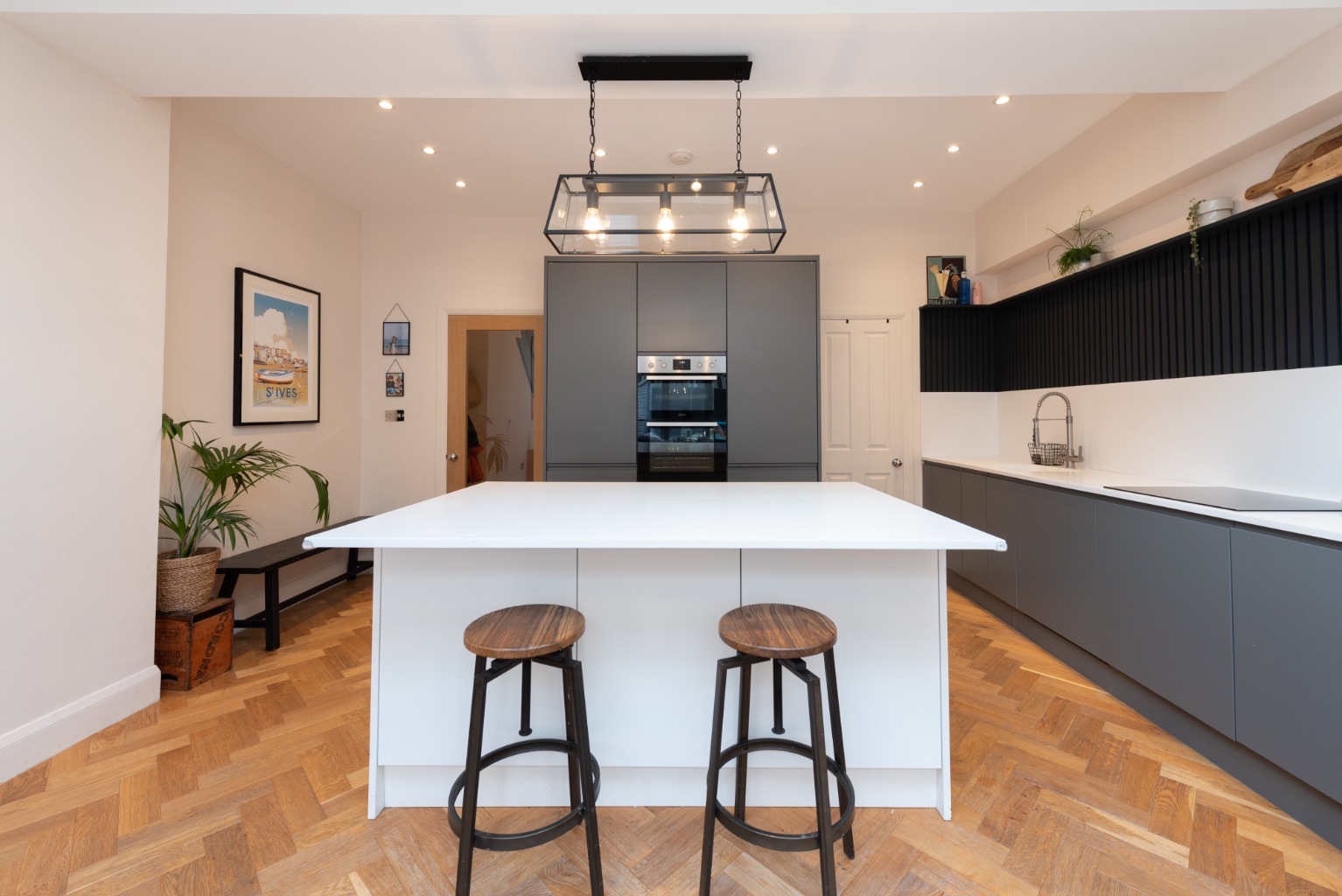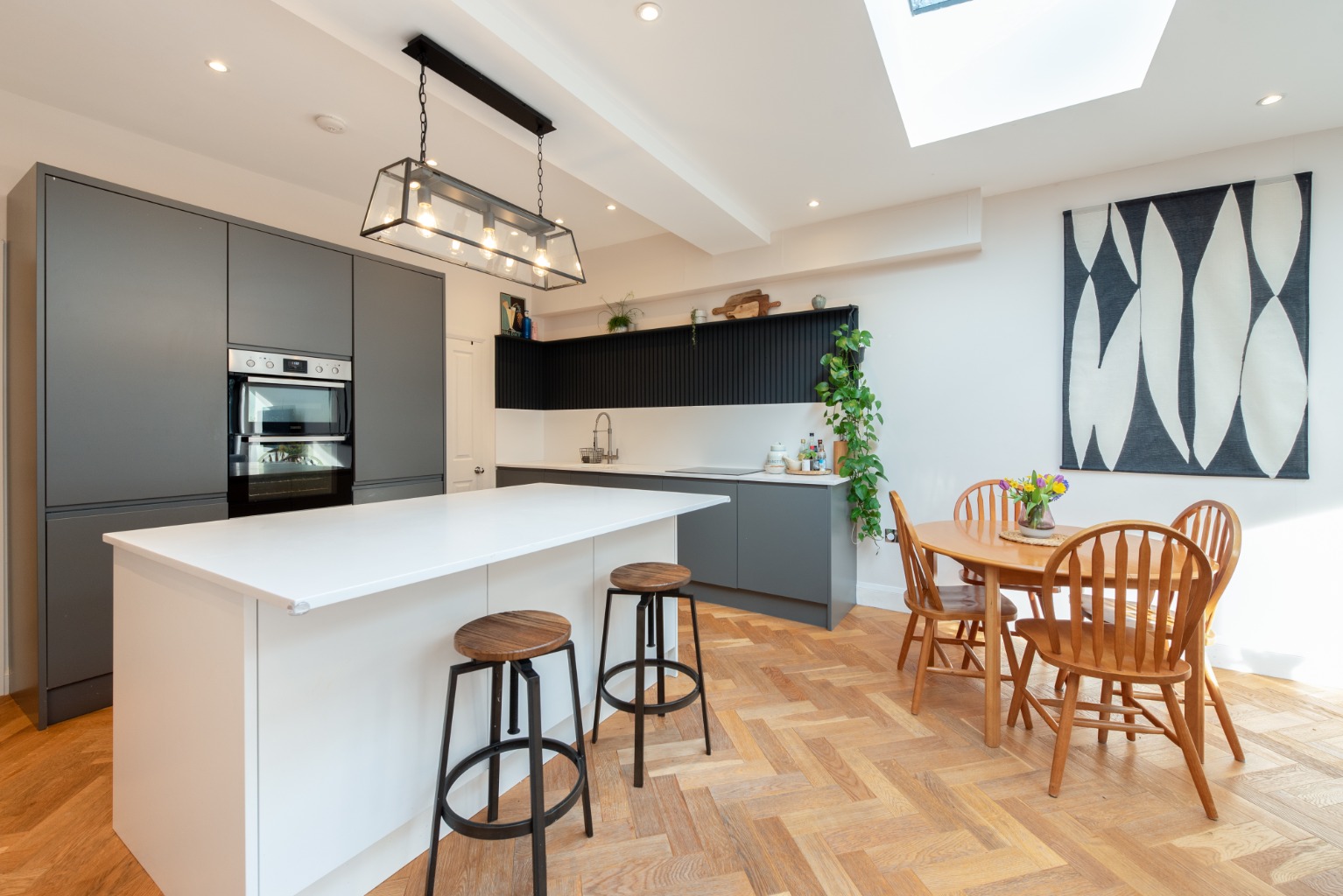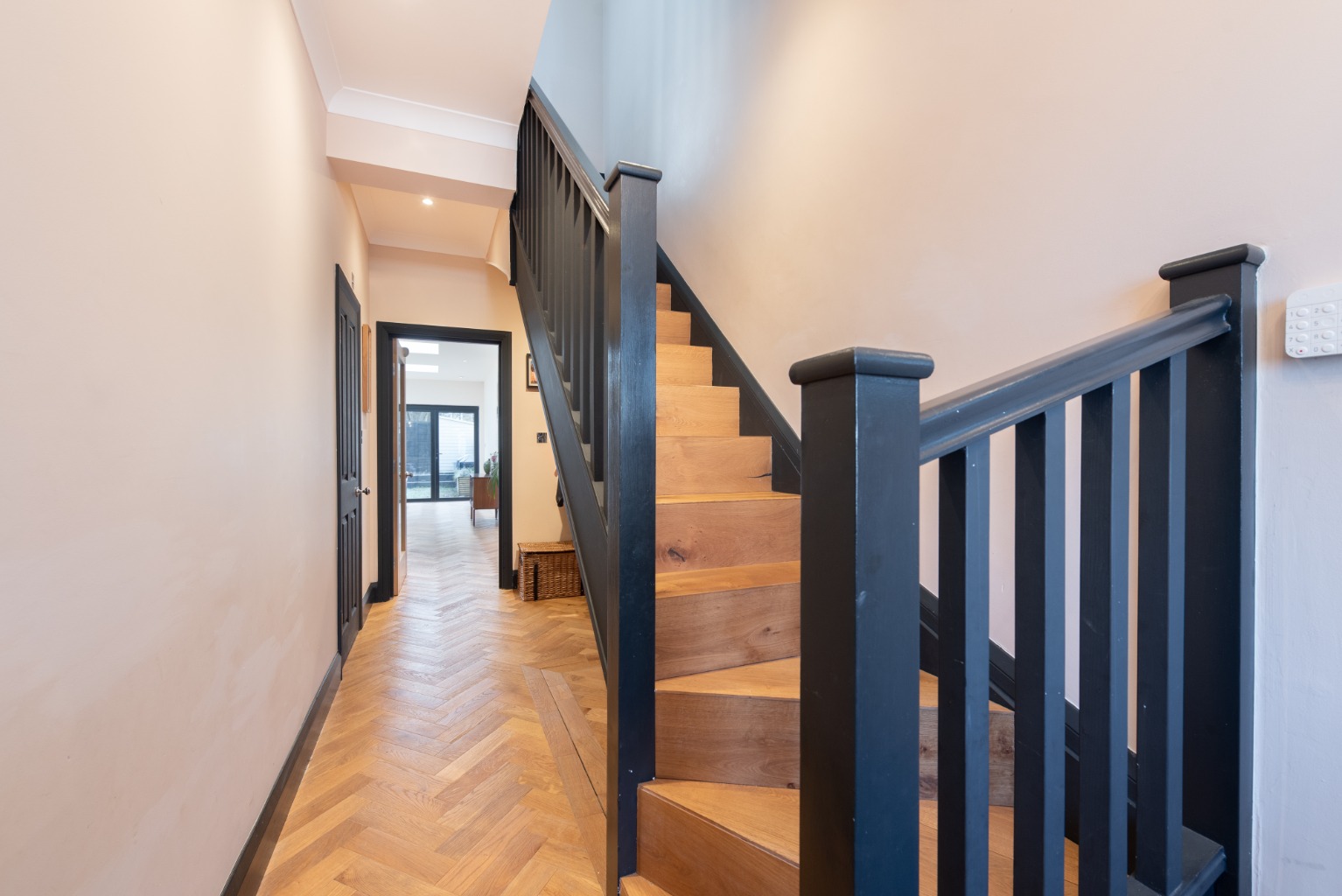 As you enter the property you find yourself in a spacious and stylish hallway, which really sets the tone for the rest of this beautifully presented property. Woodwork is finished in a dark charcoal with plaster-coloured paint to the walls. The staircase has timber risers and treads, which match the engineered oak herringbone patterned floor that runs throughout the ground floor.