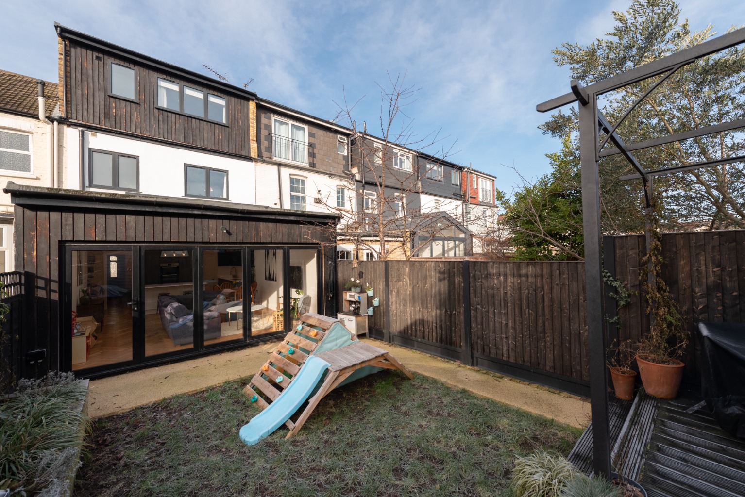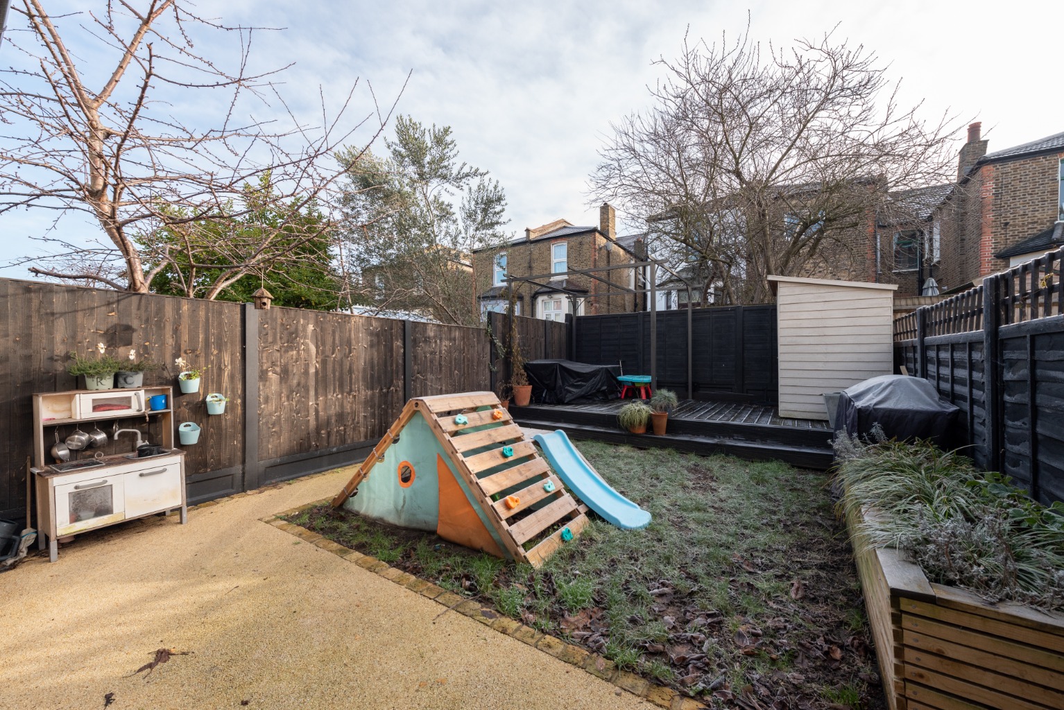 The rear extension is the largest on the street giving us fantastic entertaining and living space without compromising the garden. The garden itself gets sun all year round and we built the decking to accommodate a dining table and several seats to get the most of the evening sun in the summer. We are also lucky to get enough shade and privacy from the trees in surrounding gardens whilst not giving up any of our garden’s footprint. We love the cherry blossom tree that overhangs from next door as it is beautiful in spring with its pink petals and abundance of delicious cherries. We love the community feel of this area: neighbours say hello to each other and we have made friends with many families on the road. We have friendly, quiet neighbours either side and the house is genuinely a peaceful and comfortable place to live. With our eldest starting school in September, we are now taking the opportunity to move closer to family in Hertfordshire'.