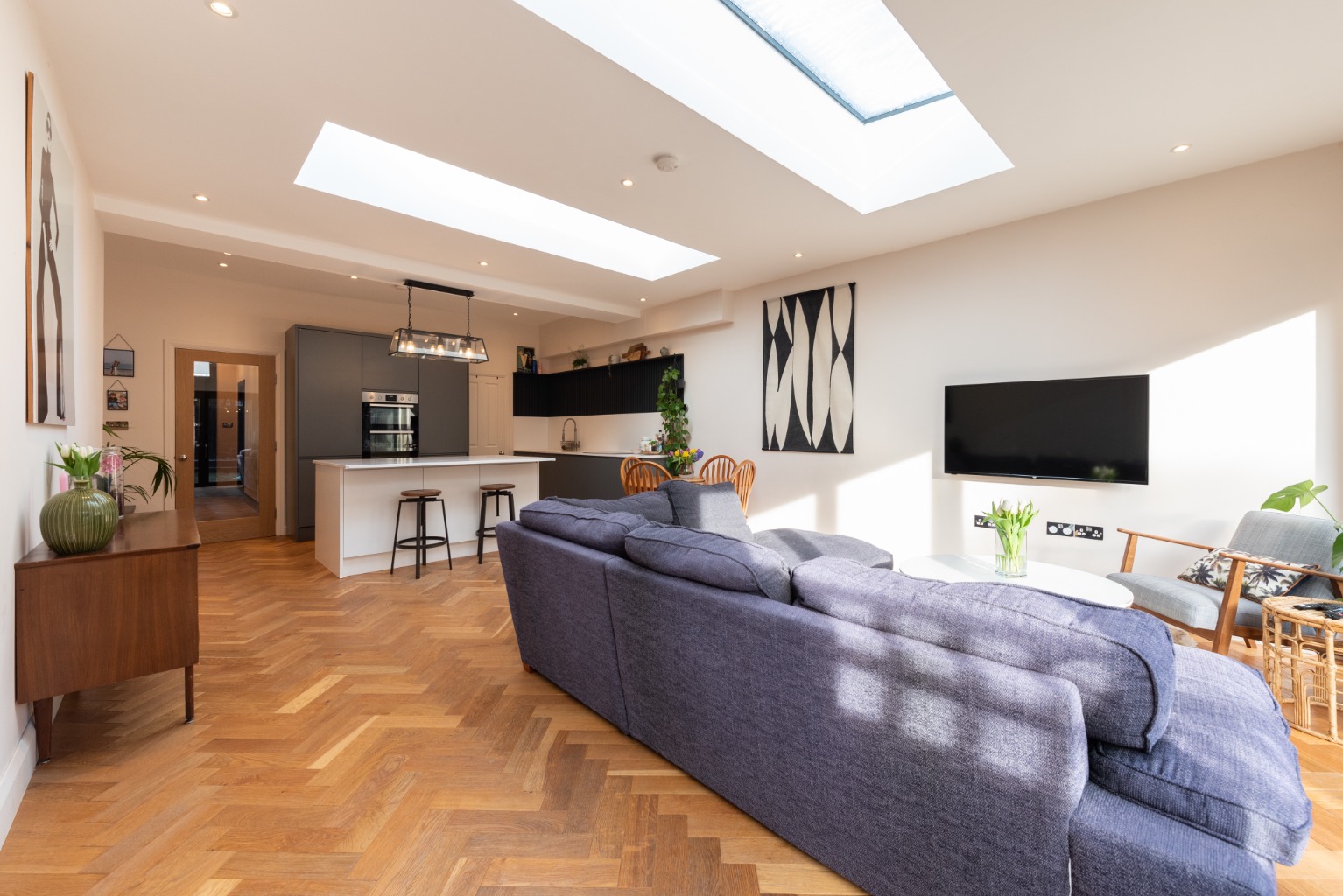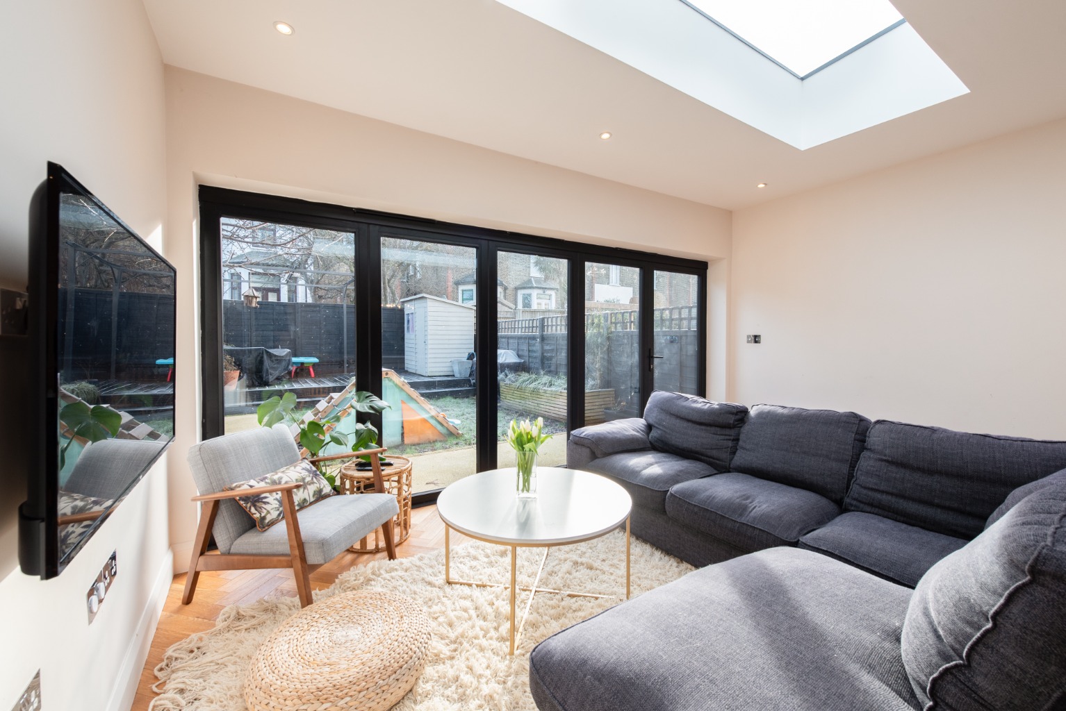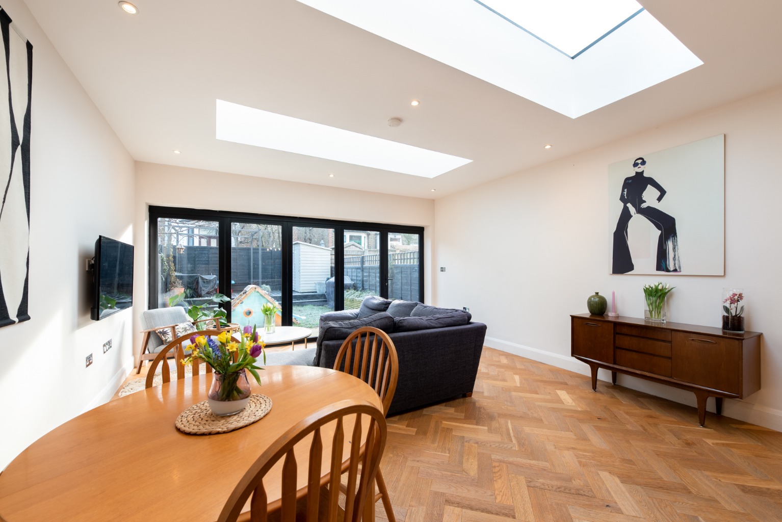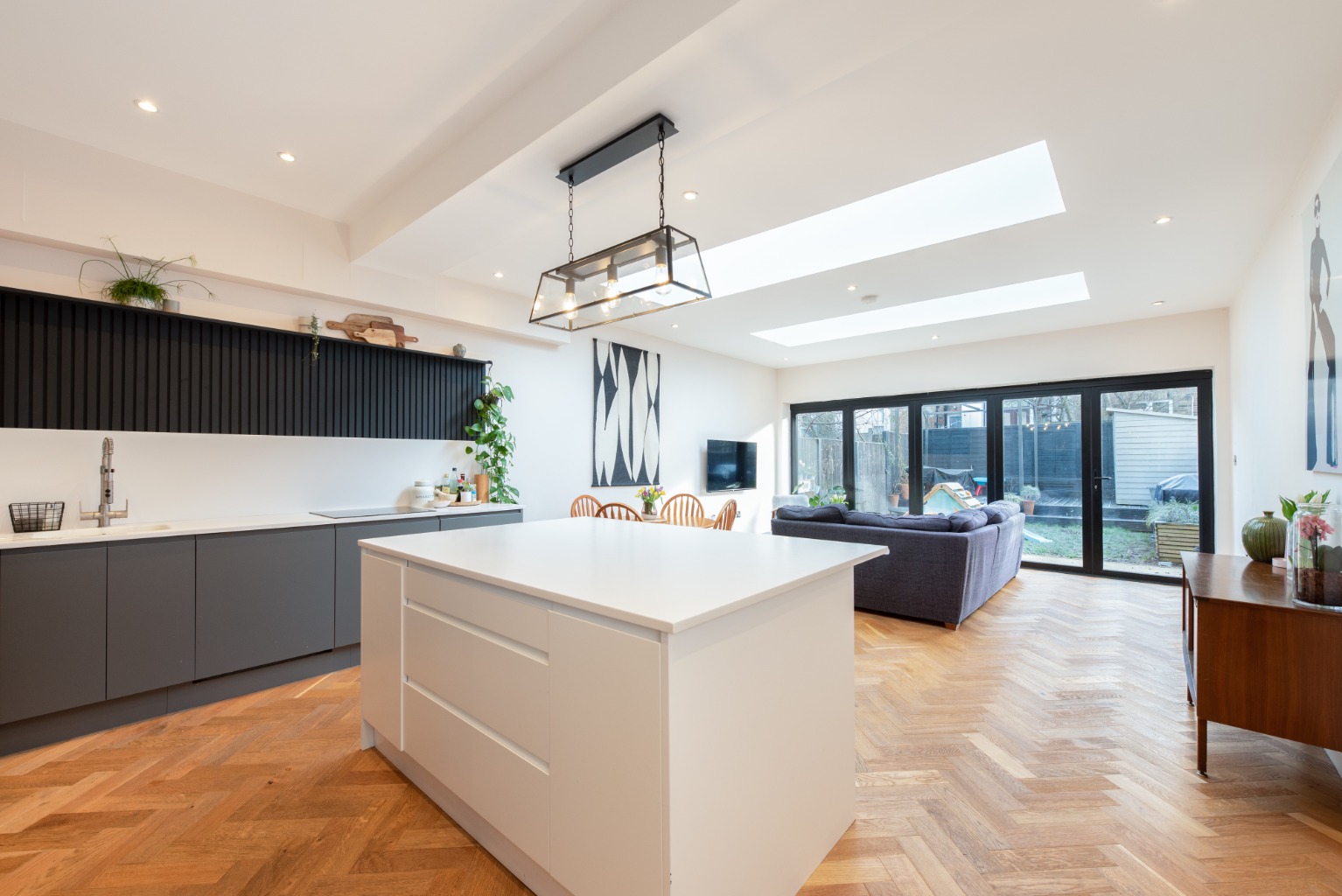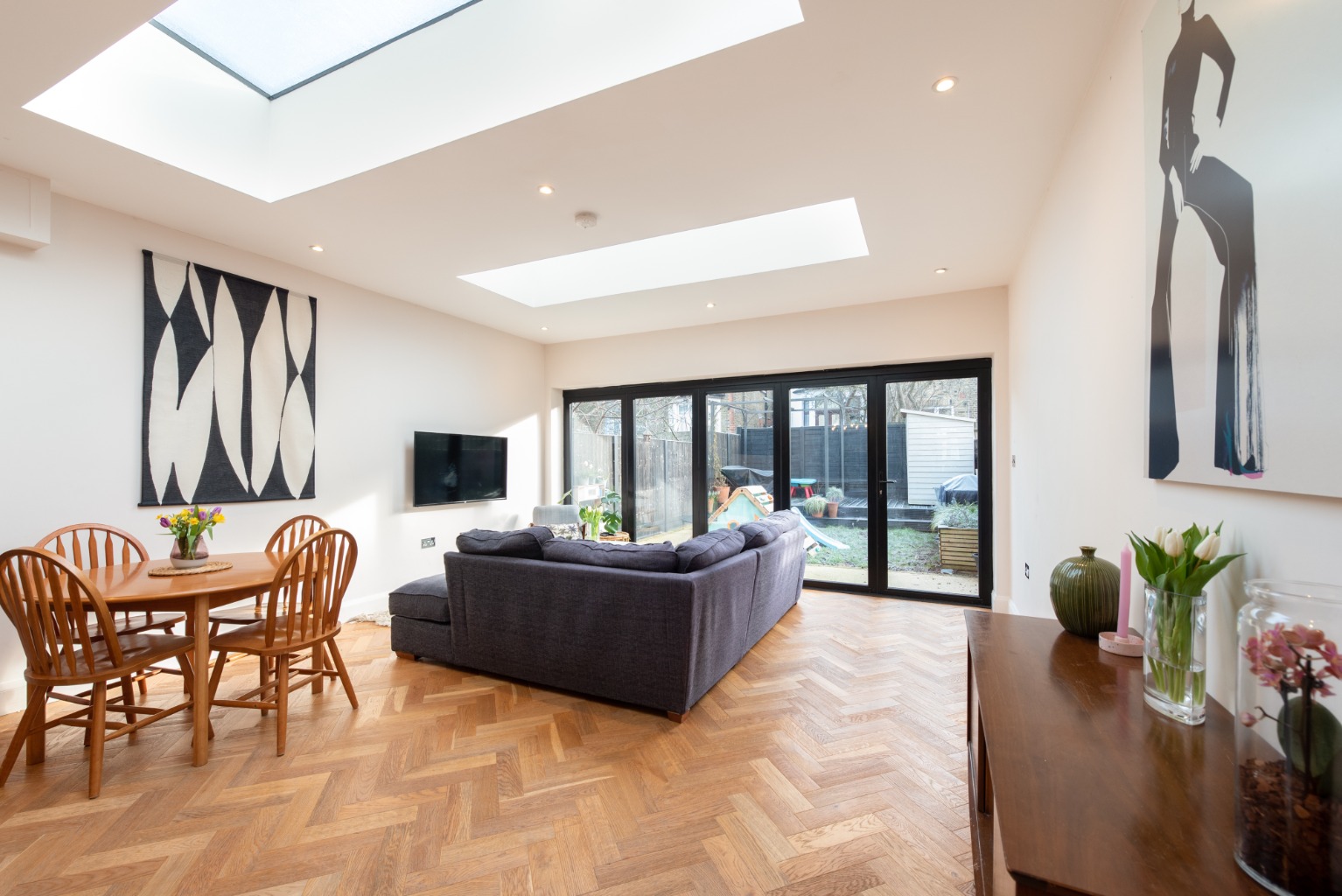 Back into the kitchen and beyond, you’ll find a substantial, flexible living space with plenty of natural light streaming in from two skylights and a set of full width bi-folding doors. As throughout the downstairs, there’s underfloor heated oak flooring, and decoration here is simple with plaster-pink walls and ceiling to allow the architecture design features to stand out. This area is easily large enough to accommodate a sizeable family dining table and have space left over for use as an informal lounge area – a real family room.