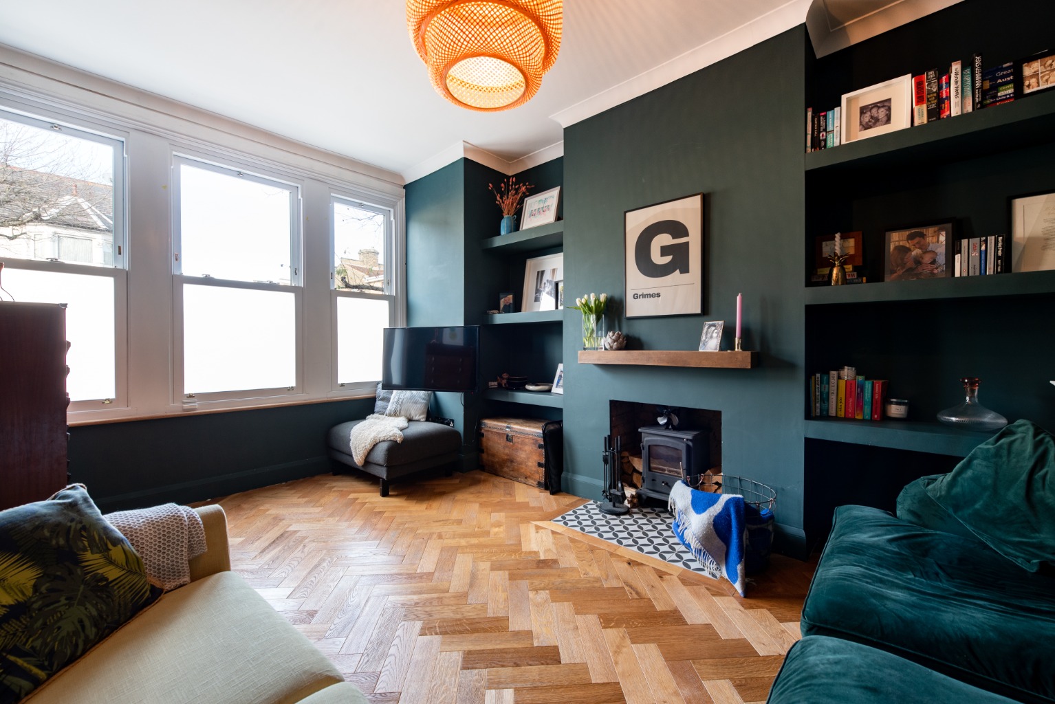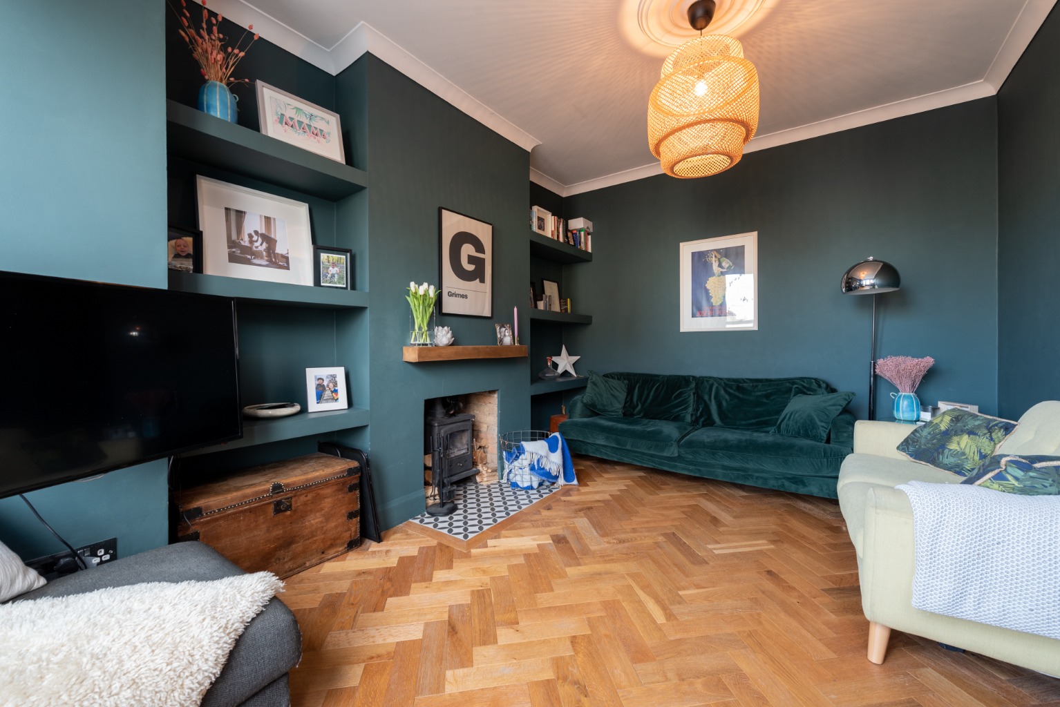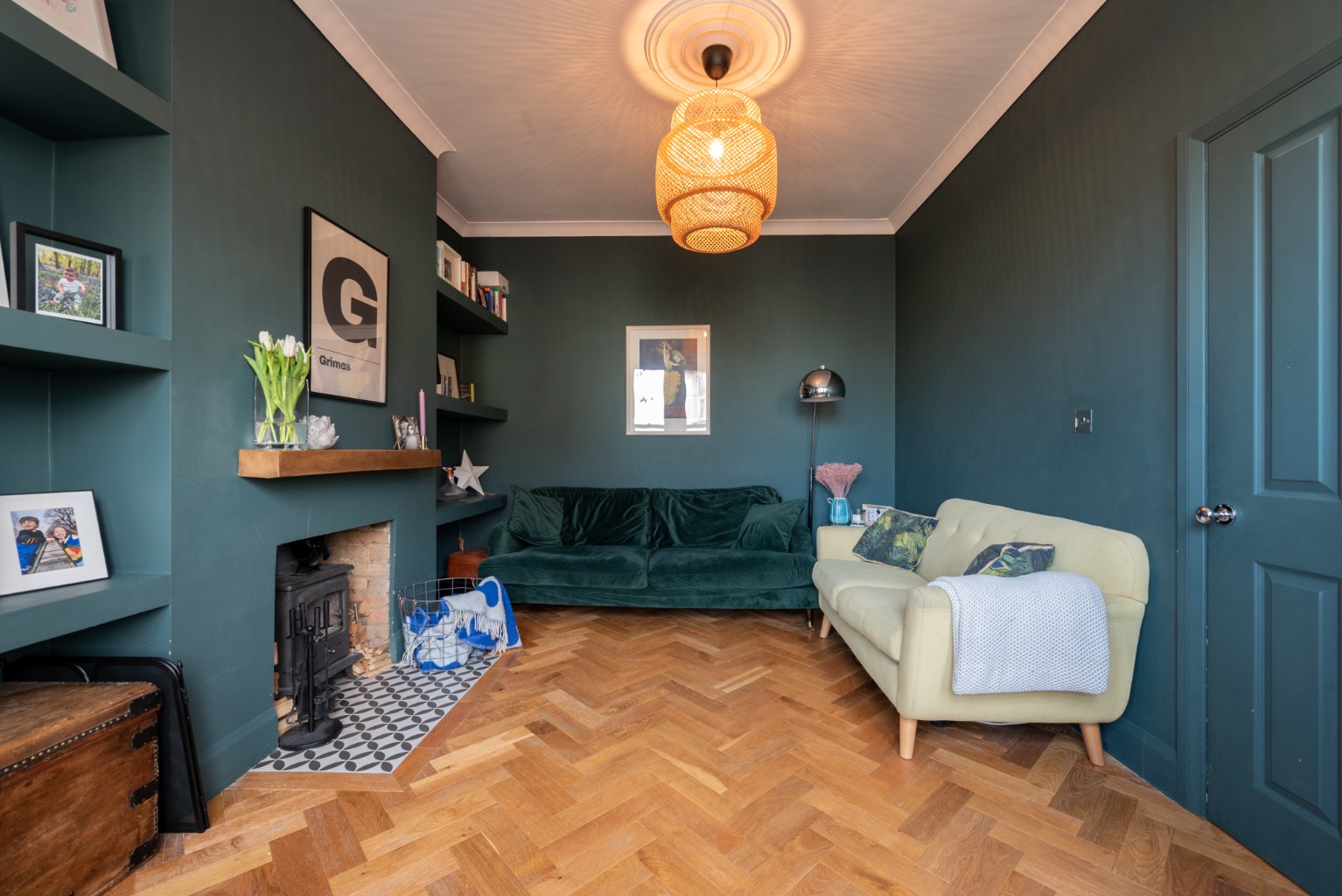The first door to the left leads you into the elegant living room. The signature dark teal has been used to striking effect in this room with walls, door and the built-in shelves in the two alcoves all being finished in this same colour to provide a stylish backdrop. There’s a wood burner integrated into the fireplace with an impressive solid oak mantel set into the wall above. The cornice and ceiling have been finished in a brilliant white to reflect the abundant natural light from the large bay window, which has modern double glazed sash windows. There’s also a tiled hearth set into the engineered oak floor.