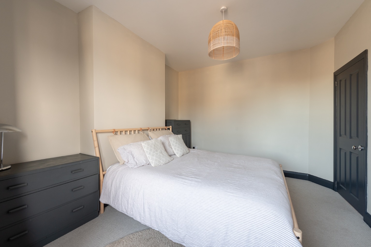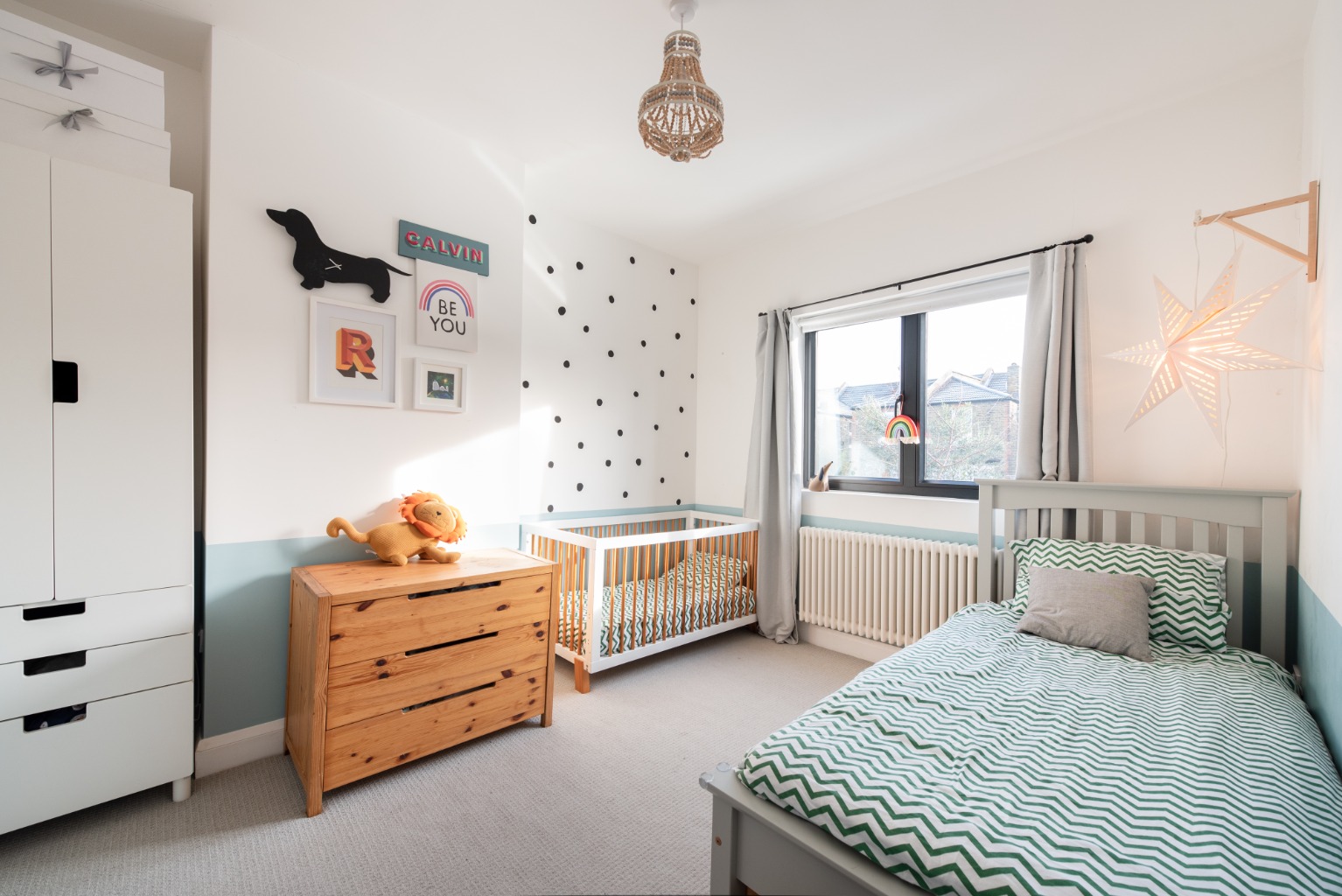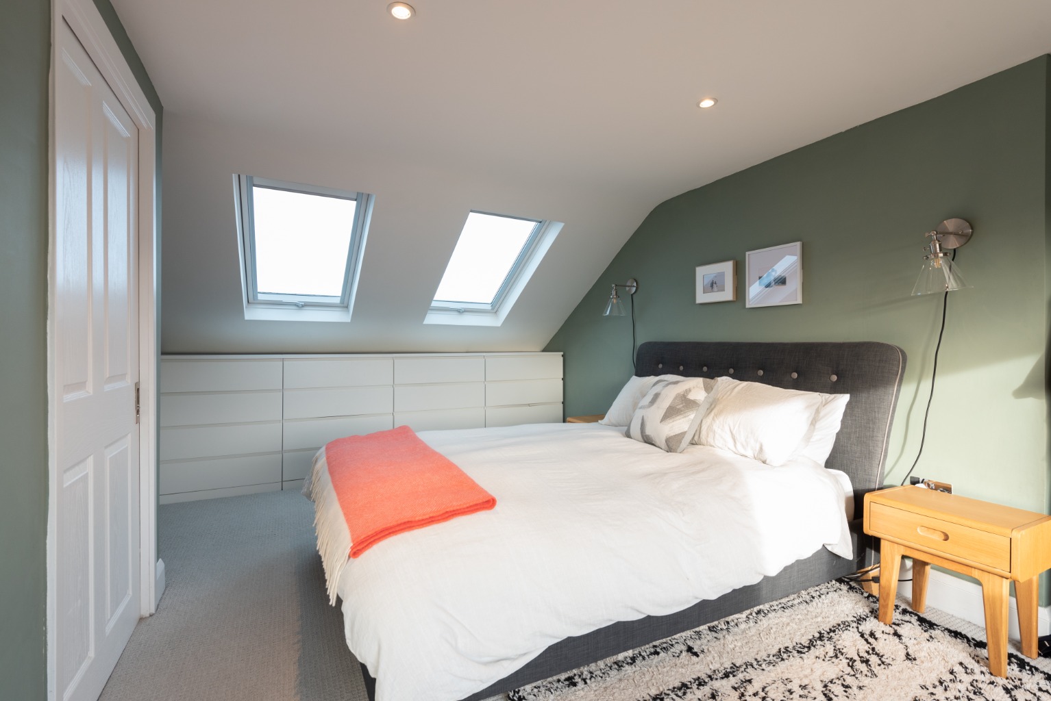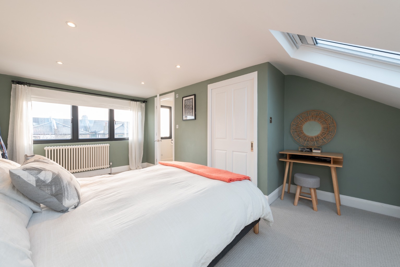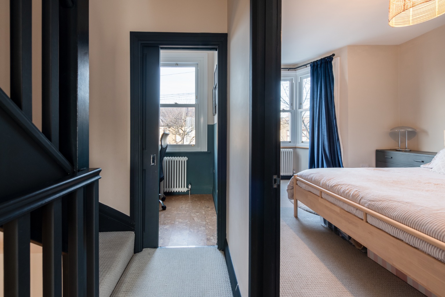 The previous owners had been here since the 1980s and had unfortunately removed many of the house’s original features. Whilst not a restoration project, we were mindful of adding character to the house when we did our renovation such as installing a working fireplace in the snug and replacing the single-paned windows with UPVC sash replicas. We took part of the third bedroom for the stairs up to the loft extension, however we wanted to be able to use that space as a room in its own right, hence the sliding pocket door. There is enough space for a large desk or small cot and it remains a cosy room with a lovely view onto the street.