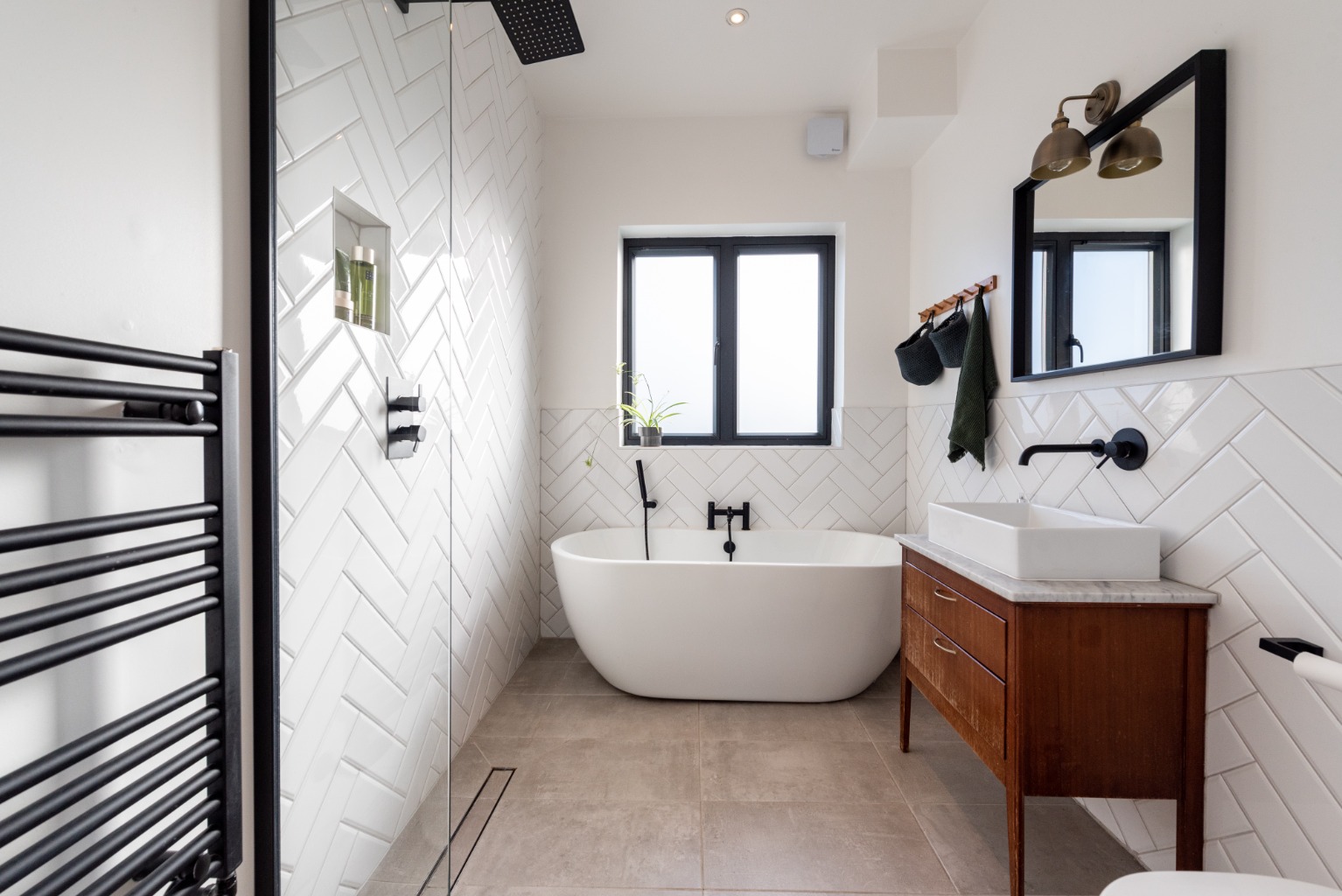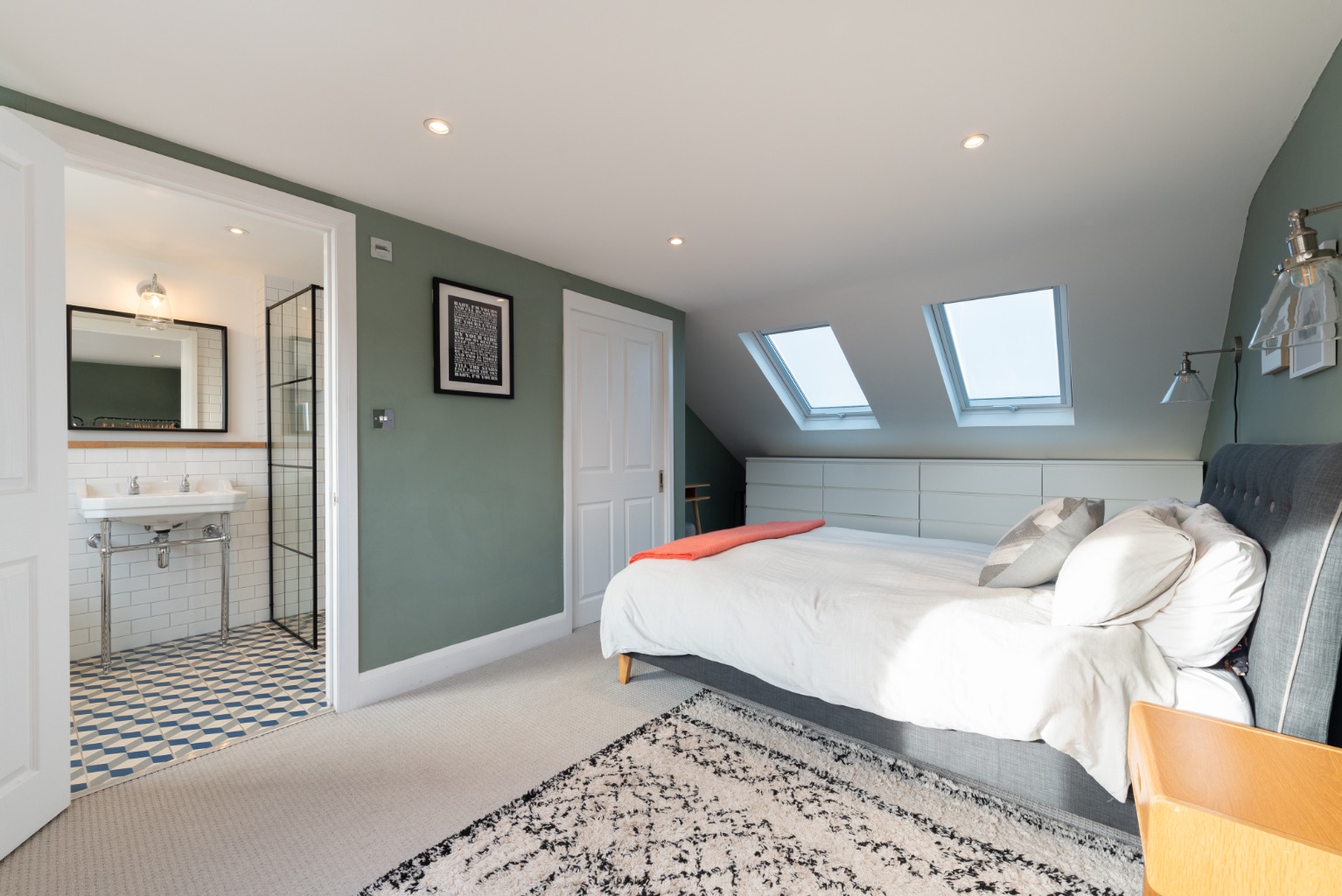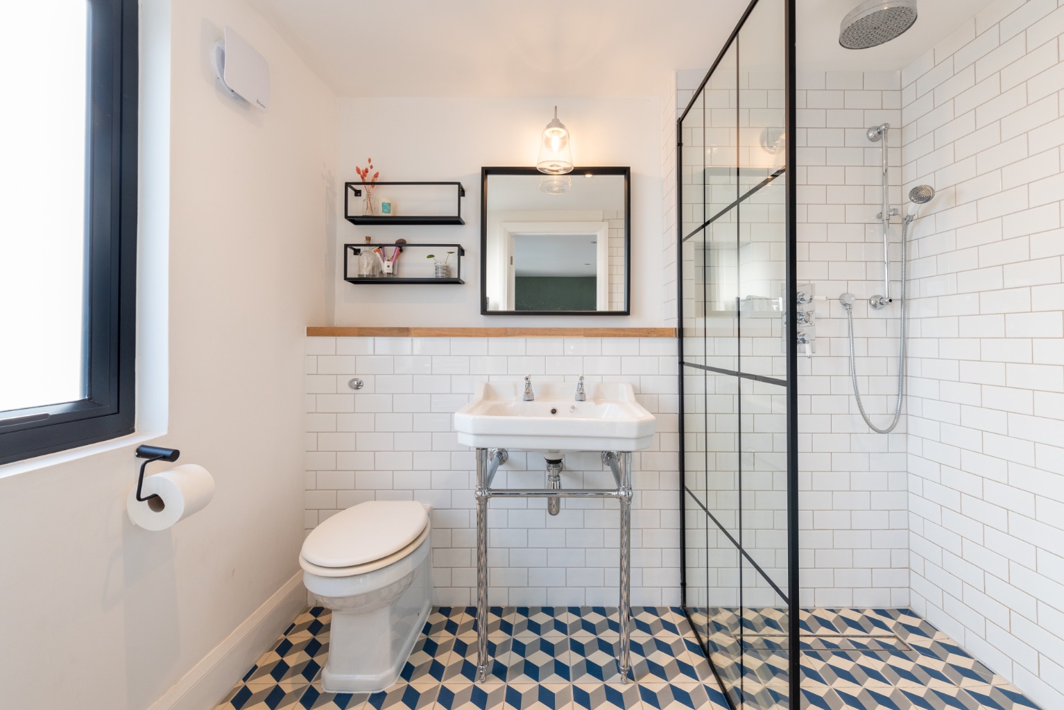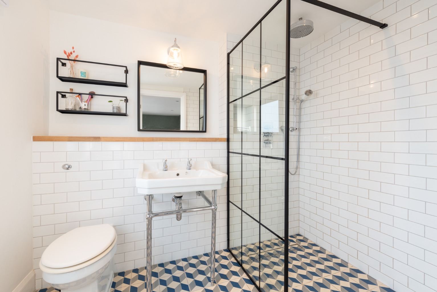 The surprisingly spacious en-suite shower room has been well thought out and includes a Victorian style WC and large hand basin alongside a large walk-in shower which has a stylish industrial-look black framed glass screen. White tiles in a running bond pattern are used to full height in the shower enclosure and to half height behind the WC and basin. The floor has stylish geometric tiles which beautifully complement the rest of the fixtures and fitting in this luxurious space.