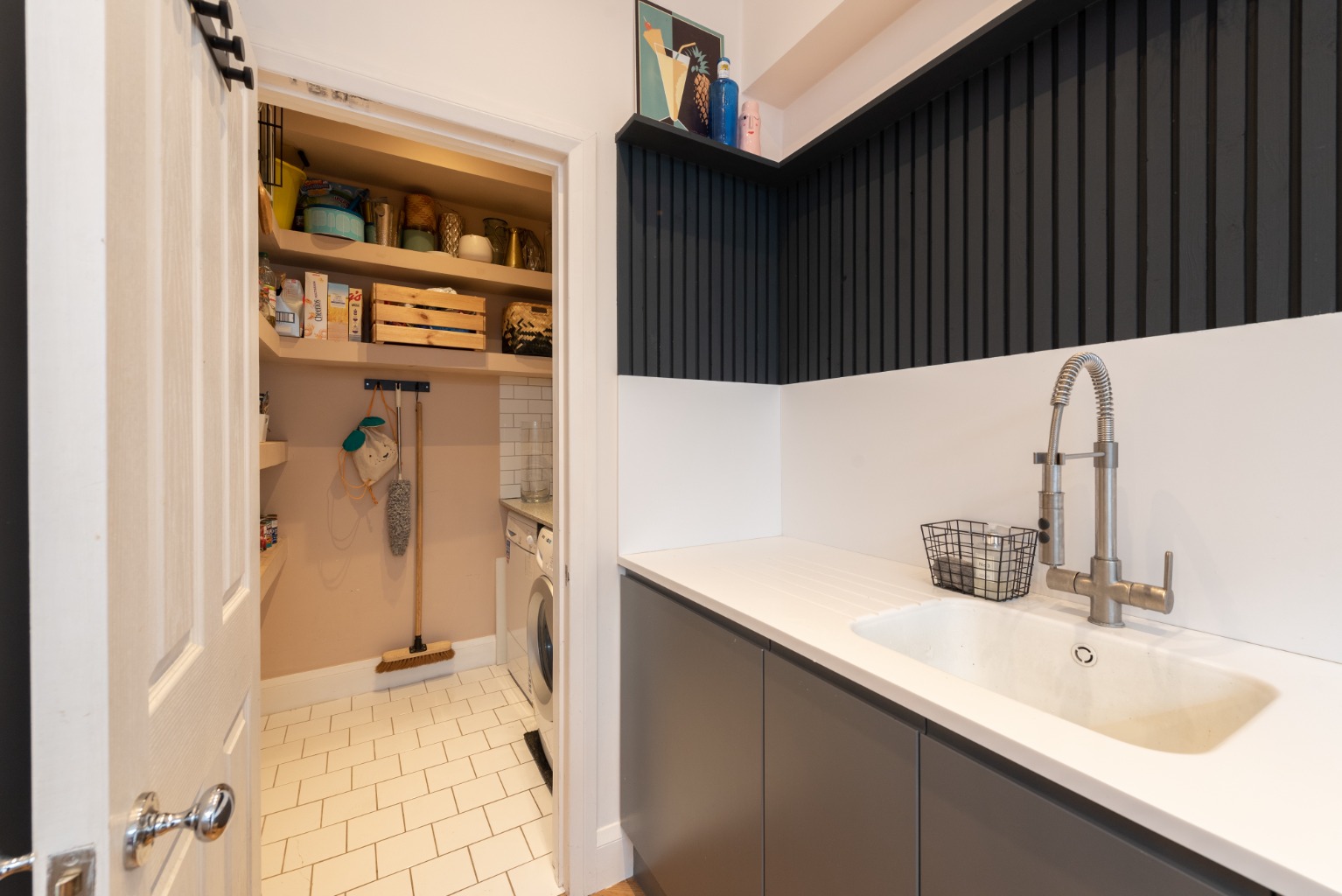 The next door on the left provides access to the large downstairs WC, an unusual but welcome feature in a property of this type. There’s a white two piece suite, comprising of a low flush WC and hand basin with stylish mixer tap, set against a half height white tiled wall with a useful full width shelf above.