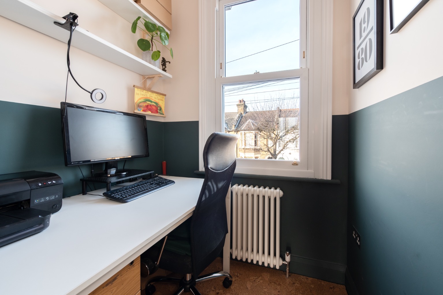 The last room on this floor is a room currently used as a study, which would also make an ideal nursery. Accessed via an impressively engineered sliding pocket door to maximise space, there’s a large sash window looking out to the front of the property, with another traditional style cast iron radiator below.