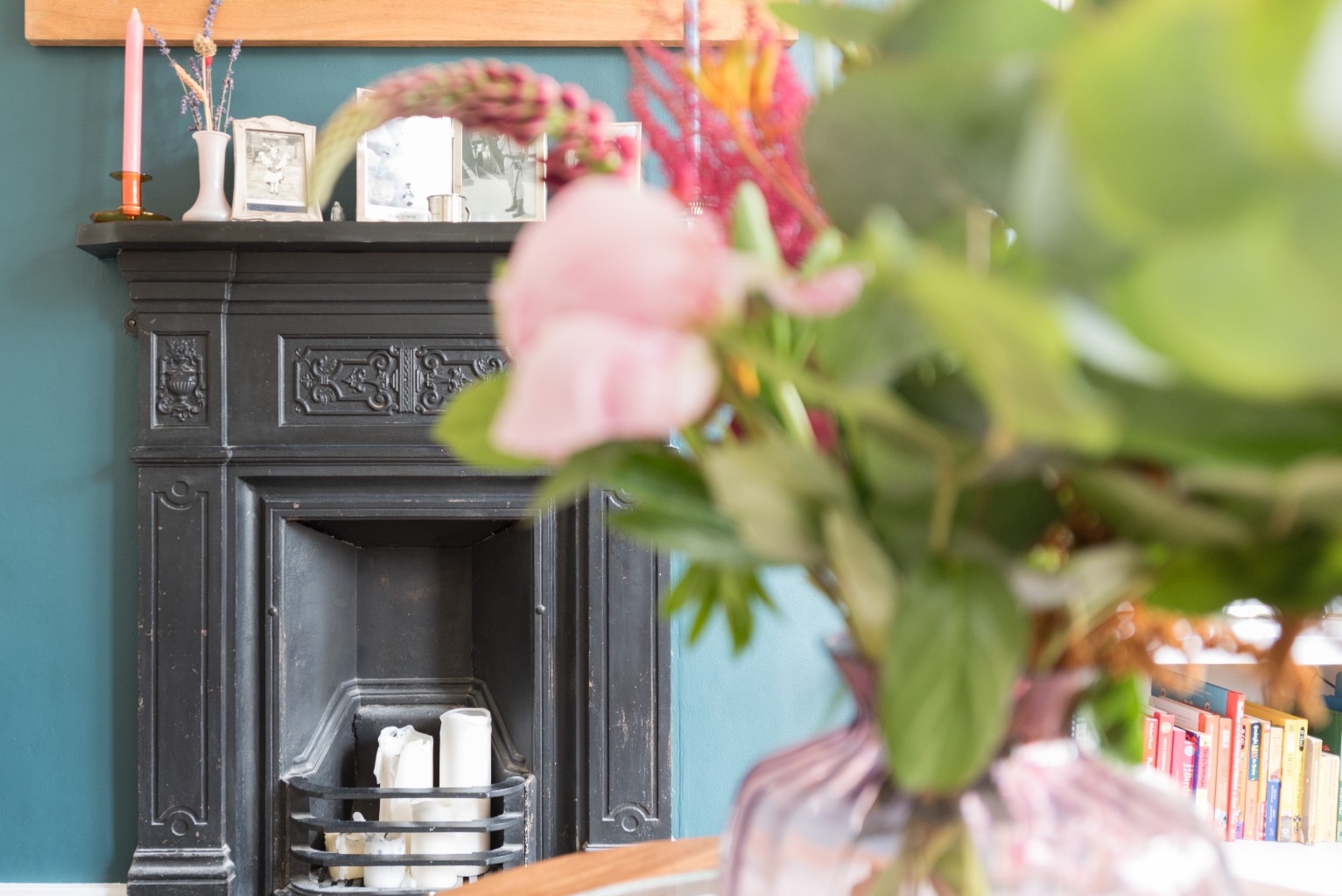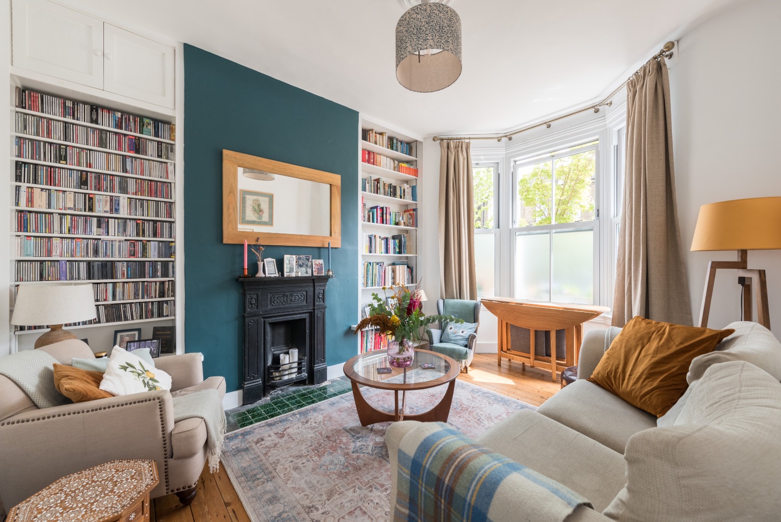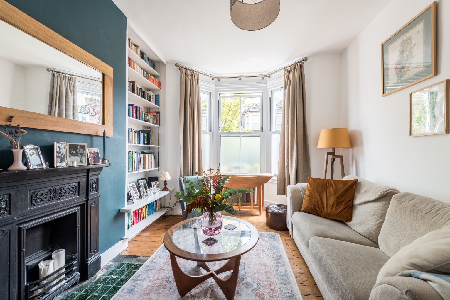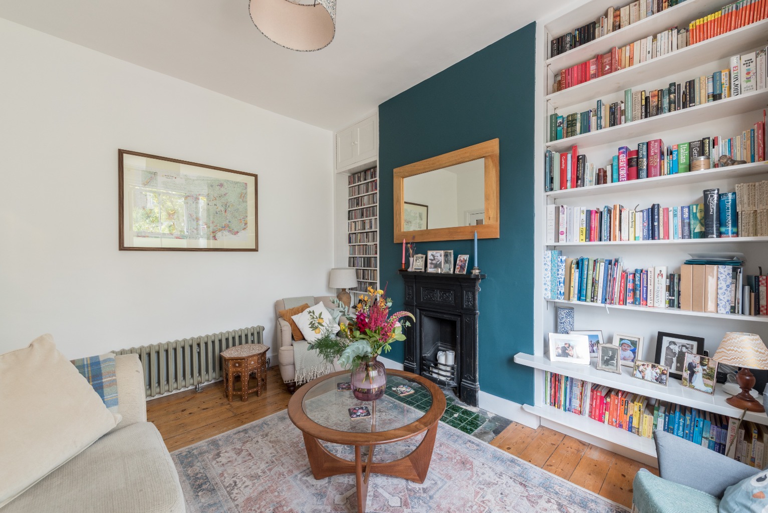 The first door to the right takes you into the spectacular living room. With its wonderful bay window, period cast iron fireplace, large ornate radiator and well-designed built in storage, this is a room that you will be proud to entertain in when you’re feeling sociable and will be a lovely peaceful retreat when you just want to curl up with a good book. Decoration is cleverly simple with predominantly white walls and a striking, contrasting, dark teal chimney breast which serve to highlight the room’s delightful features and impressive ceiling height. Original floorboards which have been lovingly restored are a perfect finishing touch. The bay window is a perfect spot for a dining table to host cosy dinner parties for friends and family, or perhaps a chaise to relax on after a busy day.