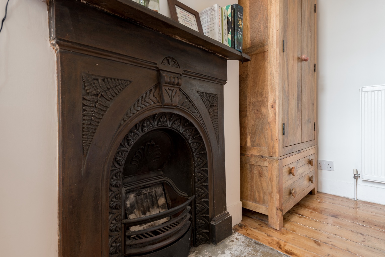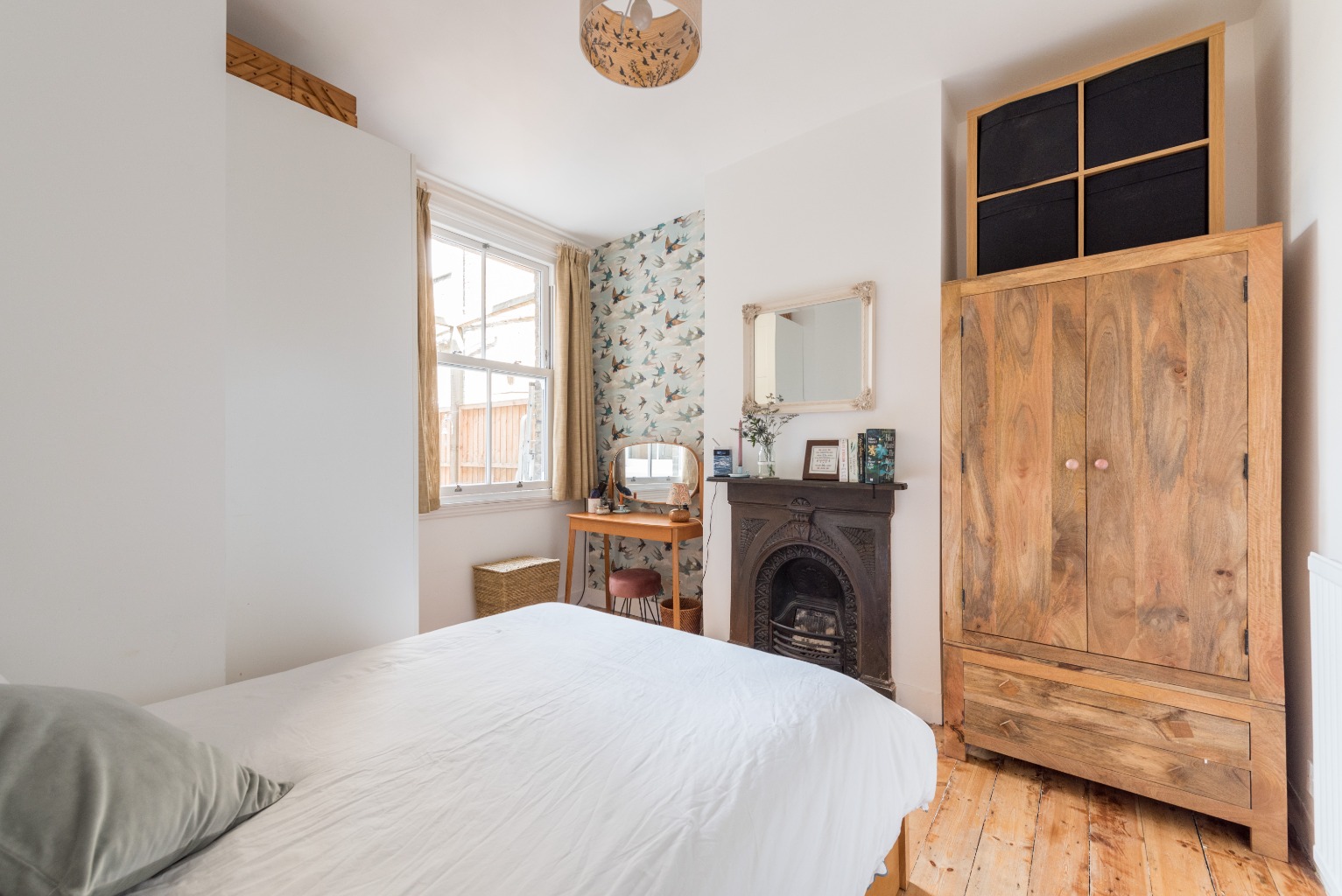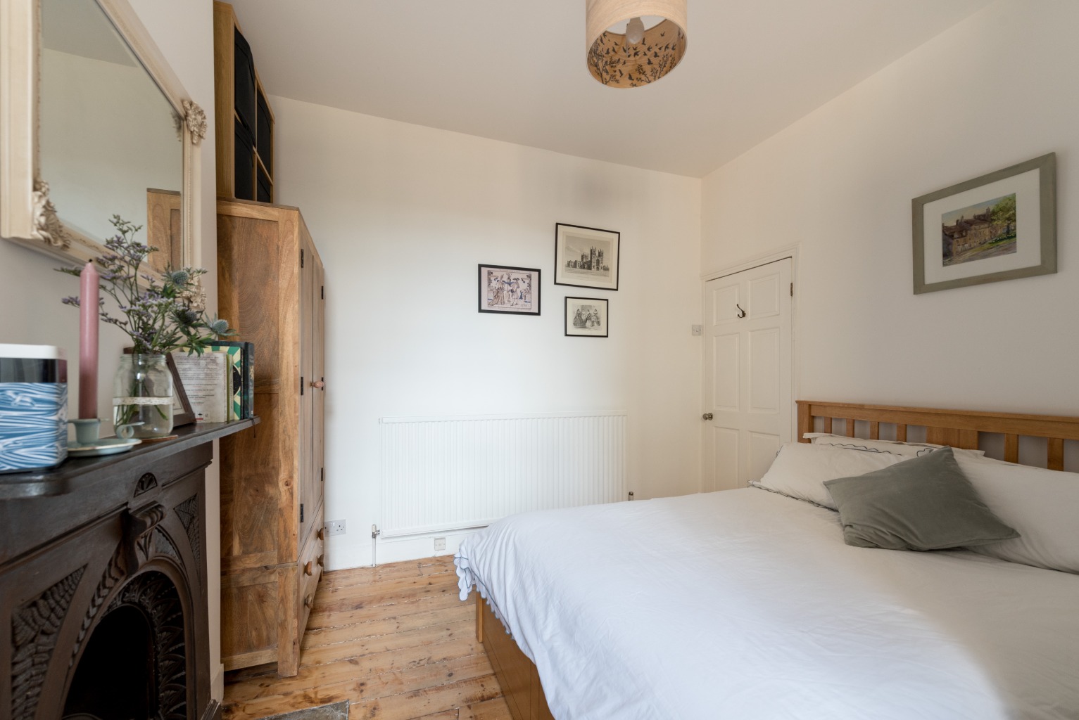 Return to the hallway and the next door, again to the right, takes you into the attractive main bedroom. More stunning features adorn this room, including original floorboards, a cast iron fireplace with stone hearth, and a lovely window looking out onto the private rear garden. The walls are once again mostly painted in white to maximise the light, with the alcove the left of the chimney breast decorated with a stunning bird motif wallpaper – an ideal nook for a dressing table. The chimney breast itself would be the ideal location for a stylish mirror or impressive art piece with your favourite ornaments displayed on the mantelpiece below. The addition of some stylish rugs would enhance the already luxurious feel, and together with the large radiator and the room’s location to the rear of the property, you’ll be guaranteed a cosy, peaceful night’s sleep.