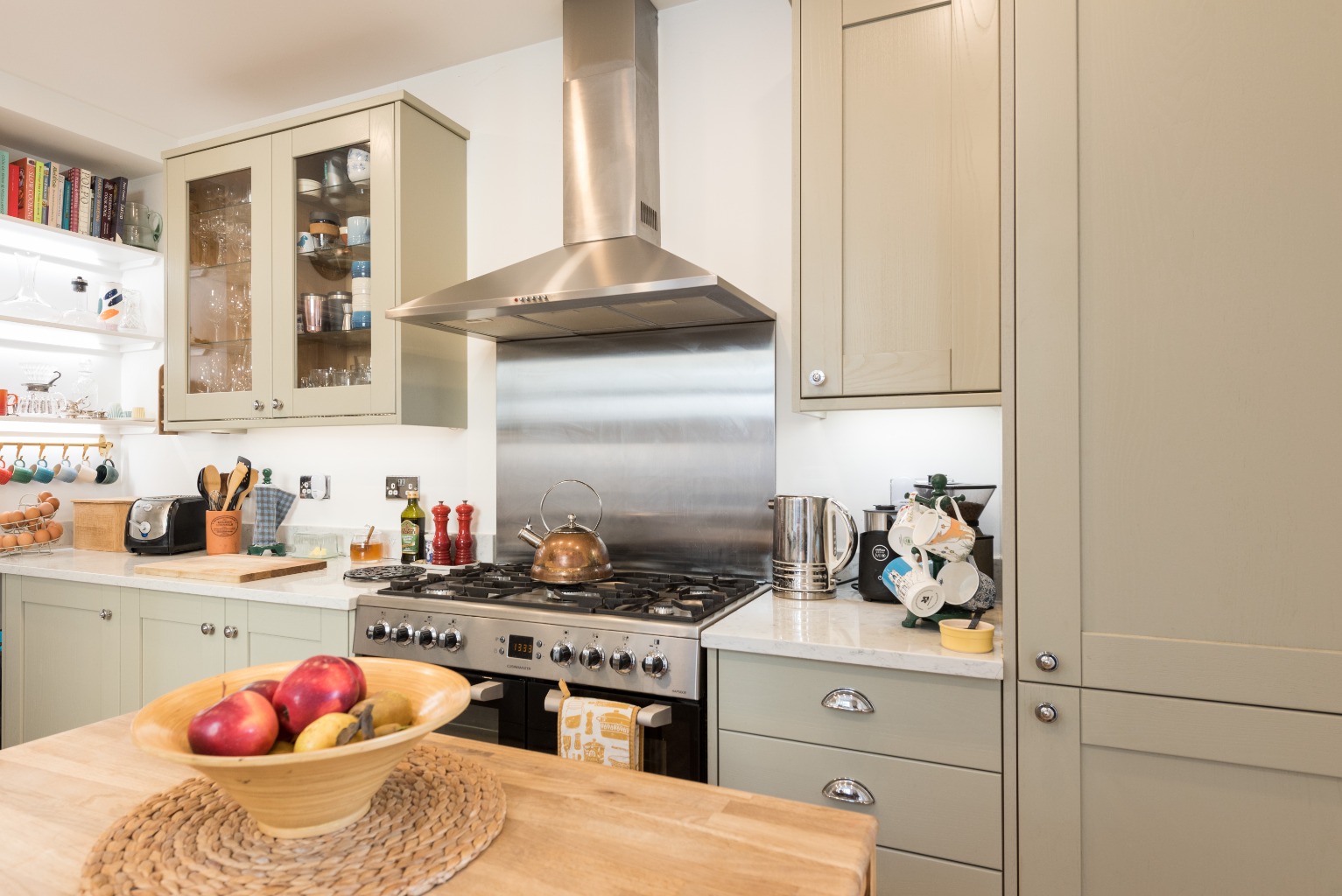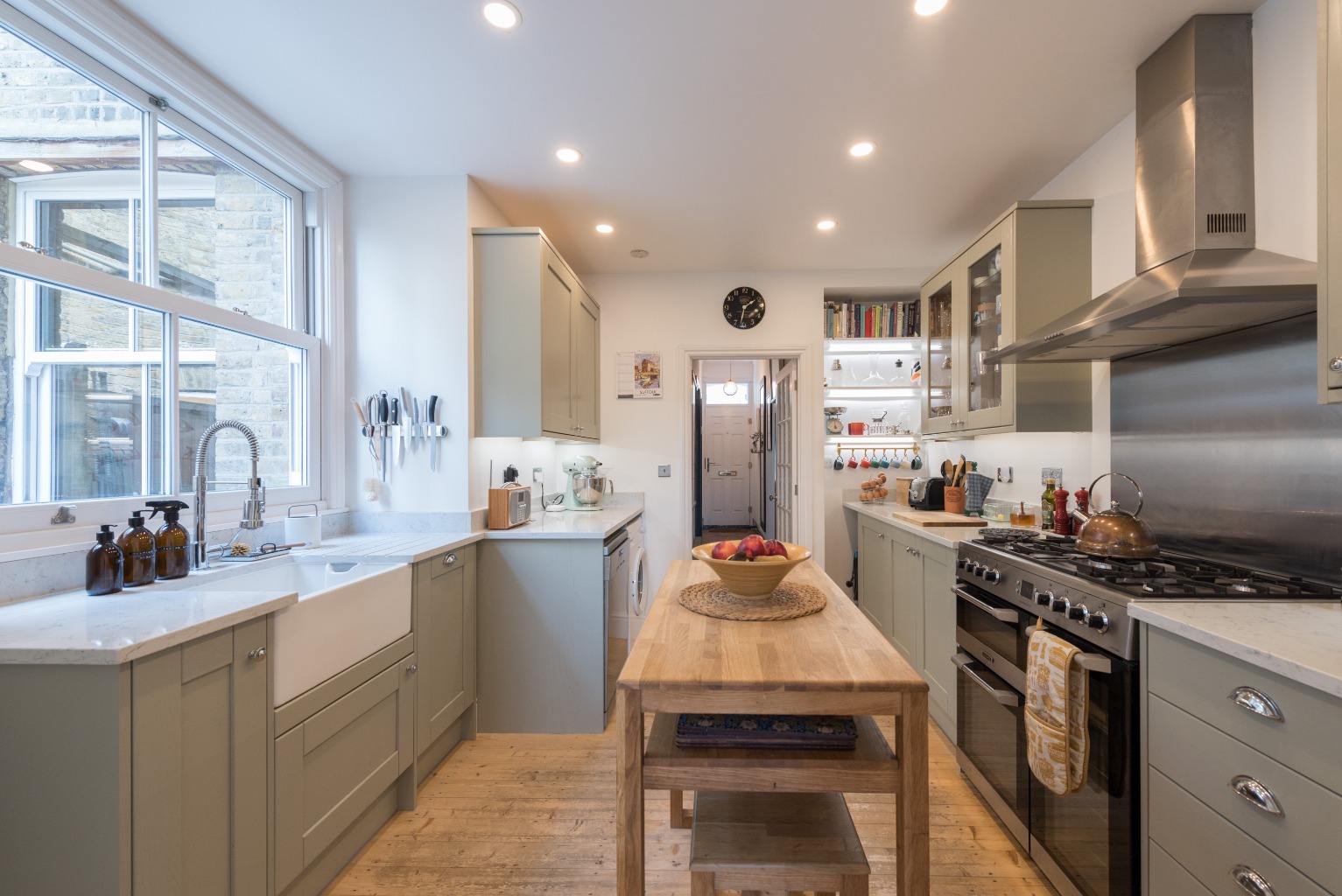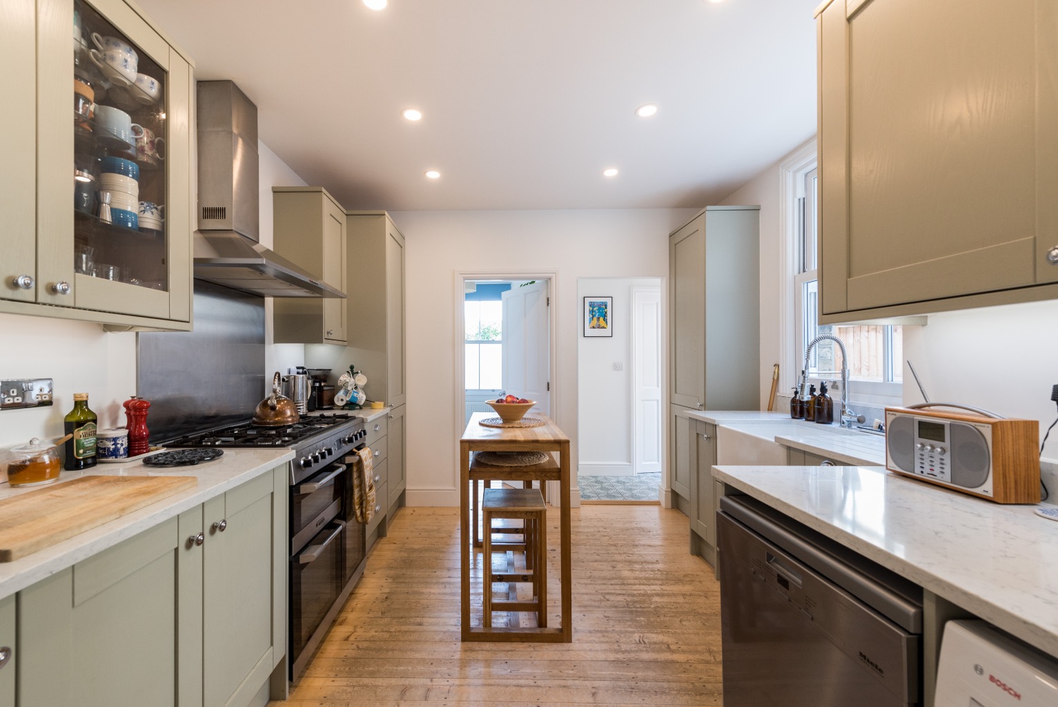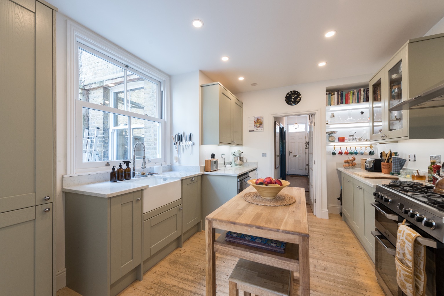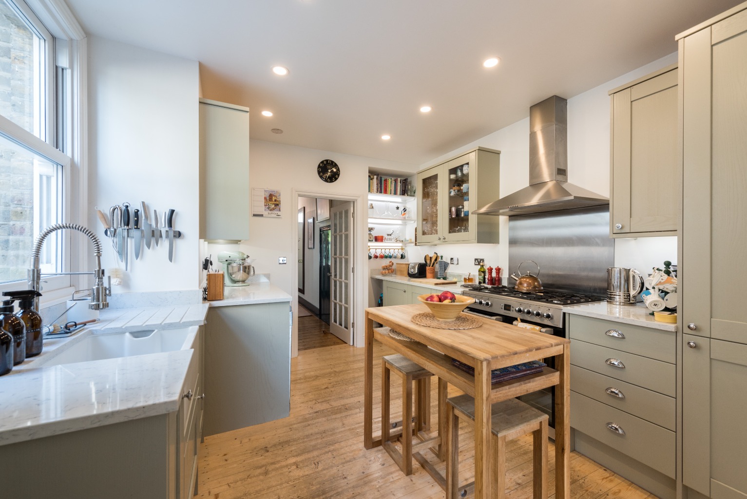 No expense has been spared in creating this cleverly designed, bespoke masterpiece of a kitchen. There’s a large range of quality light grey shaker-style units with chrome handles and high quality granite-effect composite countertops. The impressive Belfast sink under the large sash window, with designer mixer tap and the drainer cleverly integrated into the work surface, is a triumph of thoughtful planning. The integrated fridge-freezer ensures that the beautiful lines of the cabinetry are not unnecessarily disturbed, while the large Cuisinemaster range cooker with five-burner gas hob, double oven and separate grill - together with a stainless steel backsplash and stylish extractor hood - would delight any professional chef. Well maintained hard-wearing floorboards are a clever choice in this busy household hub, and the room is larger than you would expect in this type of property… wide enough to accommodate a small free-standing central island or breakfast table. All of this alone would make for a stunning kitchen to be proud of, but it’s the clever design touches that really set this room apart. Cleverly lit shelves in an alcove provide storage to display those quirky, antique fair finds or treasured glassware, while also including room for your cookery books which will help you to maximise the potential of this space. One pair of wall cabinets has glass doors which adds additional display space, and all the wall units have under-cabinet lighting to provide excellent illumination for your work surfaces. The pull handles on the drawers are a different style to those on the cupboards but of the same chrome finish, with the light switches and sockets to match. This kitchen could easily grace the pages of a design magazine.