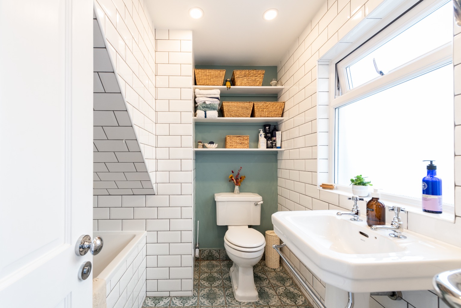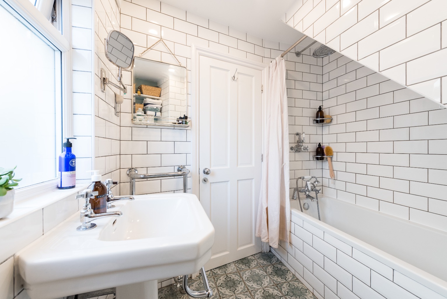 We’ll explore the bathroom first, which is another designer’s dream. More than just a space for your essential ablutions - clever planning, attention to detail and fixtures and fittings of the highest quality combine to make this a lovely space to spend time grooming or enjoying a luxurious soak in the bathtub. The white porcelain bathroom suite includes a large Edwardian style basin, a matching WC with traditional cistern and a deep bathtub suitable for those long luxurious soaks, and also equally accommodating for a quick refreshing shower. Exceptional quality plumbing fixtures are all Edwardian in style to match the rest of the room, with a chrome finish and white porcelain highlights, including a mixer tap with shower attachment on the bathtub and a separate high level shower head with its own controls. White ceramic tiles are used throughout in an attractive running pattern, with contrasting charcoal grout for a striking finish. There’s handy built-in shelving above the WC, a double glazed window and a stunningly unusual combined radiator and towel rail which matches the other fixtures in the room.