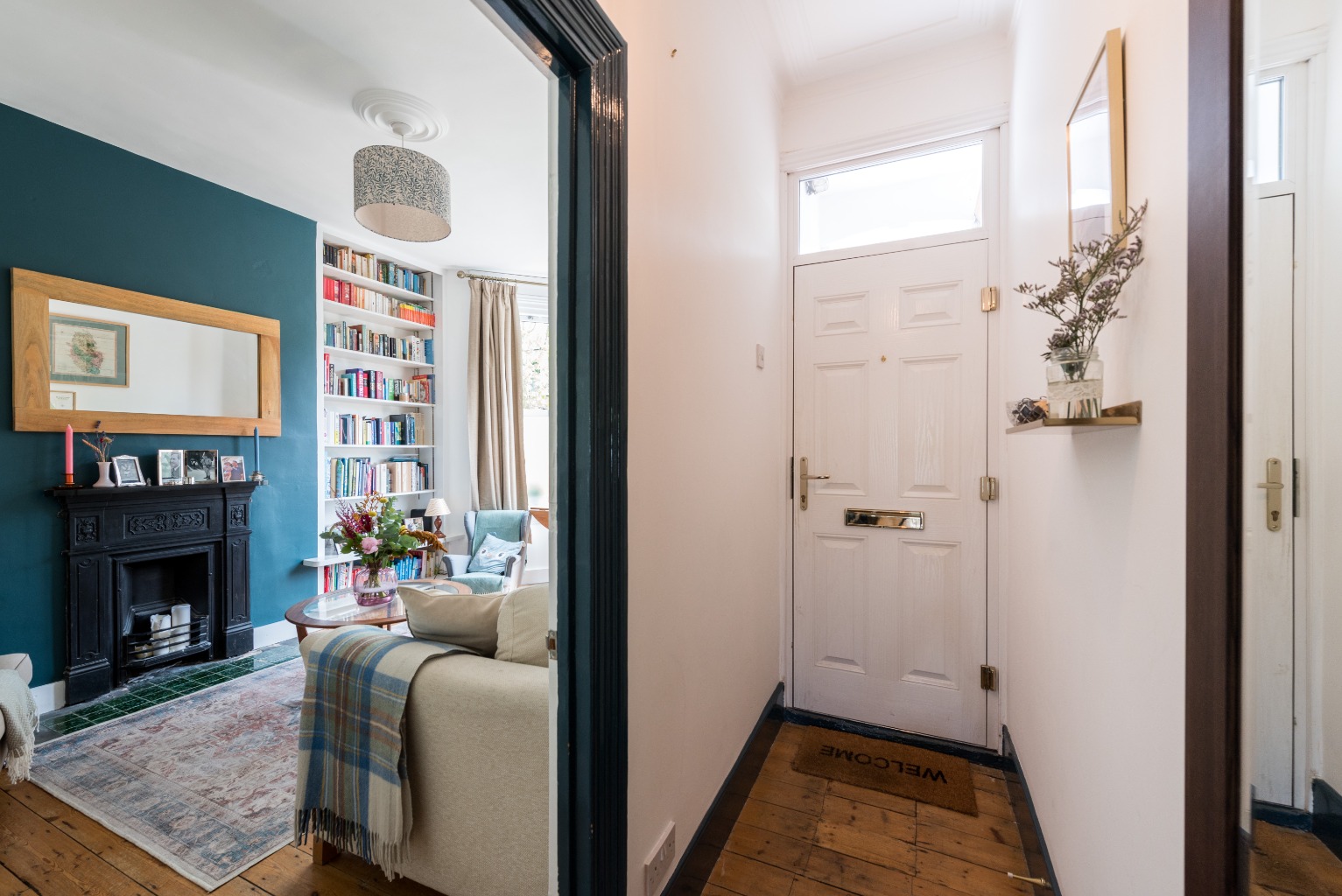 From the porch open your private, blue-painted front door into the impressive hallway. The door is of composite construction ensuring maximum security with minimum maintenance. The hallway is flooded with natural light from a transom window above the front door. There are high ceilings, original floorboards, an elaborate cast iron radiator and an attractive high quality light fitting which together set the tone for the rest of this wonderful property. The dark interior door trims contrast strikingly with the white walls, which will provide a perfect background to show off your favourite artworks.
