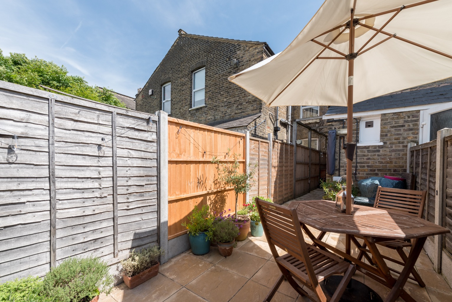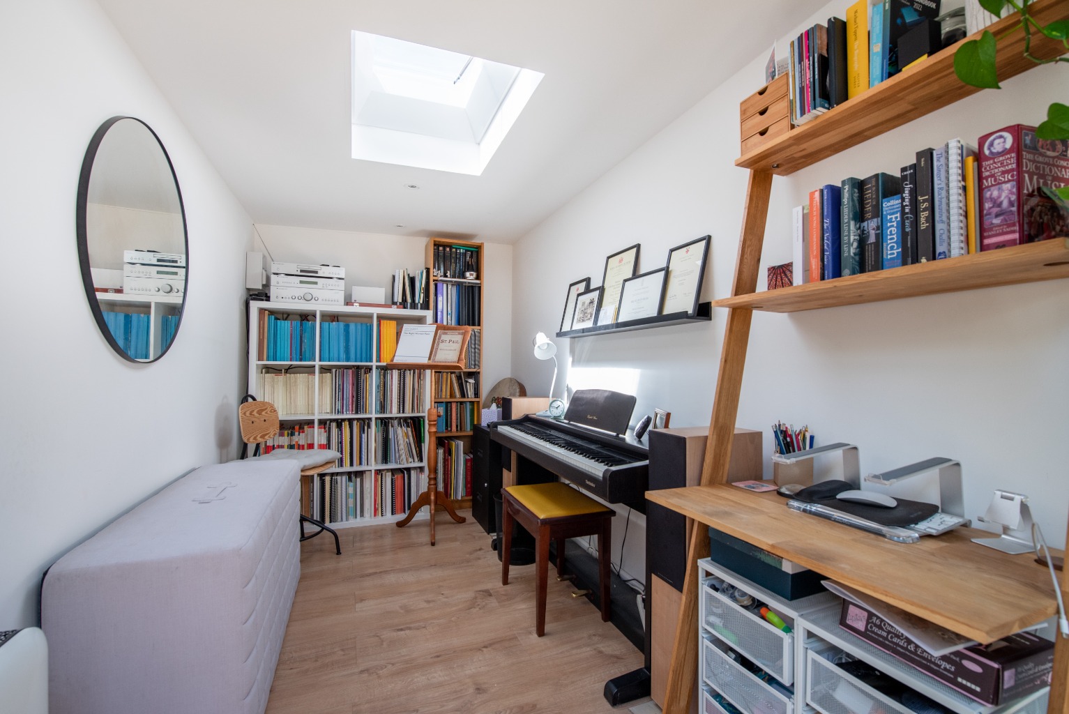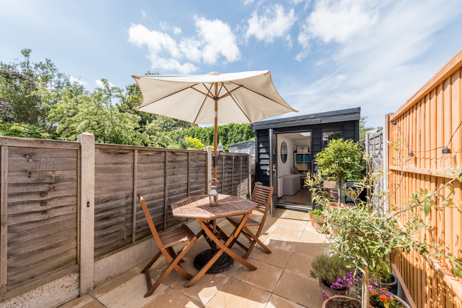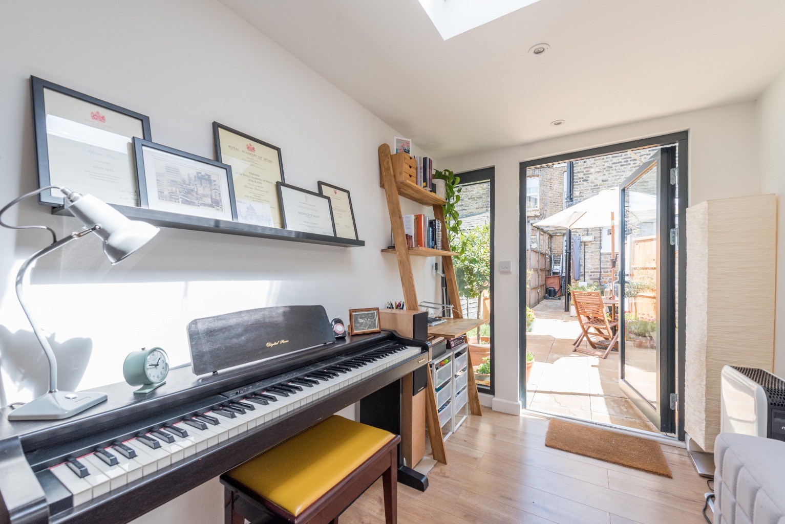 Let’s move out to the garden now, via the rear lobby, where you’ll find a lovely private paved sun terrace with plenty of room for outdoor lounging, dining and entertaining. Beyond the terrace is a fabulous garden room measuring over 11 x 6 feet, currently used as a music room, but, with its clever skylight, would equally make an ideal artist’s studio, home office or hobby room. This is a high quality, well insulated structure, with lighting and power, suitable for use year-round. Simple white-painted walls and timber floors echo the design of the rest of the property: smart, modern and sophisticated.