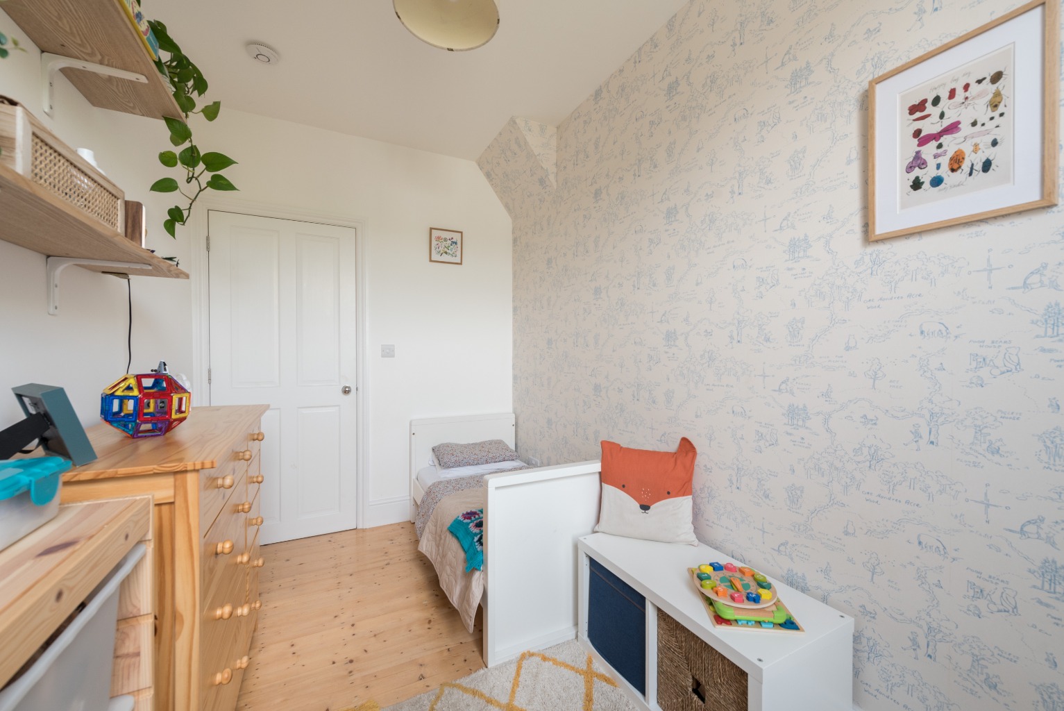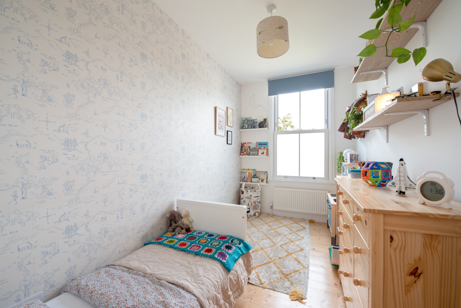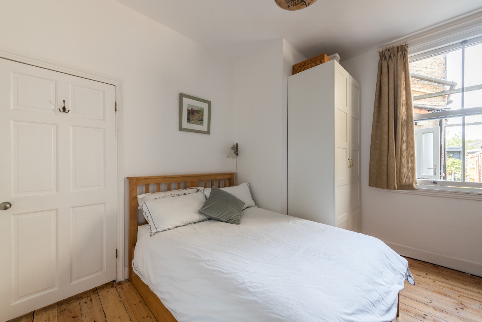 At the far end of the kitchen, you’ll find 2 doors, we’ll open the one to the left first, which takes you into the delightful second bedroom. With lots of natural light from the tall sash window this room is currently being used as a comfortable single bedroom, although it would accommodate a double bed or bunks, or alternatively would make a fantastic study. Timber floors continue the theme of the rest of the property and there is a lovely feature wall, papered in a sophisticated white and blue pattern. This room is at the rear of the property looking out towards neighbouring gardens, assuring that it will be a tranquil haven for sleeping or working in.