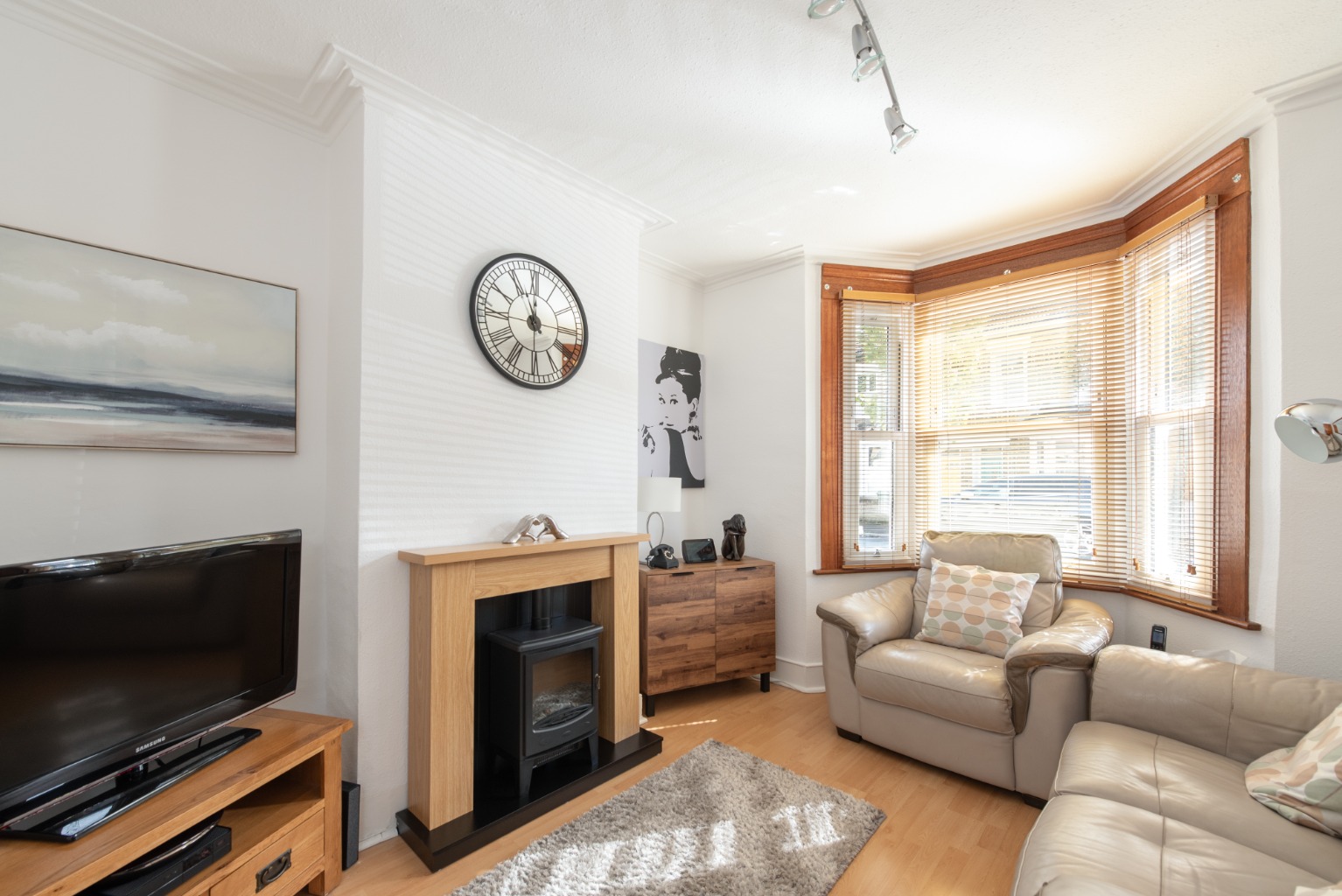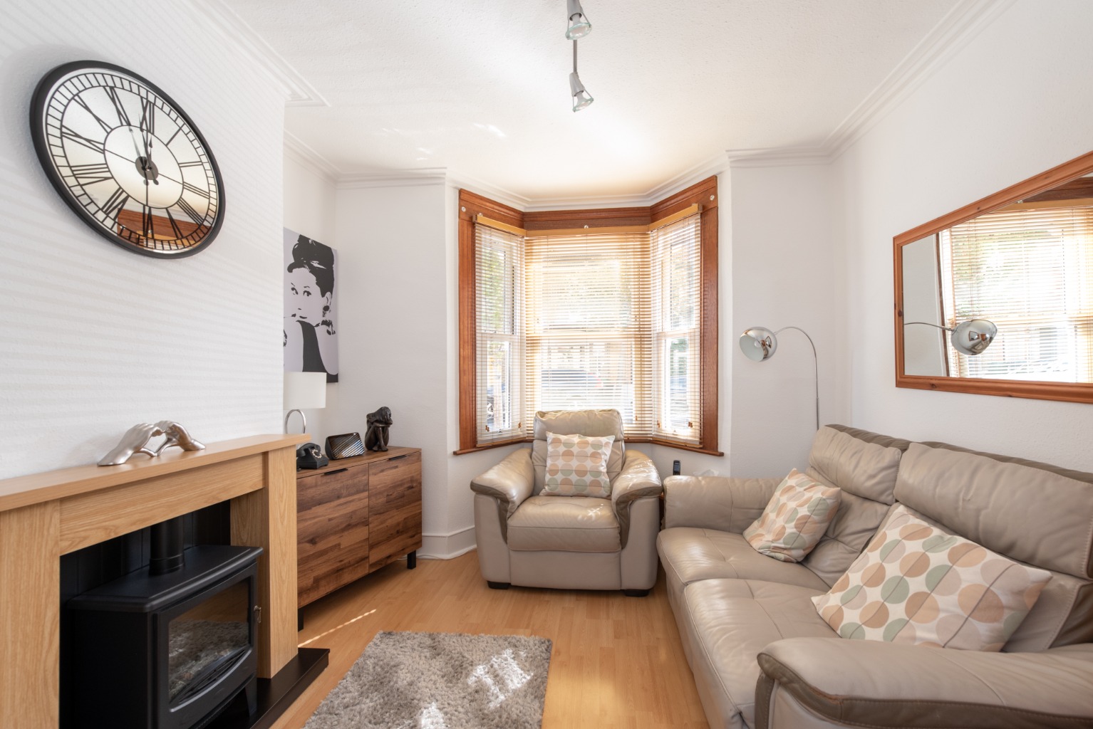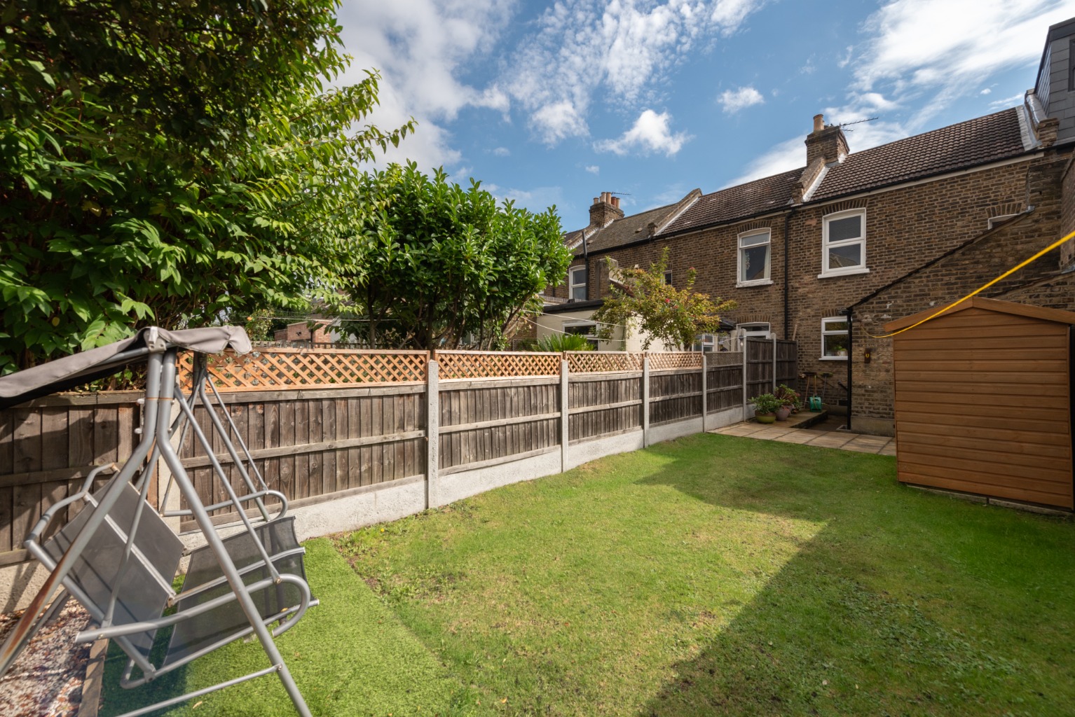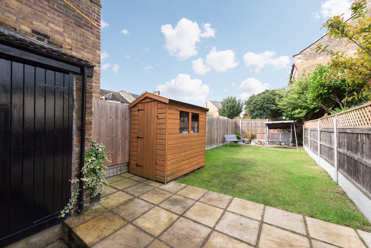 Set away from the street with a small paved yard, the attractive front door with arch above and stained glass feature opens into the hallway with reception room to the right. In the reception you’ll note the natural light entering through the bay window – which, with its wooden framing, perfectly complements the rustic door and wood-effect flooring and mantelpiece, with its cosy wood-burner effect fire. Next is the smart and stylish kitchen-diner, with a lovely spacious feel thanks to the open, integrated staircase. The kitchen offers a good range of base and wall cabinets in white, contrasted with the dark wood-effect worktops and lighter toned flooring. There’s space for all your appliances and extra storage, plus a good sized dining table for eating and entertaining. The window above the sink offers views to the garden beyond. Heading on, you enter a small lobby area with a handy storage cupboard and doors to the bathroom and garden. The bathroom is fitted with a white suite consisting of WC, sink with unit below and mirror above, and a bath with integrated shower and screen. The clean, crisp white tiles are contrasted with black trim and floor tiles. Into the garden, the side-return path and planted border leads to a useful exterior storage cupboard, before stepping up onto a paved area. This opens onto a 42ft lawn, with a garden shed and high fences for privacy and security. Upstairs, you have two good sized double bedrooms with integrated wardrobes – bedroom one at the front with its beautiful original fireplace, and bedroom two at the rear, overlooking the side return and garden. The property lies within the well-loved Francis Road area of Leyton, renowned for its small independent businesses in the beautifully preserved pedestrianised area just a few minutes’ walk away. Nearby hospitality venues include Northcote Arms, the Unity Café and the Heathcote and Star pub, plus essential amenities including supermarkets, retail parks and the many shops and supplies available on Leytonstone High Road. Leyton and Leytonstone Central Line tube stations and Leytonstone High Road Overground stations are all less than a fifteen minute walk. This area is also ideal for lovers of outdoor leisure, with some of London’s best green spaces within easy access, including Wanstead Flats, Hackney Marshes and the Queen Elizabeth Olympic Park.