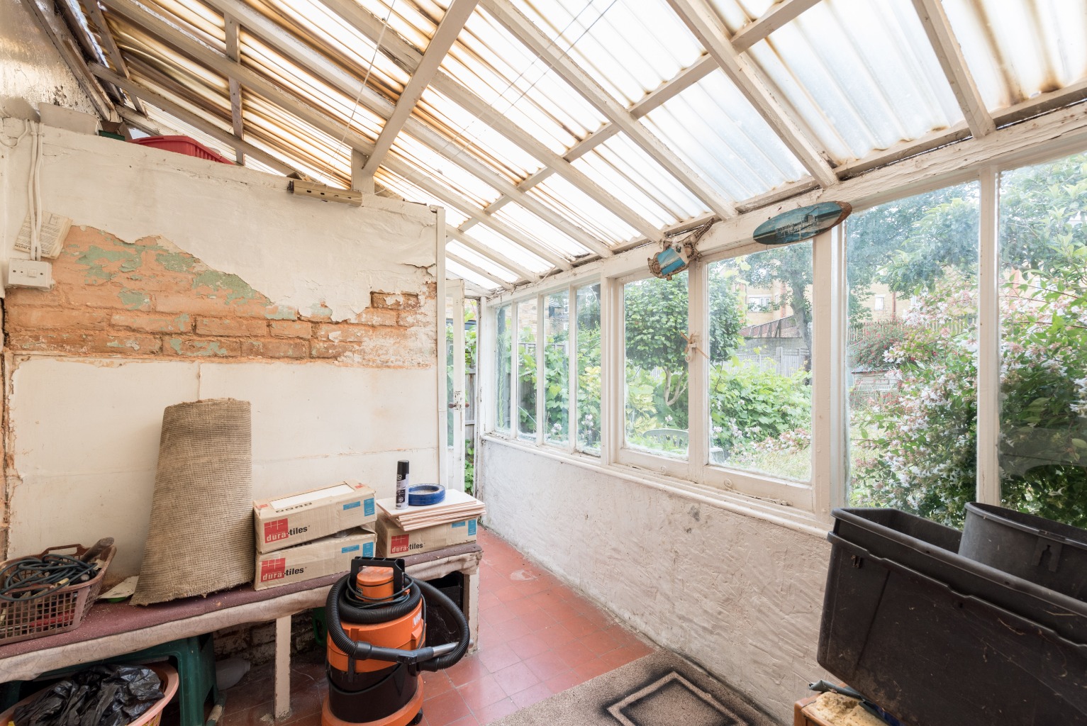 Returning to the hallway and past a beautiful curved wall feature - opposite which is some original floor-to-ceiling built in storage - is the second reception room. With its large French doors and masses of natural light, this room is perfect for a family dining area. Alternatively, it could easily be a gaming or play room, home gym or large office space. The French doors open into a rear lean-to conservatory. Just waiting for renovation, a refurbishment coupled with the correct lighting this could be transformed into a dynamic and lively entertaining area – a home bar anyone?!