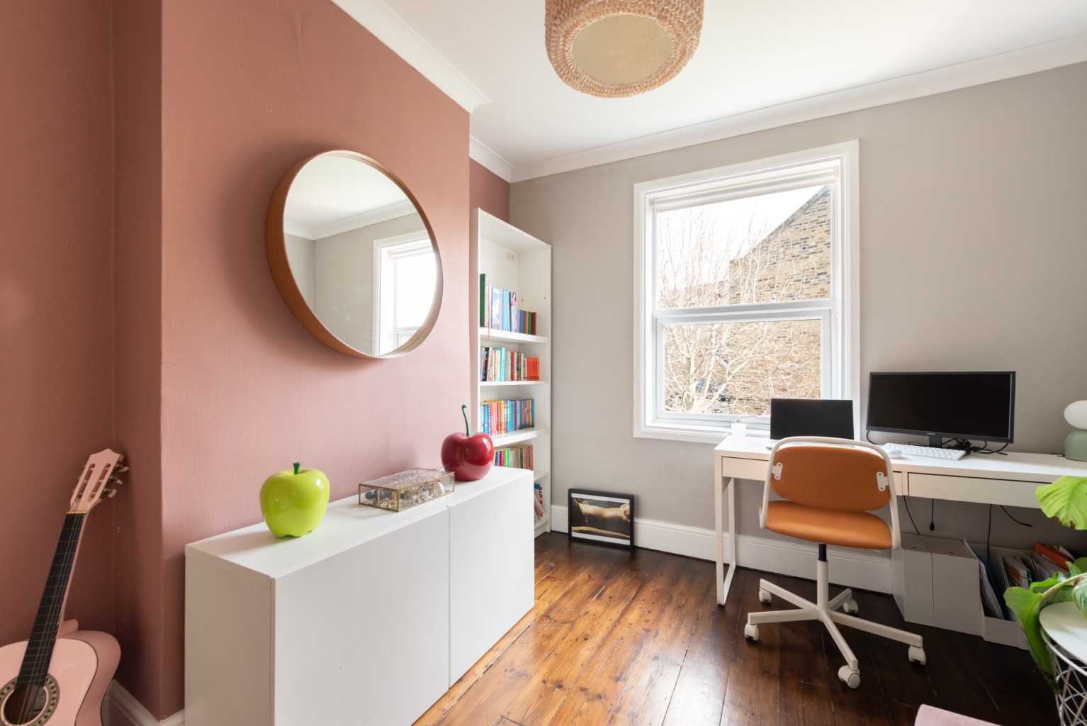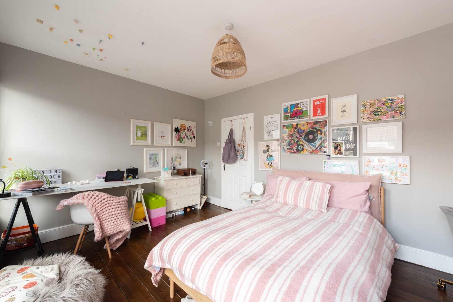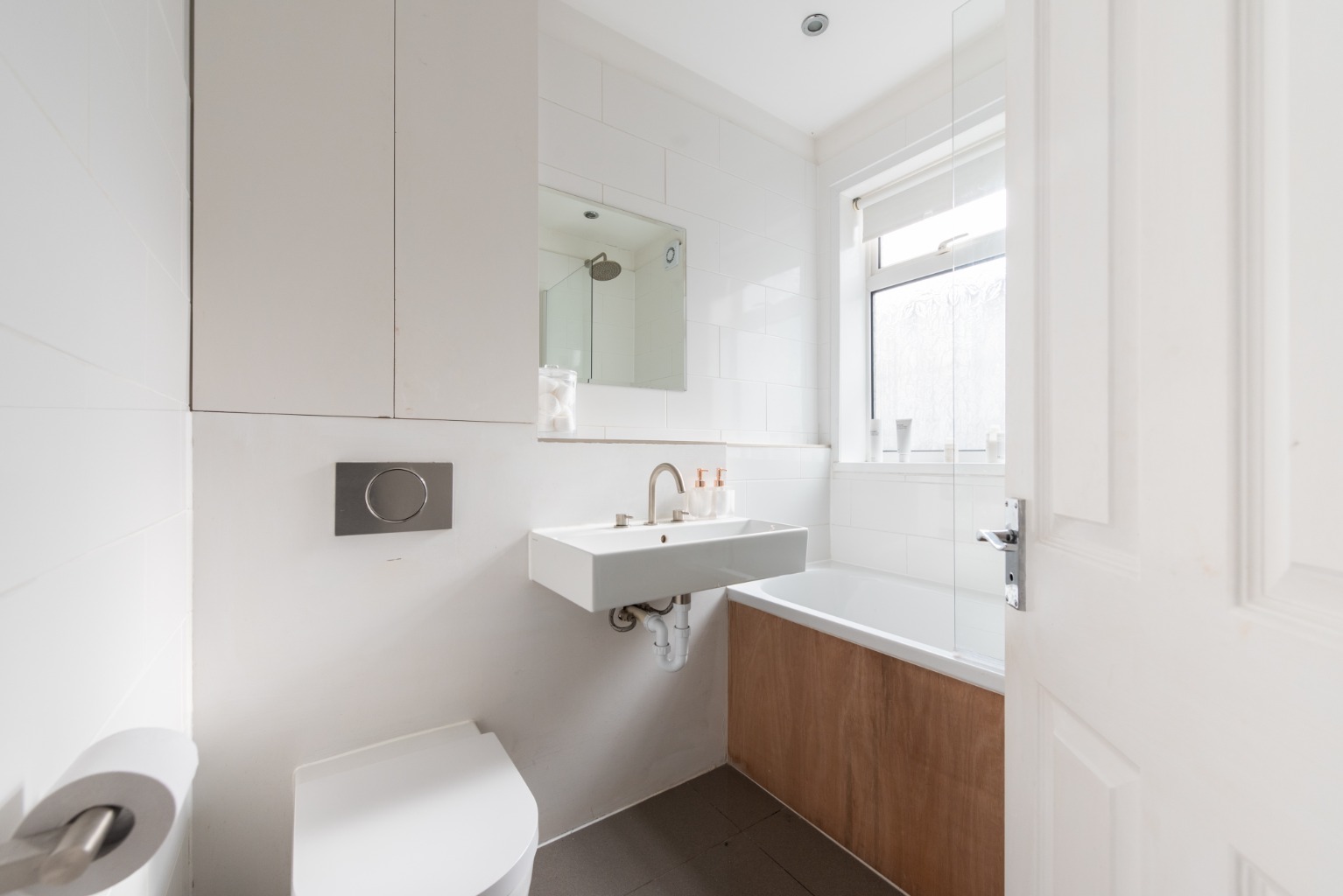 Up the stairs there’s a split-level landing providing independent access to all the first floor rooms. Straight ahead is a double bedroom overlooking the rear garden and to the right is the contemporary family bathroom, which features a three piece bathroom suite including a W.C., wall-mounted hand basin and a bathtub with a glazed screen and shower above. On the upper level of the landing there’s another double bedroom to the left, which looks out to the rear garden.