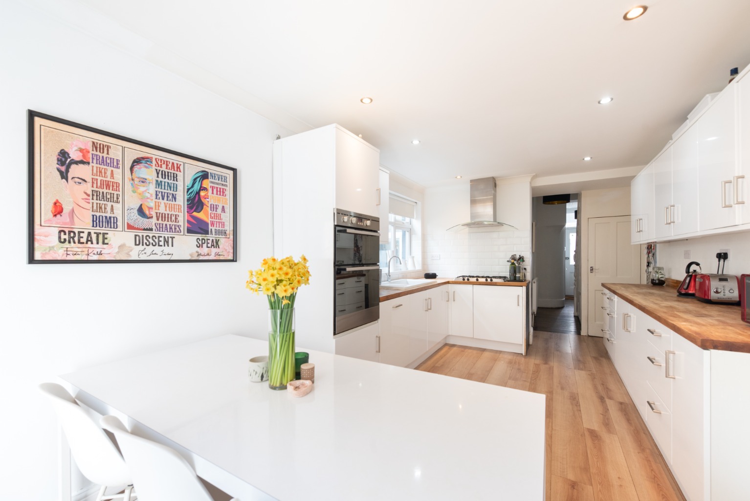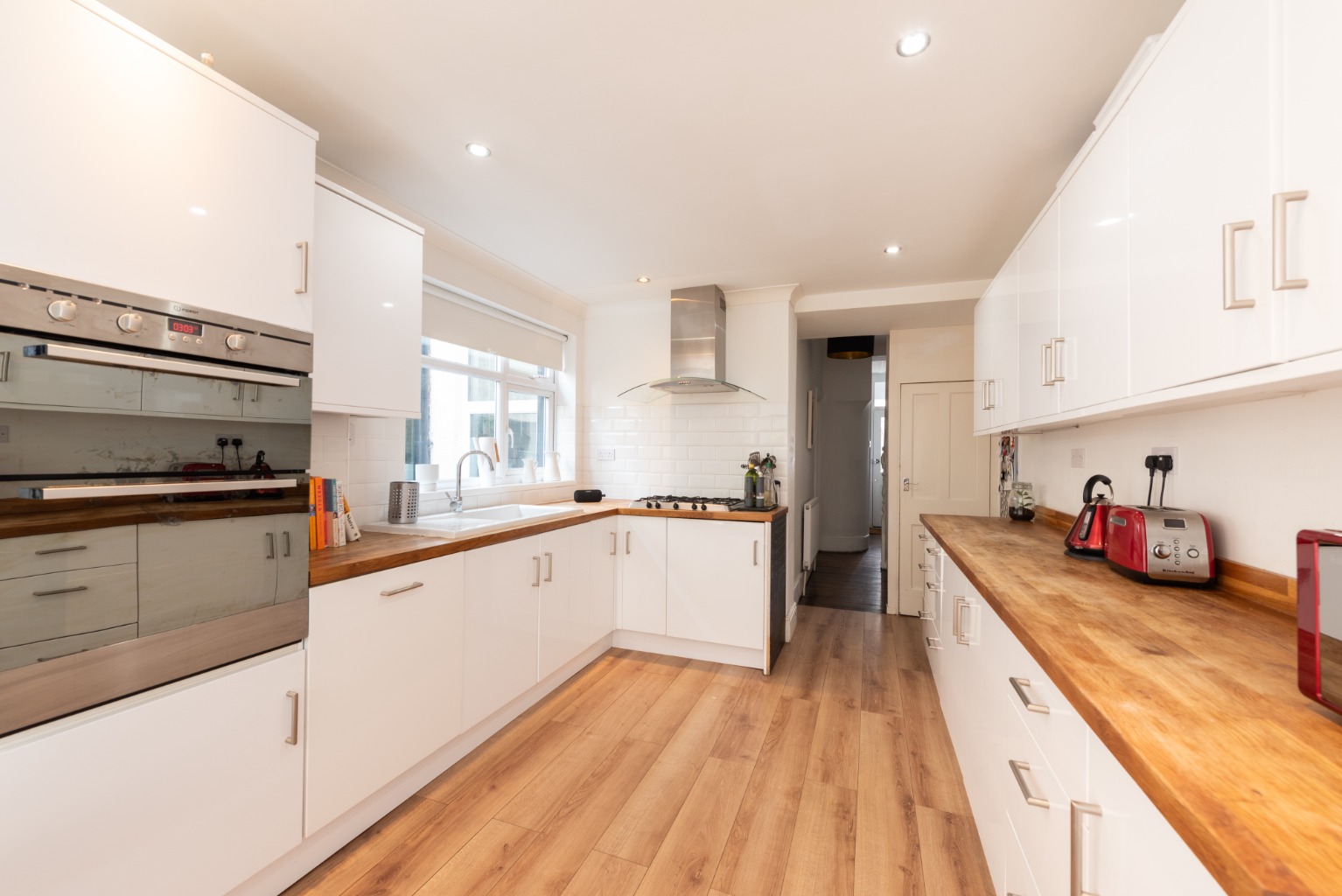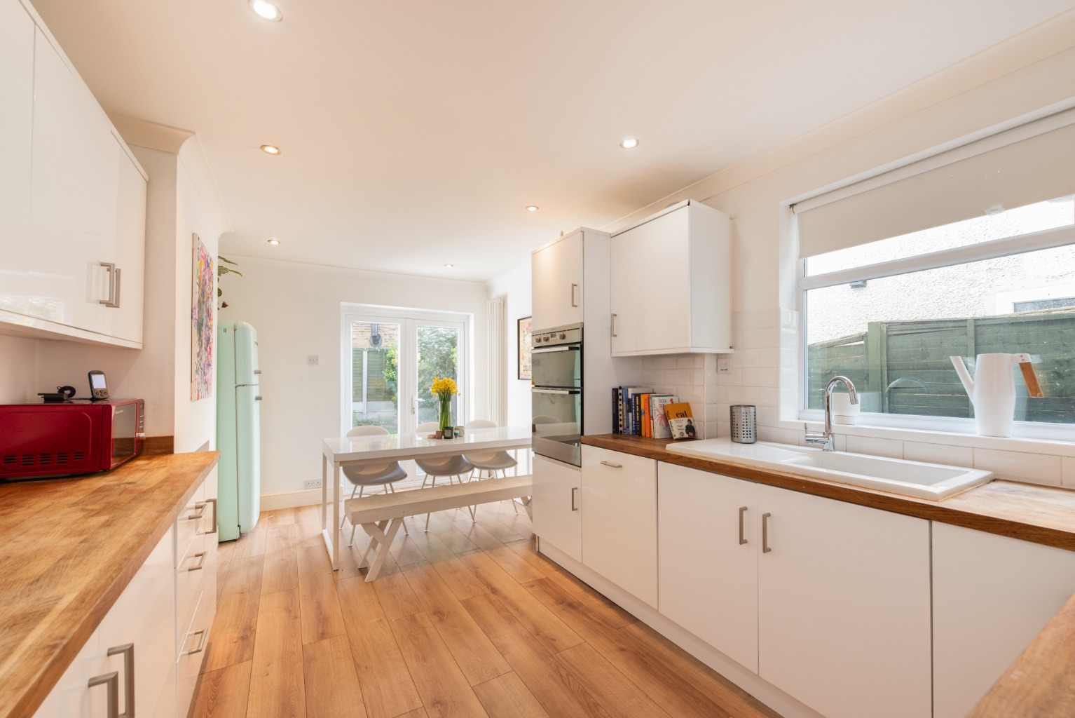 At the end of the hallway is the stylish kitchen-diner, which also provides access to the large storage cellar with power and lighting. The kitchen boasts a large array of base and wall cabinets in a white gloss finish with modern chrome handles, complemented by long runs of high quality solid timber worktops. There’s also a gas hob with a glass and stainless steel extractor above and a double, high level integrated oven. There’s a window to the side and the spacious dining area has French doors leading out to the rear garden. The southeast facing garden has a decked terrace leading to a lawned area and borders with mature shrubs.