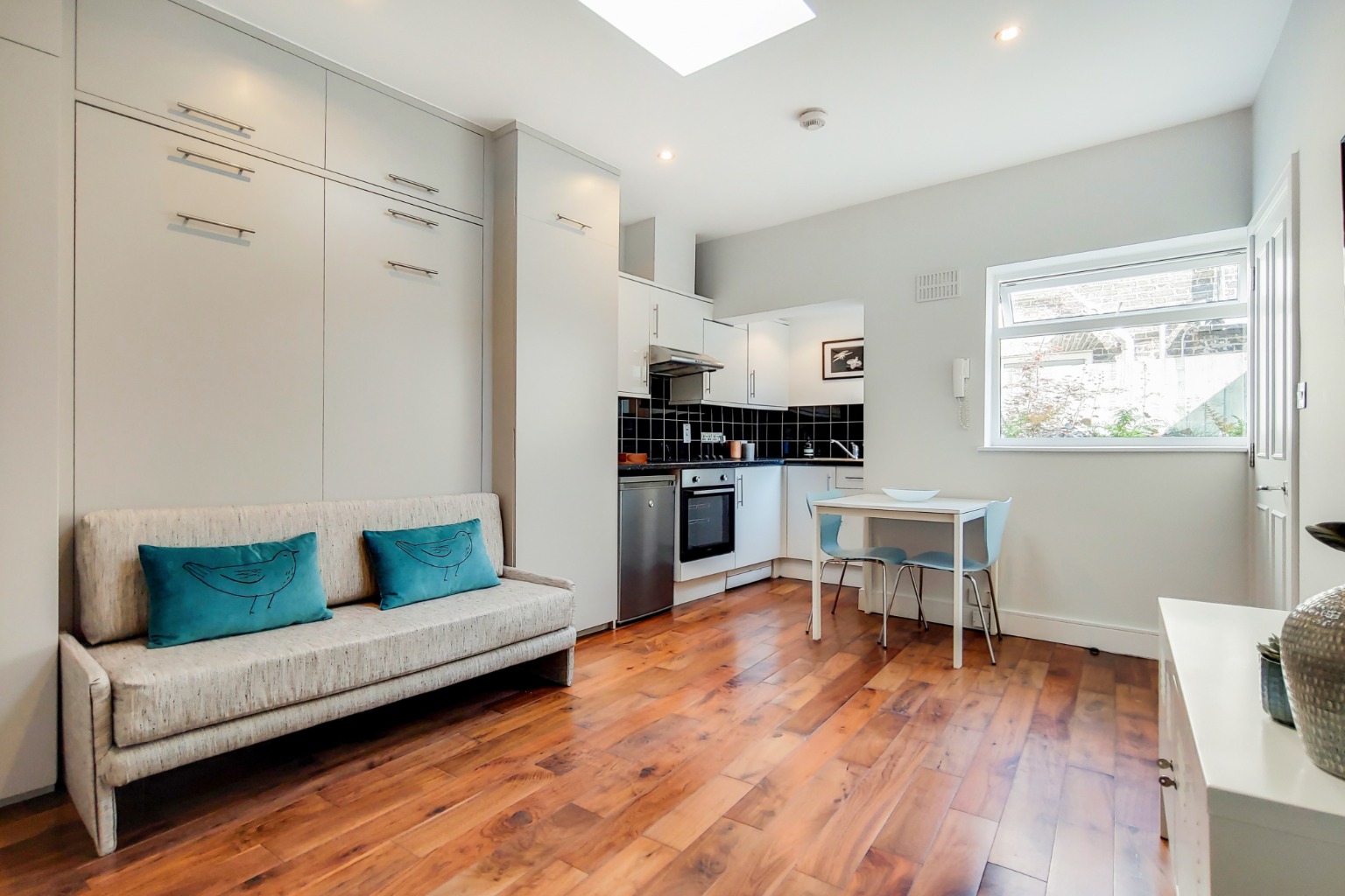 Victor Michael proudly presents this charming studio flat, which features a spacious studio room with a pull-down bed, a fully-fitted kitchen area, an entrance hallway, a three-piece bathroom, and a delightful patio area (please note, the patio is not demised). The layout of the flat is well-designed, offering ample living space and effective storage solutions, recently redecorated, featuring solid hardwood flooring and abundant natural light. Located at the rear of the building, there are no neighbors above or below, ensuring a peaceful living environment.
