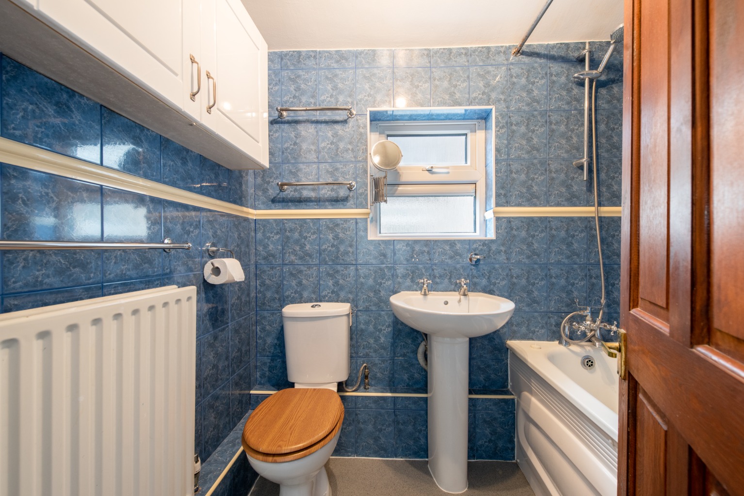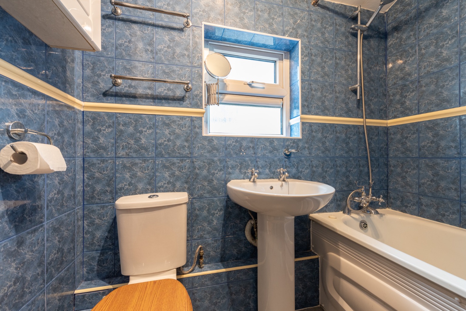 Returning to the landing, the next room is the family bathroom. The white three piece suite comprises a WC, pedestal handbasin and bath with shower above. There’s also a large wall mounted cabinet and a radiator. Walls have marble-effect blue tiles to full height and a dado rail is a nice design touch. There’s a window facing the side return and more dark grey vinyl for easy maintenance and cleaning.