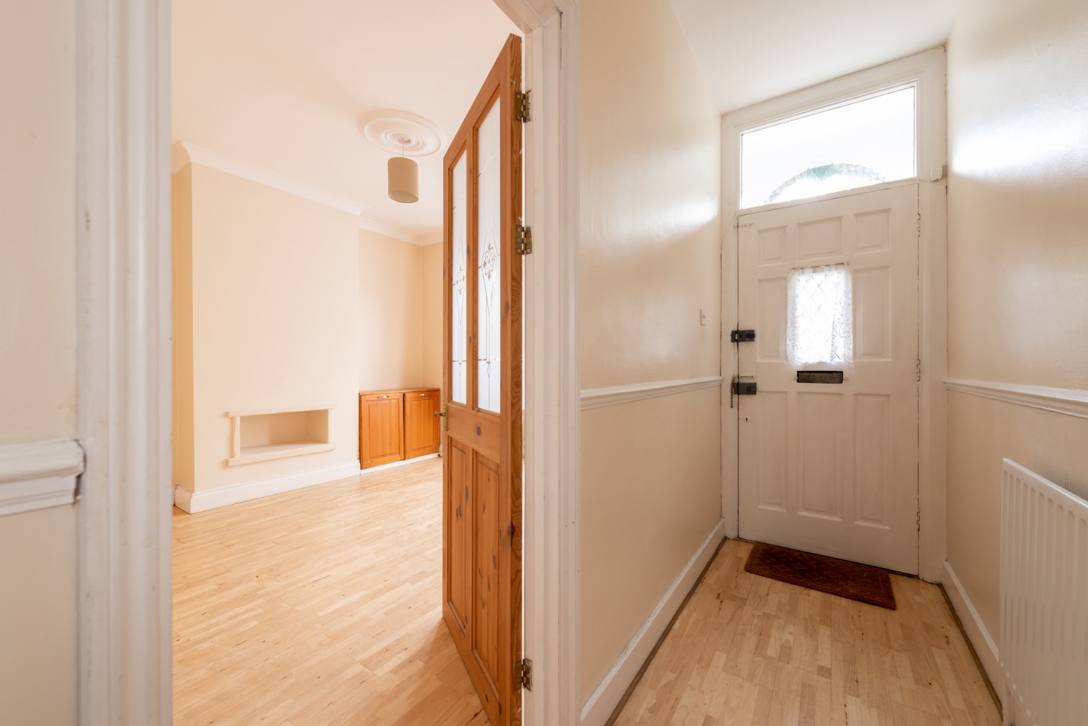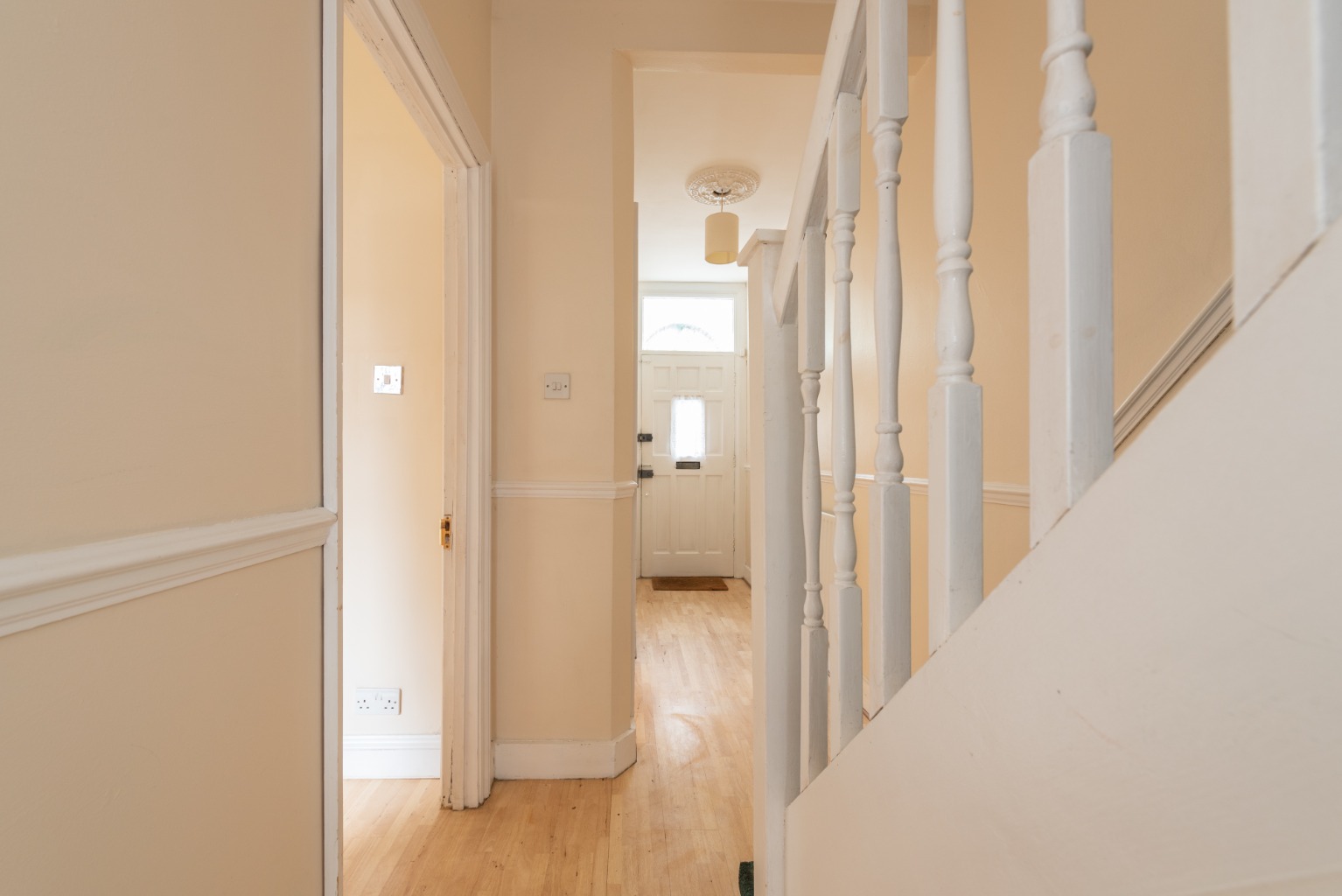 Through the front door, you enter the bright and roomy hallway, which benefits from natural light from the transom window above and the glazed door panel. Floors are a practical and attractive light oak laminate and walls are finished in a complementary warm cream, which runs throughout the house. Dado rails span the length of the hallway and run up the stairs to the landing. You’ll find plenty of space for coats and shoes, and there are two central heating radiators to ensure a cosy vibe as you enter your home.