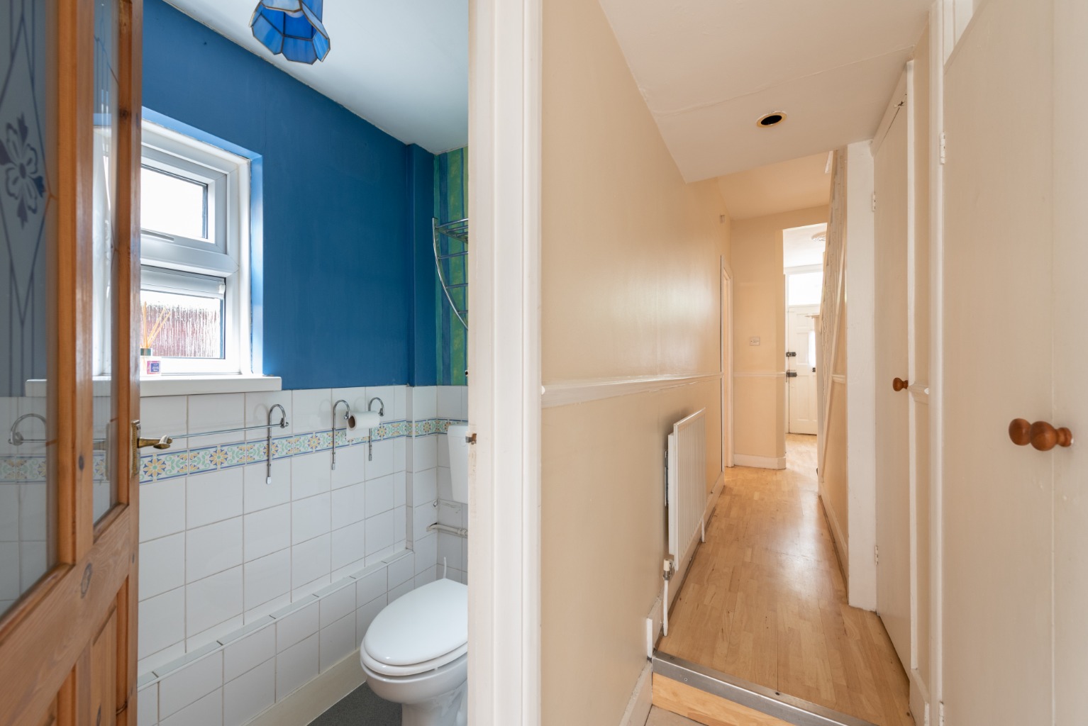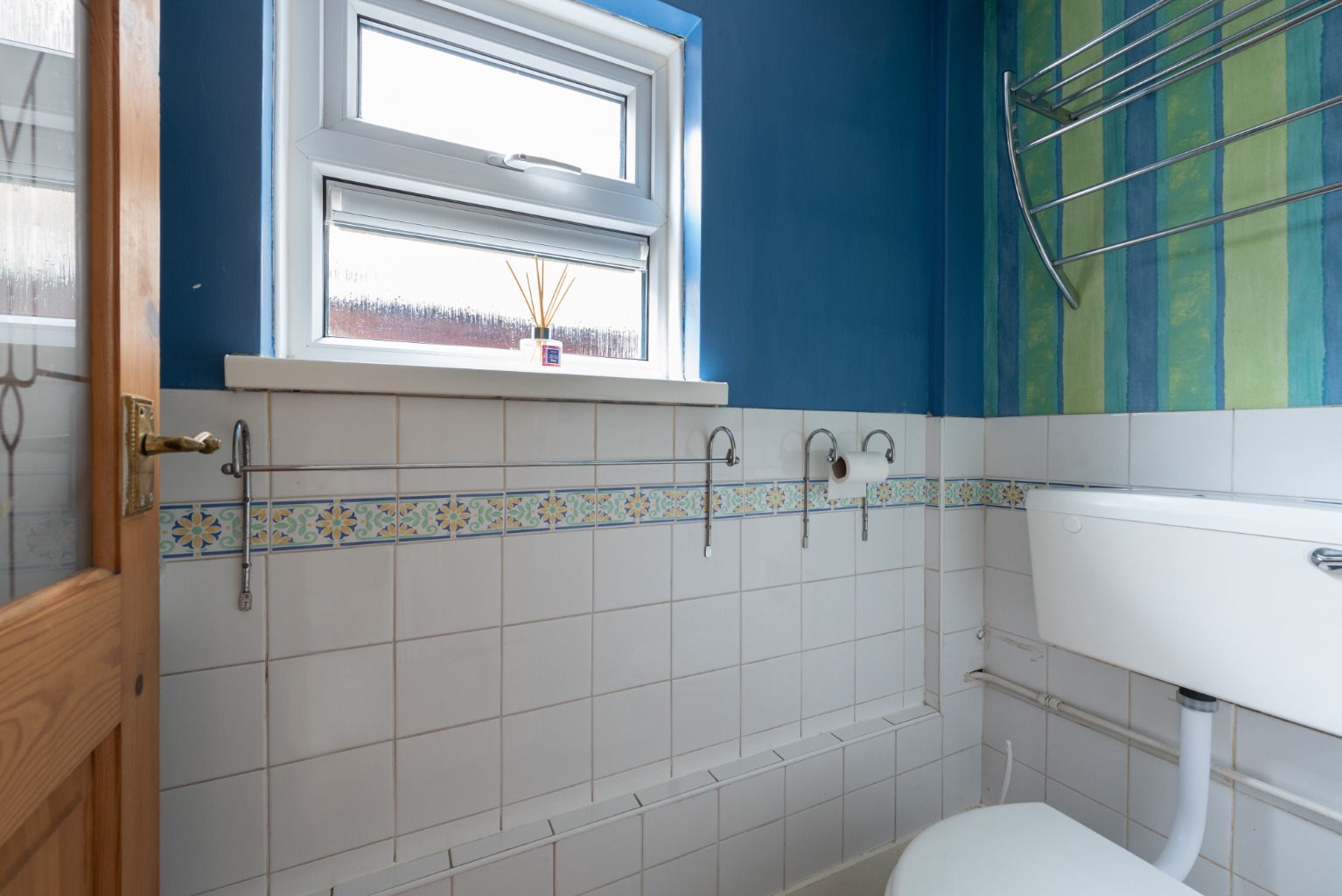 Returning to the hall, to the left are a series of doors, the first of which provides access to the useful cellar, with the rest being useful storage areas. To the right is the downstairs WC, a handy addition for a busy family. There’s a traditional style WC, a corner handbasin, along with white ceramic tiles to the lower part of the wall, highlighted by a colourful tiled border. The upper parts of the wall are a combination of blue paint and a feature wallpaper in green and blue. The floor is a practical vinyl in dark grey and there’s an obscured glass window.