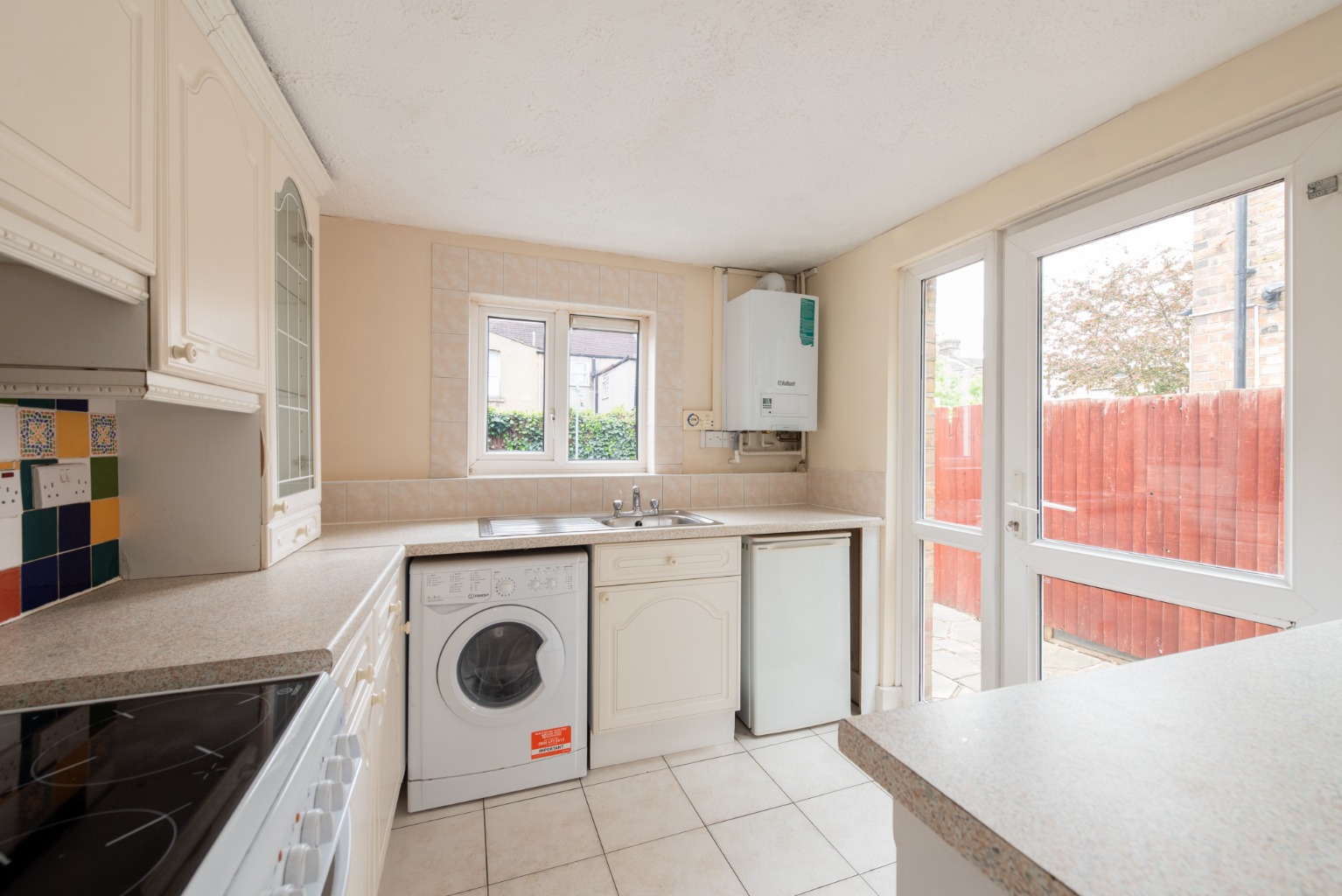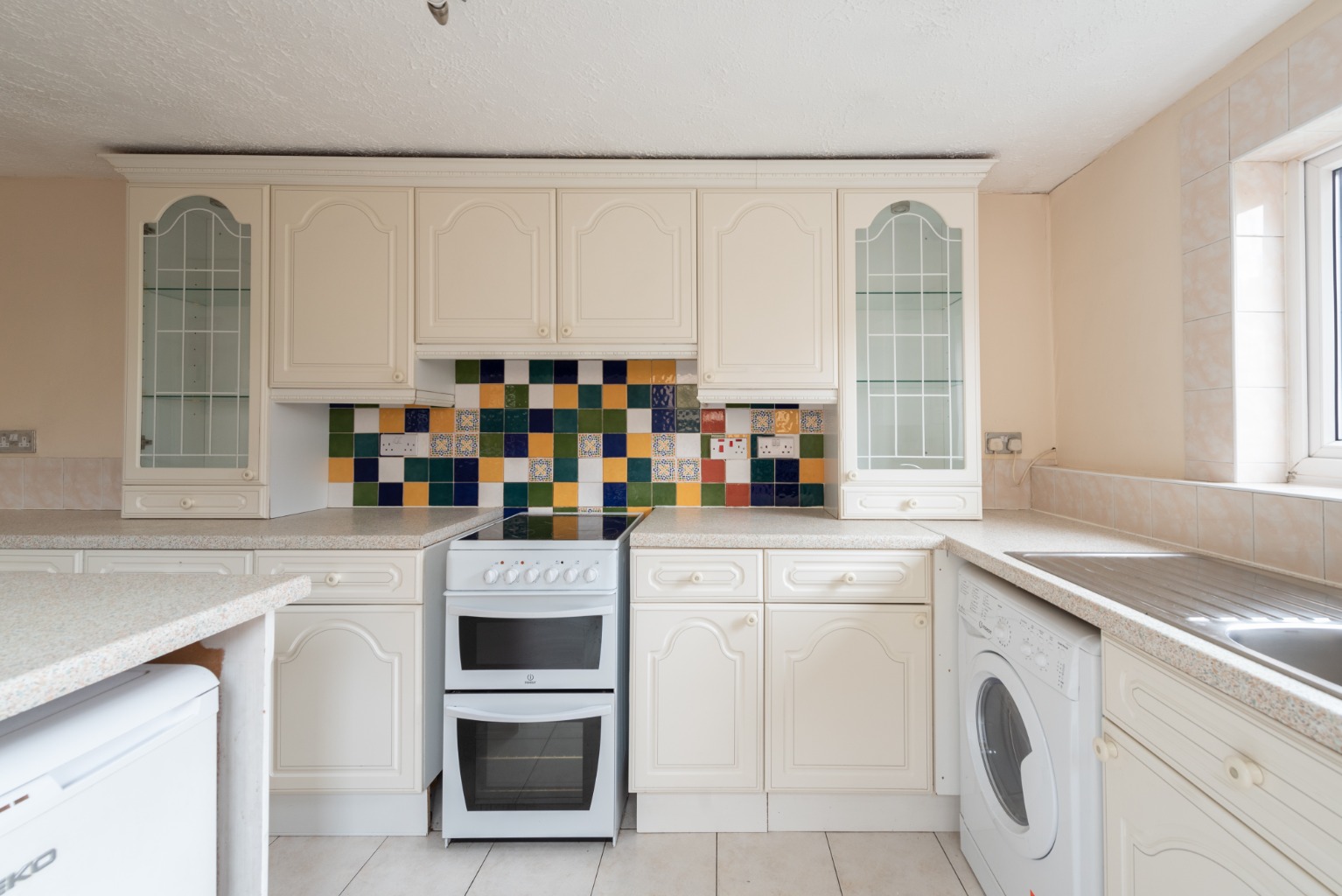 Back to the hall now and into the large, bright kitchen. With two windows and a fully glazed door with adjacent glazed panel, there’s an abundance of natural light, making this an energising space to whip up your favourite meals. There are long runs of cream coloured base and wall cabinets with raised panel details, some of which also have glazed panels as an additional design element. Worktops are a light granite effect and there’s also space for an under counter fridge and freezer. There’s a free standing cooker and hob, plumbed in space for a washing machine and dishwasher and a stainless steel sink. The modern gas boiler is also located in this area and there’s a large radiator for the colder months. There are colourful tiled splashbacks and the floor is laid in stone effect ceramic tiles.