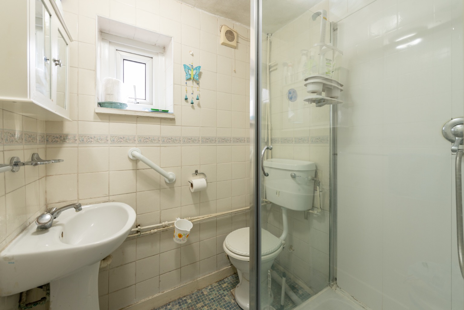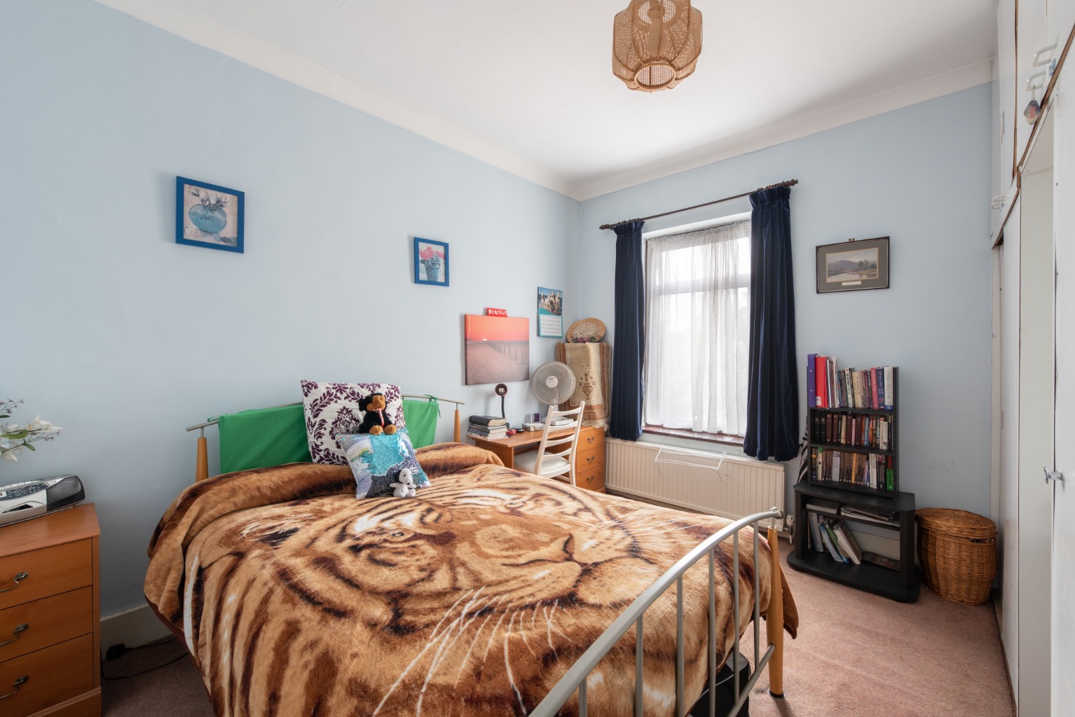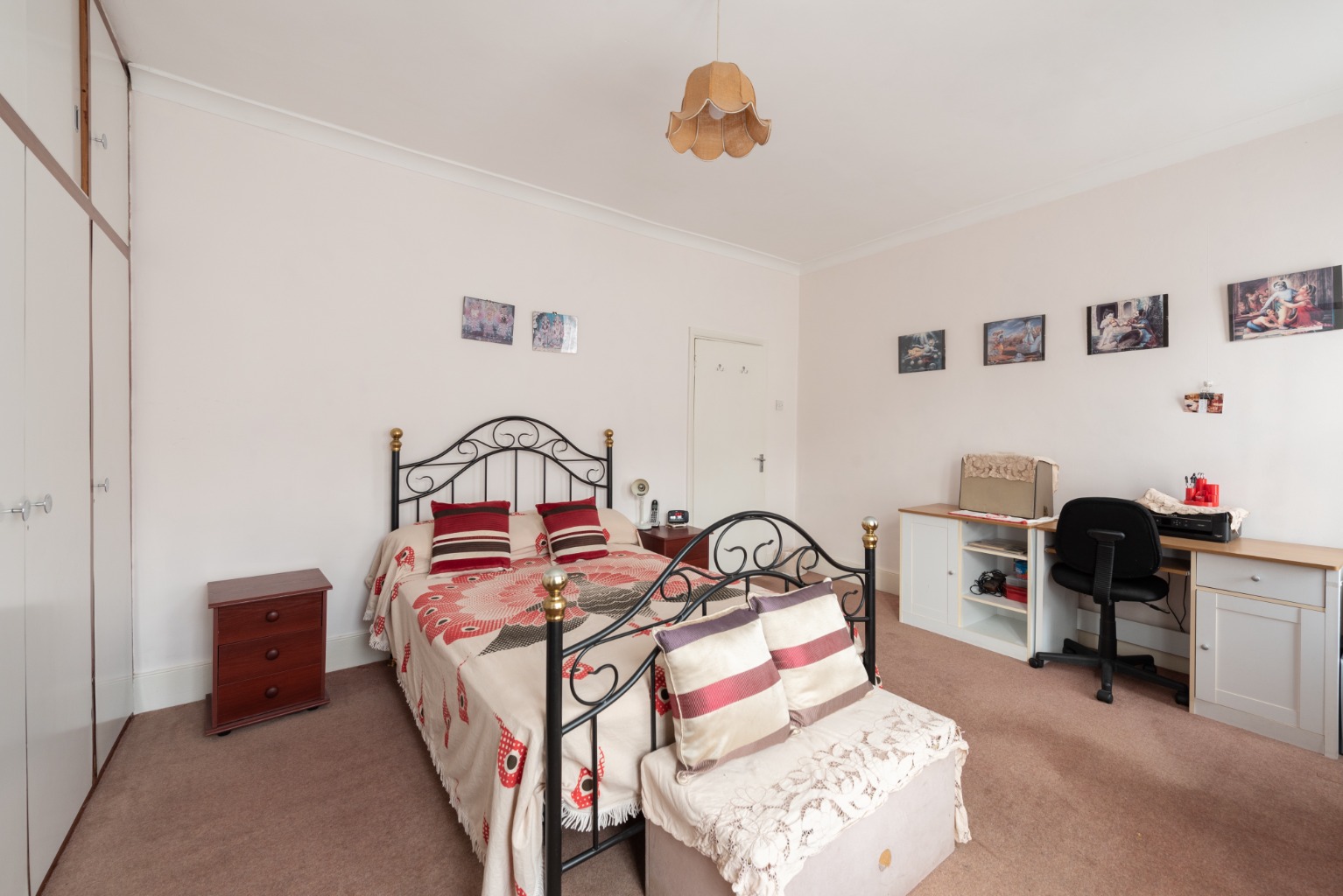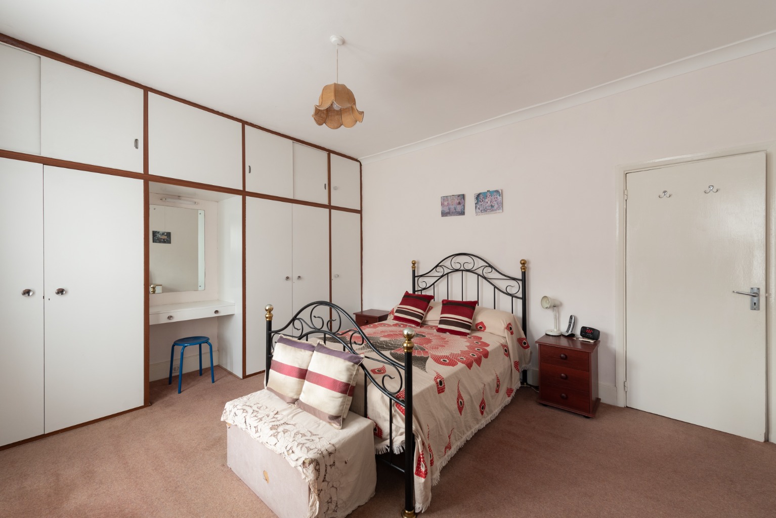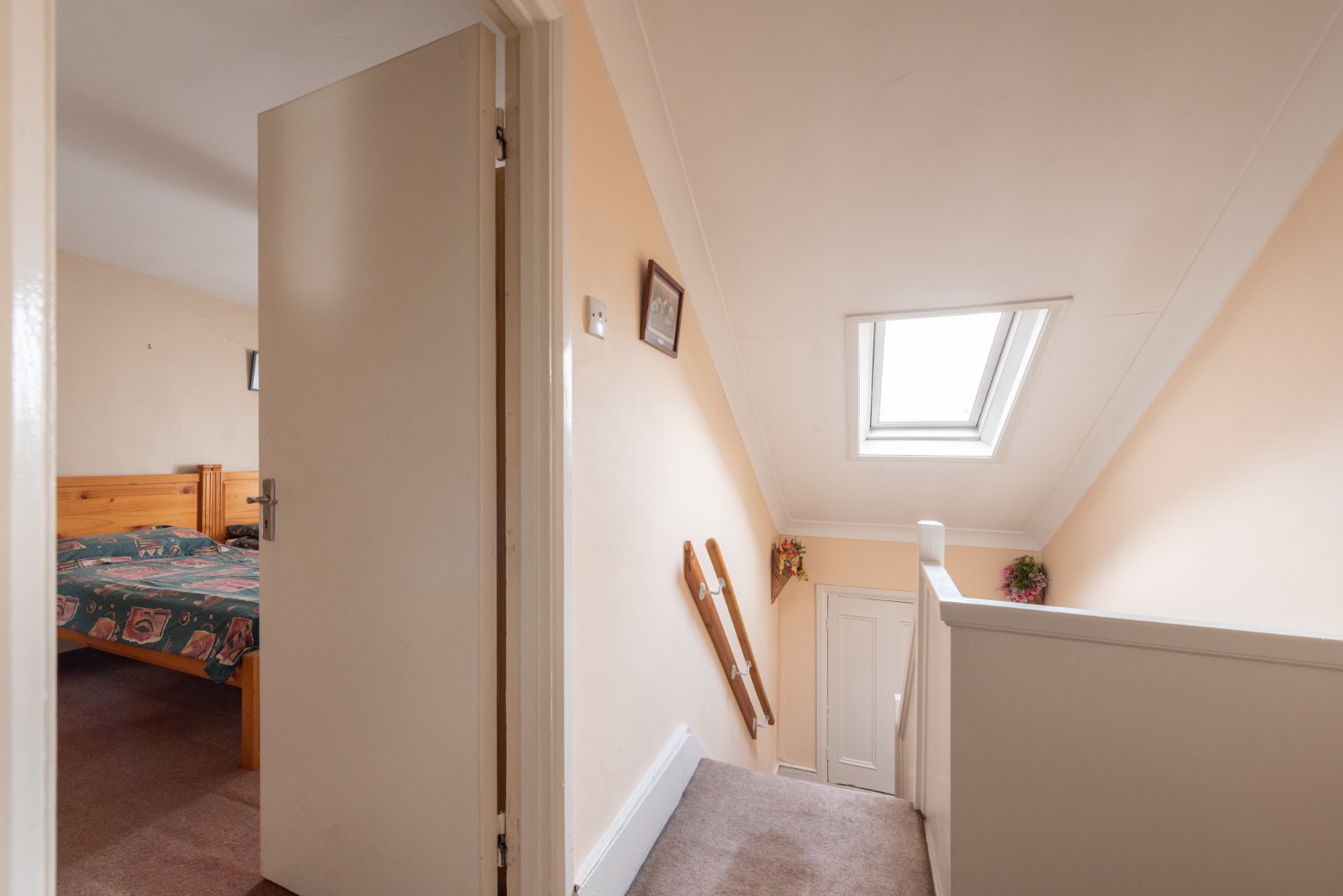 Into bedroom three first, which is currently set up as a large single room. This could easily be used as a double room, with room for a double bed, bedside cabinets, a wardrobe and additional storage furniture. It would also make an ideal child’s bedroom or study. With a small section of the end of the room having a sloping ceiling and the window being slightly lower set, this room has the feel of a cosy country cottage, without losing any of the practicality. The walls are painted in a pastel mint green colour with the same dark russet carpet as the staircase, which features in all the bedrooms, landing areas and stairs on the upper floors. Returning to the landing, to the right is the shower room. There’s a white three piece suite, comprising of a WC, a pedestal hand basin, with mirrored cabinet above and a glass enclosed shower cubicle. There are floor to ceiling white ceramic tiles and a mosaic tiled floor. There’s also natural light courtesy of a modern uPVC window. Up a few steps now to the second level of the landing, where the first door to the right takes us into bedroom two. This is a good sized double room featuring built in wardrobes and dressing table. There’s a large window facing the quiet rear garden with a large radiator below to guarantee a peaceful, comfortable night’s sleep. Walls are painted in a light blue which further enhances the sense of light. The final room on this level is the impressive main bedroom. Occupying the full width of the house and having two sets of large windows, this is a delightfully spacious and bright room. There’s a large run of built-in wardrobes, which also incorporates a dressing table and full width storage above. There’s still room for a large double bed, bedside cabinets and additional furniture, perhaps including a comfortable armchair to enjoy the sunny aspect, read a good back or just watch the world go by on the street below. Back onto the landing now and up the stairs to the second floor. On the half landing, there’s a useful storage cupboard and a skylight which provides natural light down to the first floor and up to the second, which has room for a desk or would make a cosy reading nook.