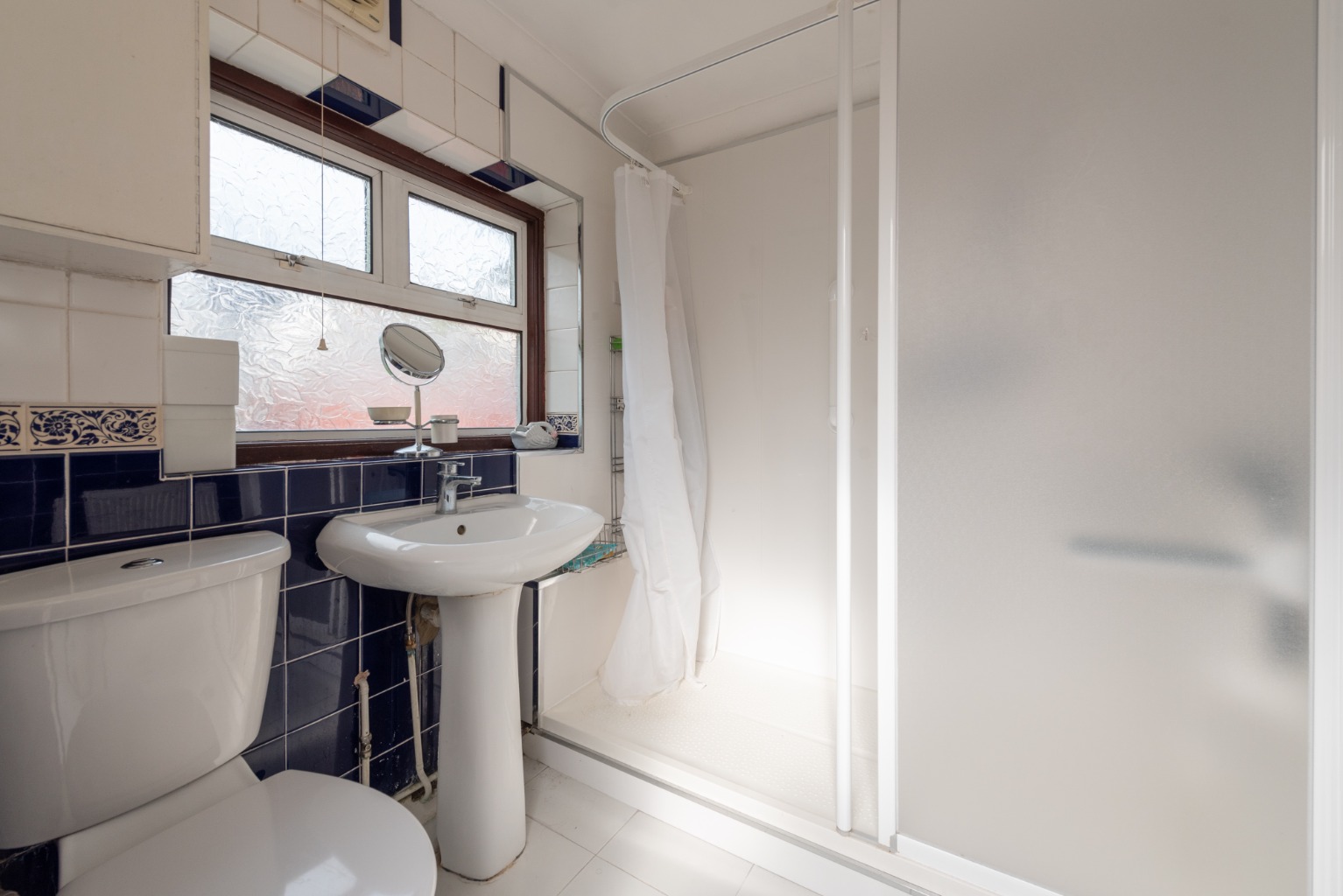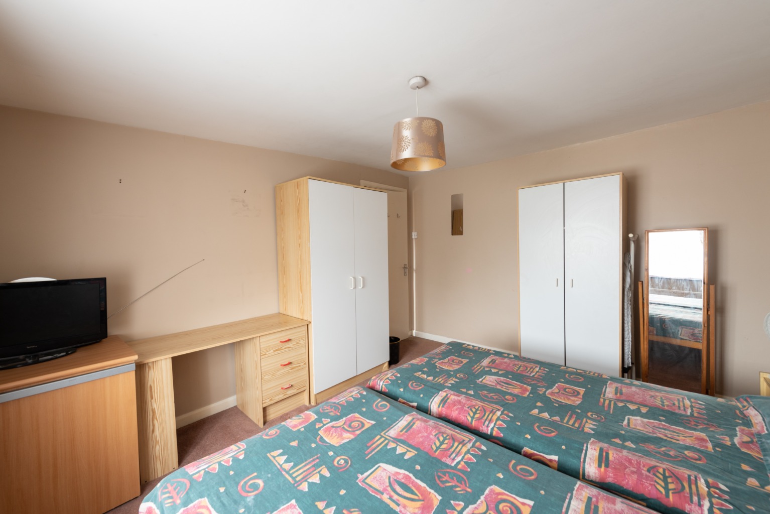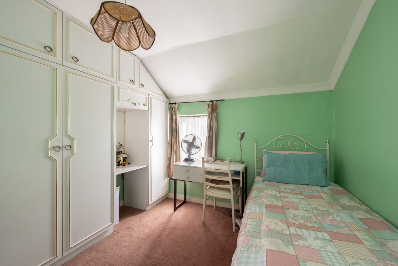 The first door to the right takes us into bedroom four, which has a full width dormer, making it another generous sized room. A large double bed will fit easily in here, with plenty of space left for wardrobes, chests of drawers, bedside cabinets, a dressing table and a desk. The large window with radiator below brings in lots of natural light which is nicely diffused by the coffee coloured walls. This room could be an ideal teenager’s room or equally would make a perfect parent’s retreat away from the daily hustle and bustle. The final room on this floor is a large storage room, which has built in cupboards and also houses the water tank. Subject to the necessary approvals there might be scope here for alternative uses such as an additional bathroom, playroom or study.