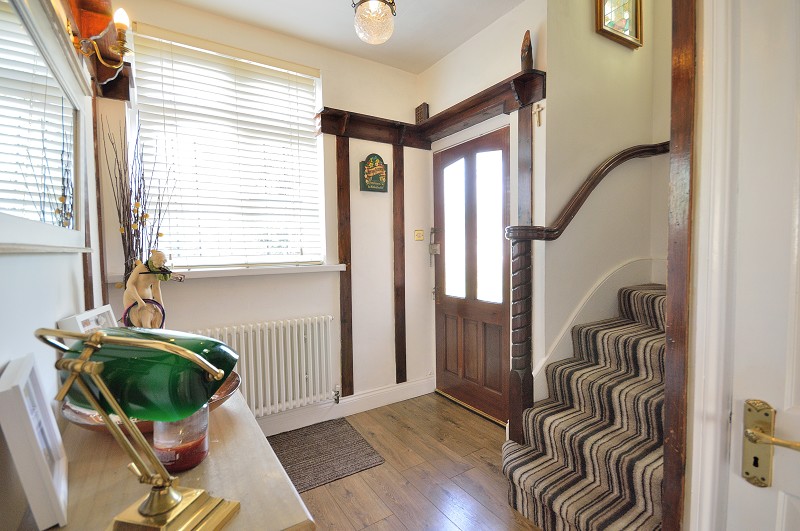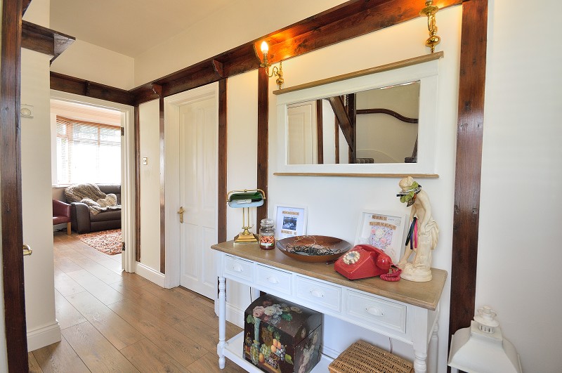 HALLWAY: Timber effect flooring. UPVC double glazed window to front aspect. Wooden panels and mantle. Ceiling rose. Radiator. Stairs with ornate newel leading to first floor. Under stair cupboard Doors to all rooms.